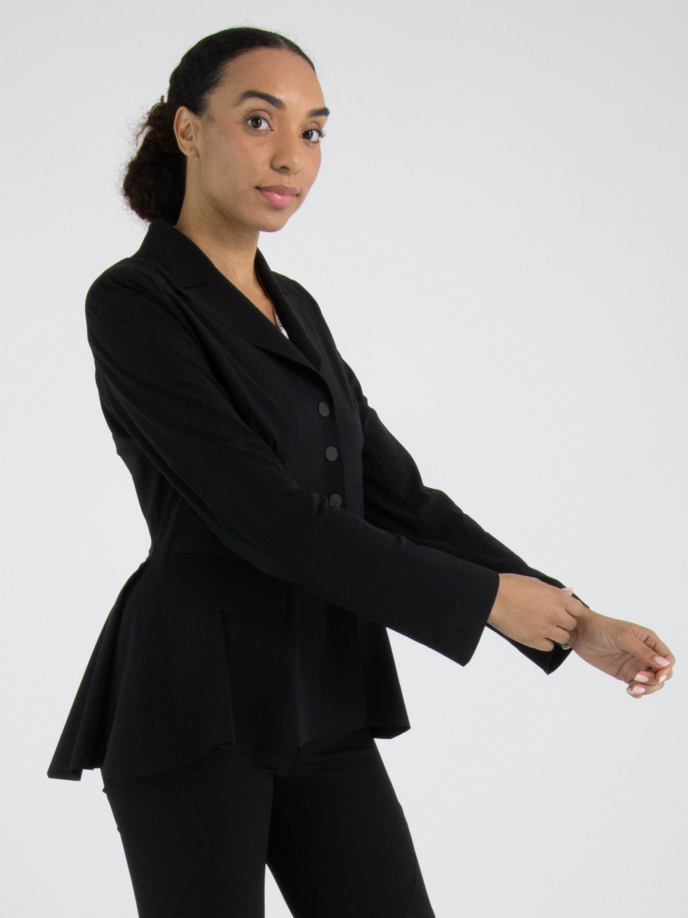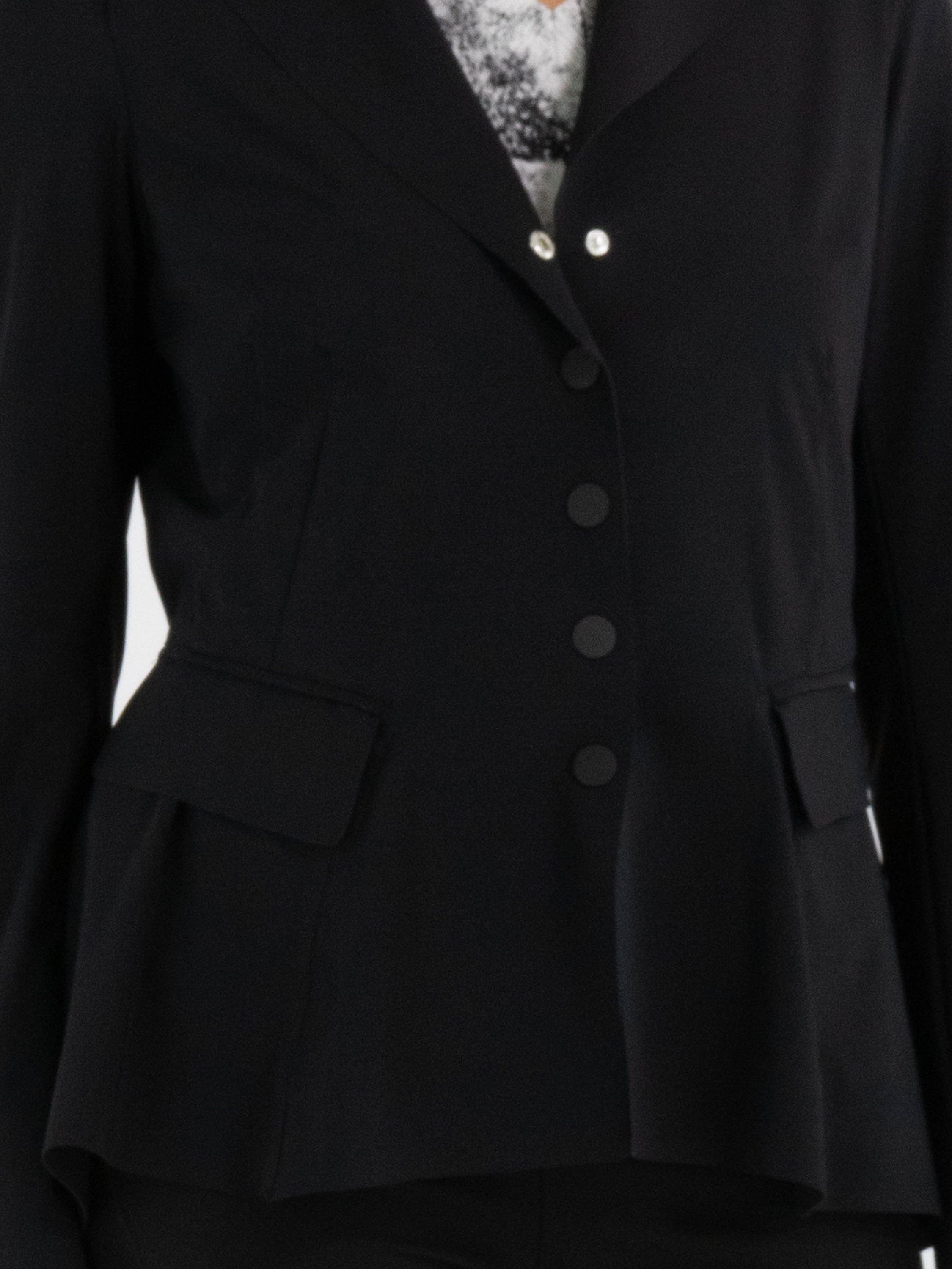 Een blazer van High Tech in een zwarte kleur. De blazer heeft een sluiting met 5 drukknopen. Aan de achterkant is ter hoogte van de taille een stiknaad, van waaruit de stof naar beneden golvend is geplooid en waarboven meerdere taillenaden lopen. De blazer is ongevoerd en mag op de hand worden gewassen.