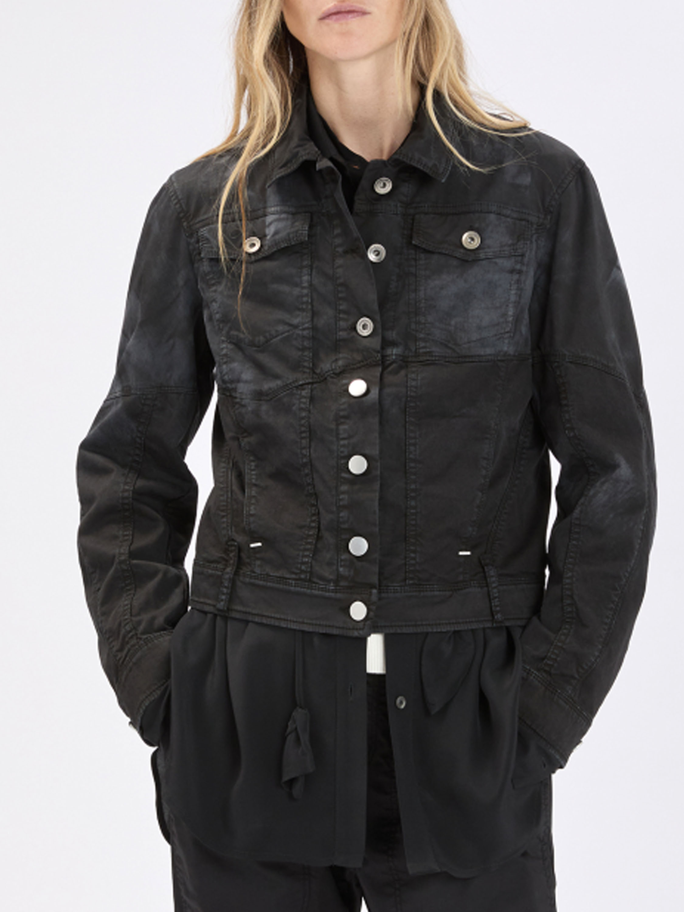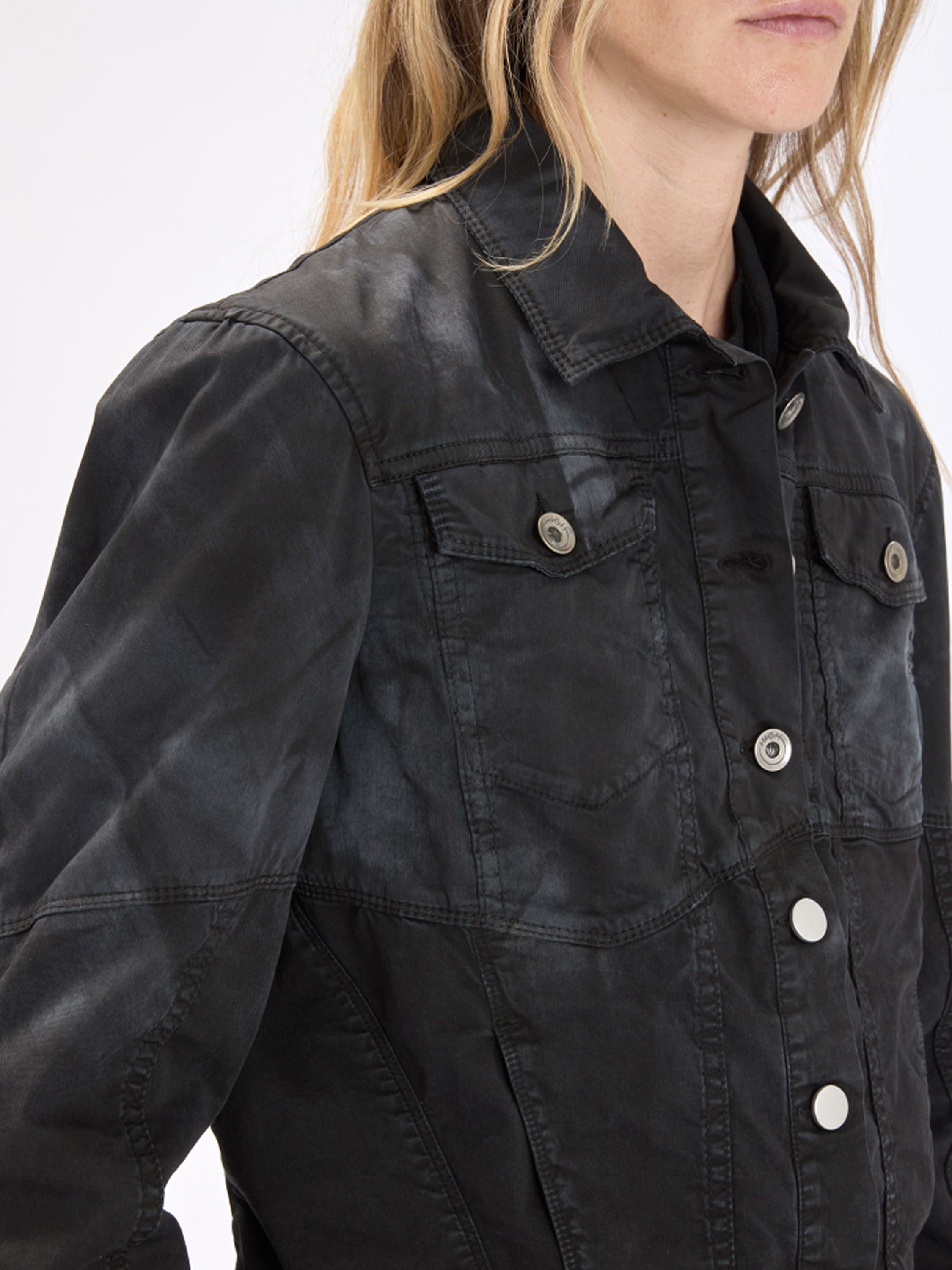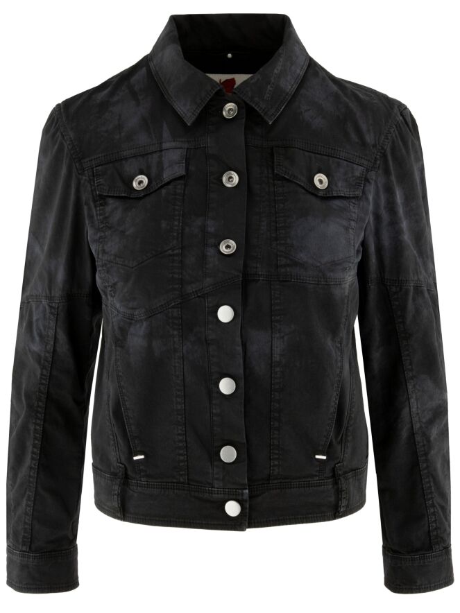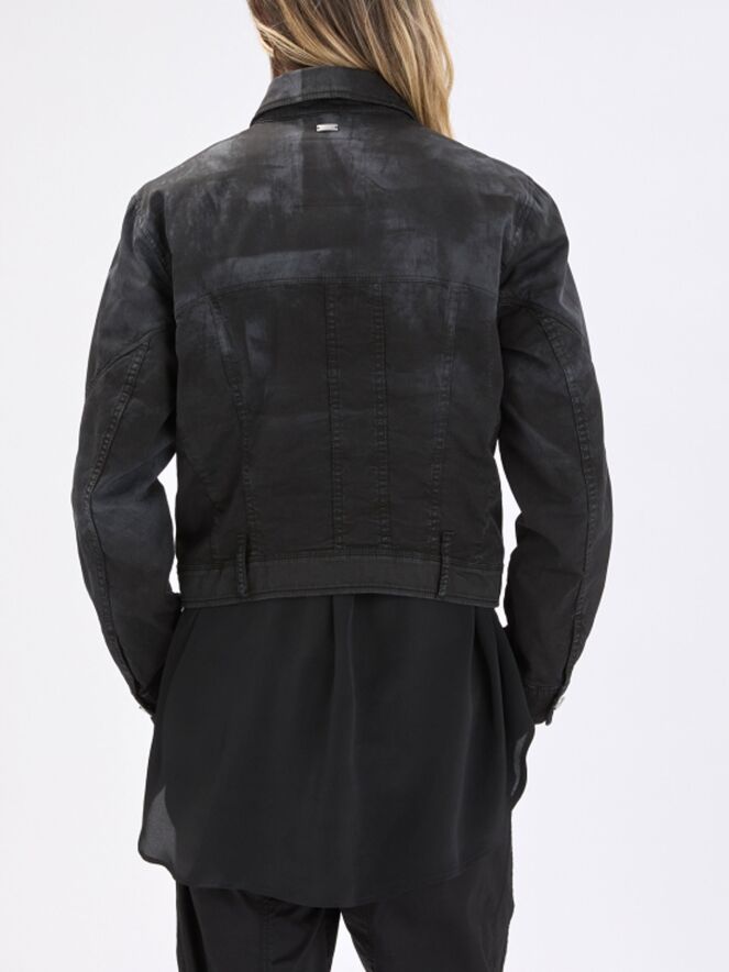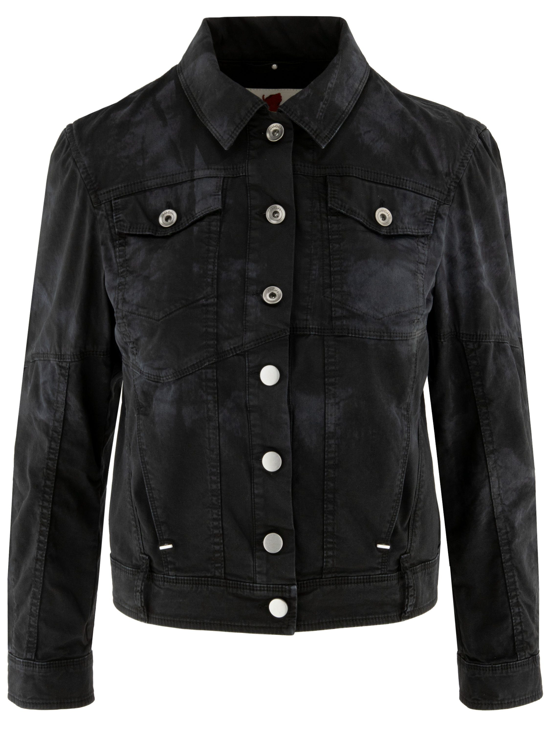 Korte jeansblazer van High in een gevlekte ton-sur-ton print in meerdere zwarte tinten. De blazer sluit met knopen en heeft steekzakken ter hoogte van de taille. Het model heeft een eigentijdse en nonchalante uitstraling. Deze blazer kan op 30 graden worden gewassen.