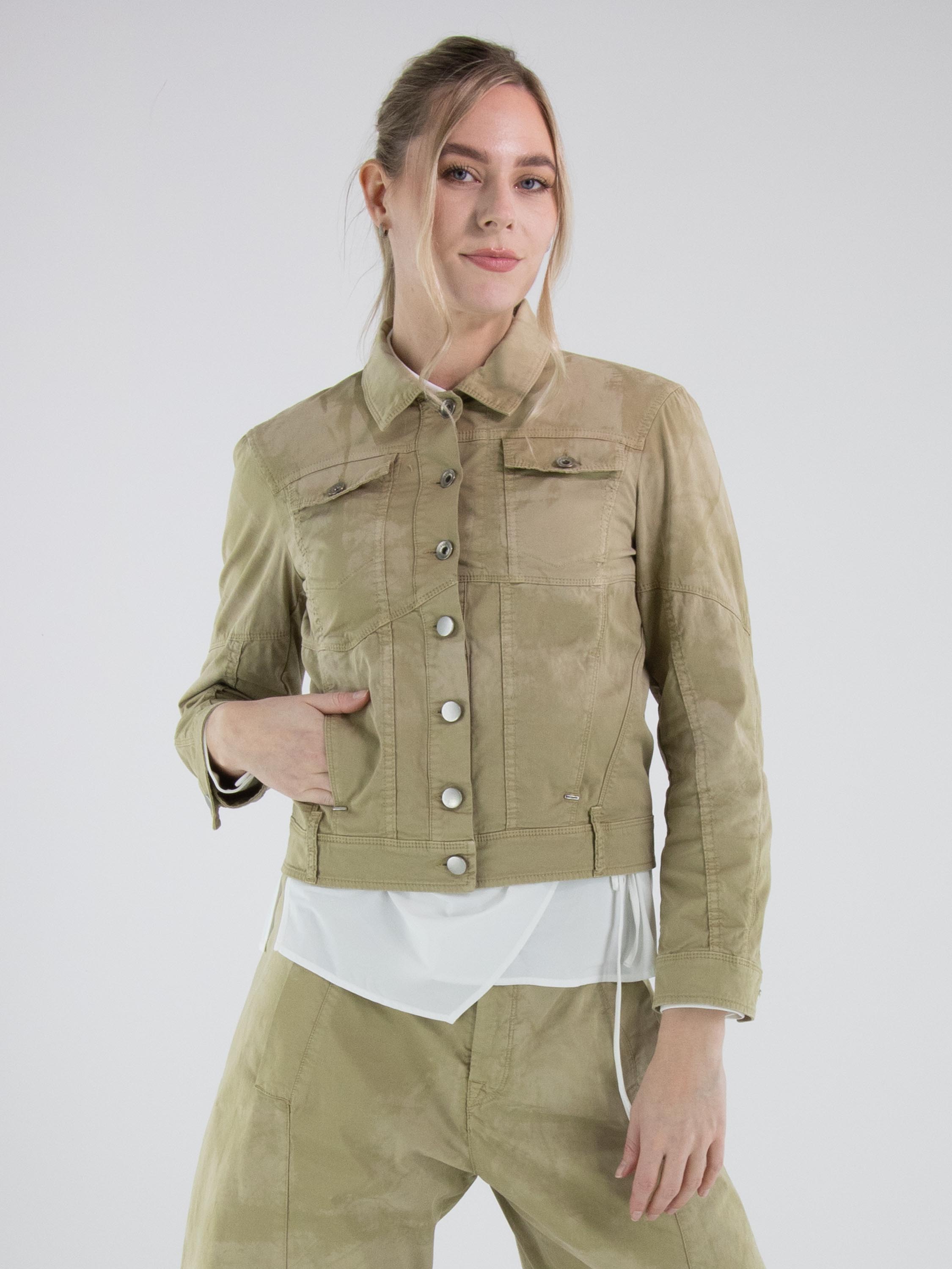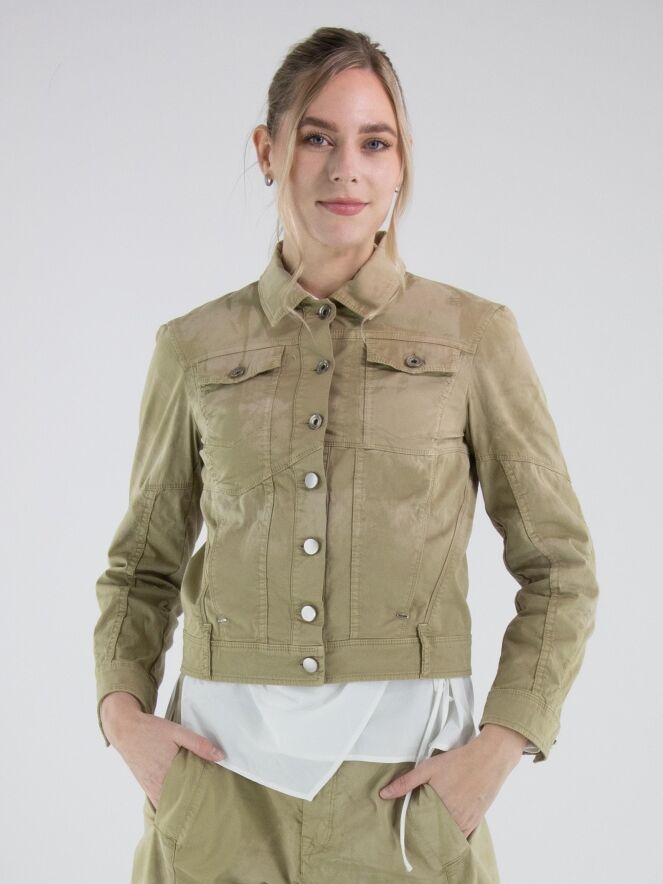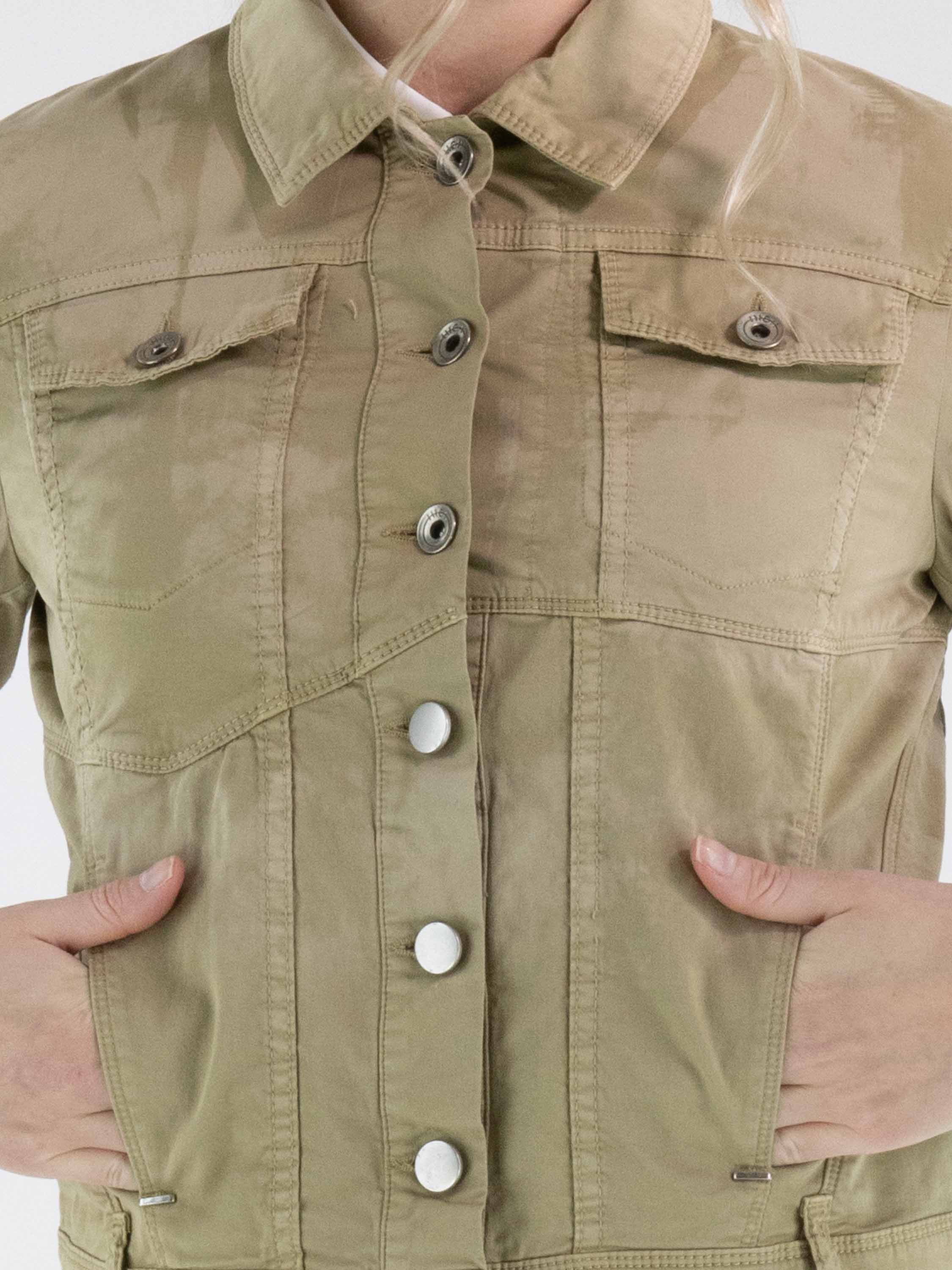 Korte jeansblazer van High in een gevlekte ton-sur-ton print met meerdere olijfgroene tinten. De blazer sluit met knopen en heeft steekzakken ter hoogte van de taille. Het model heeft een eigentijdse en nonchalante uitstraling. Deze blazer kan op 30 graden worden gewassen.