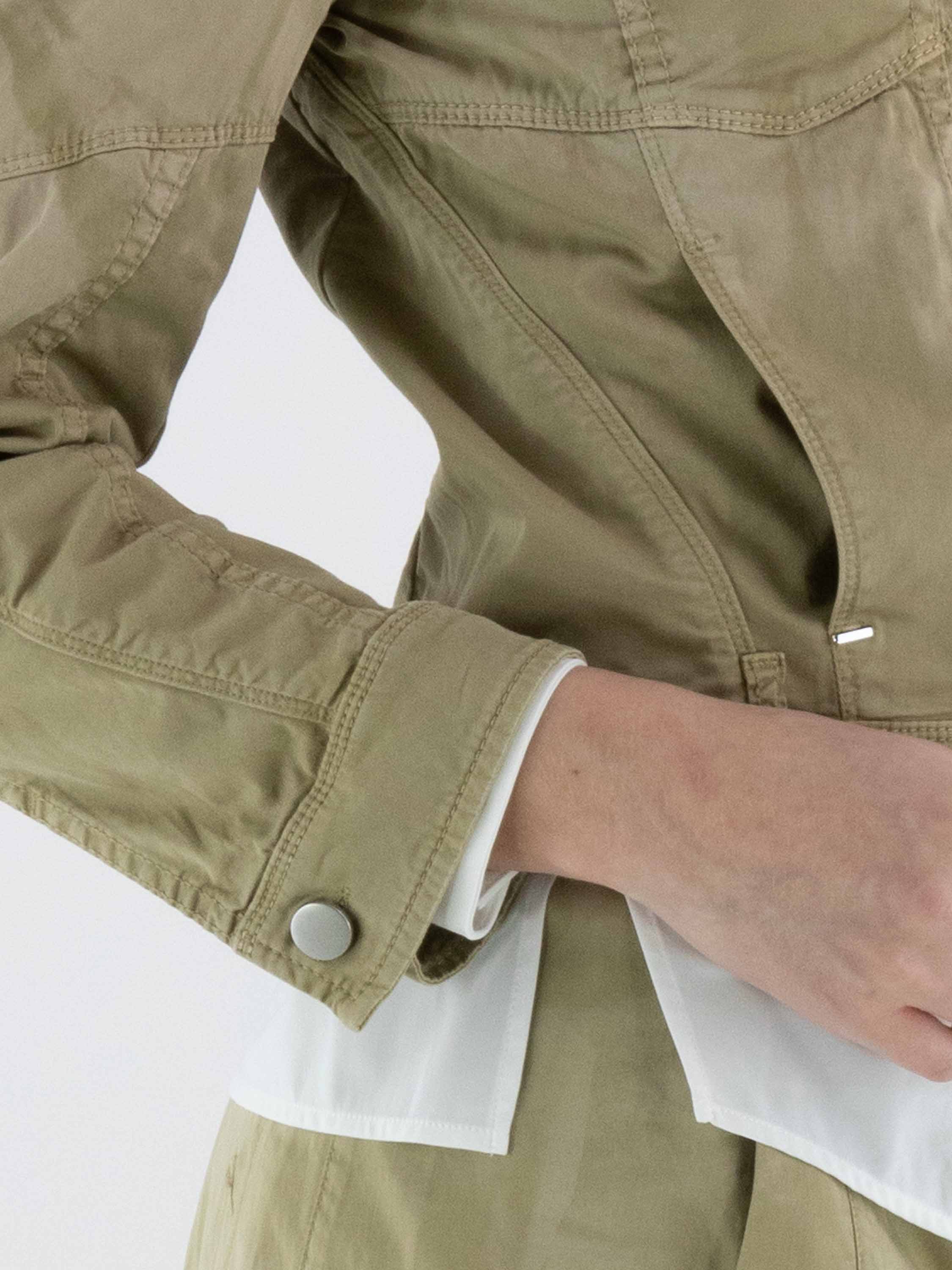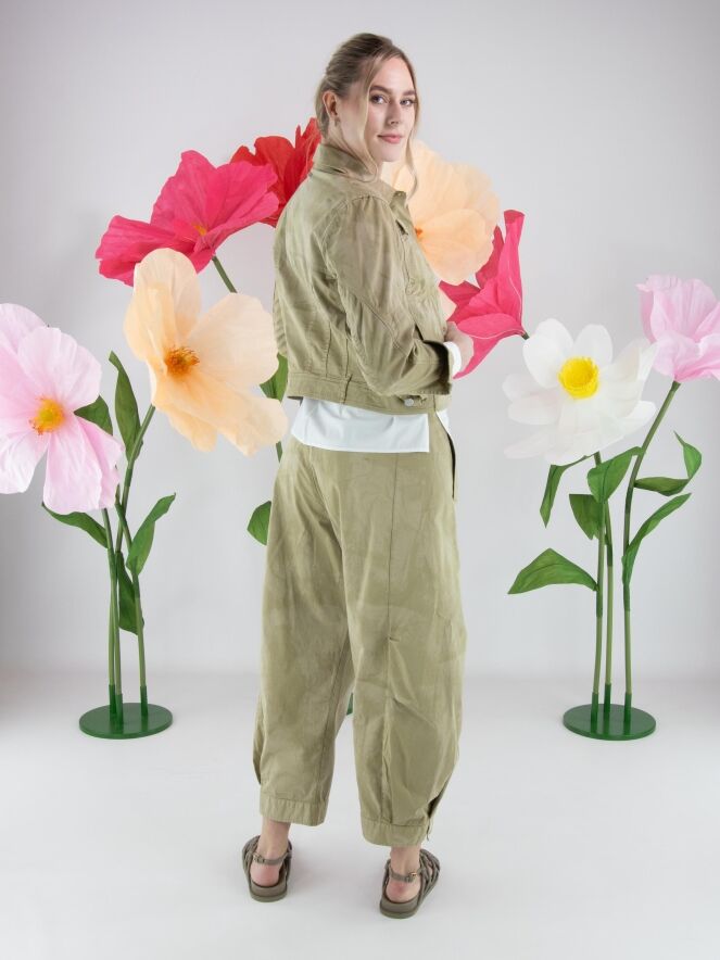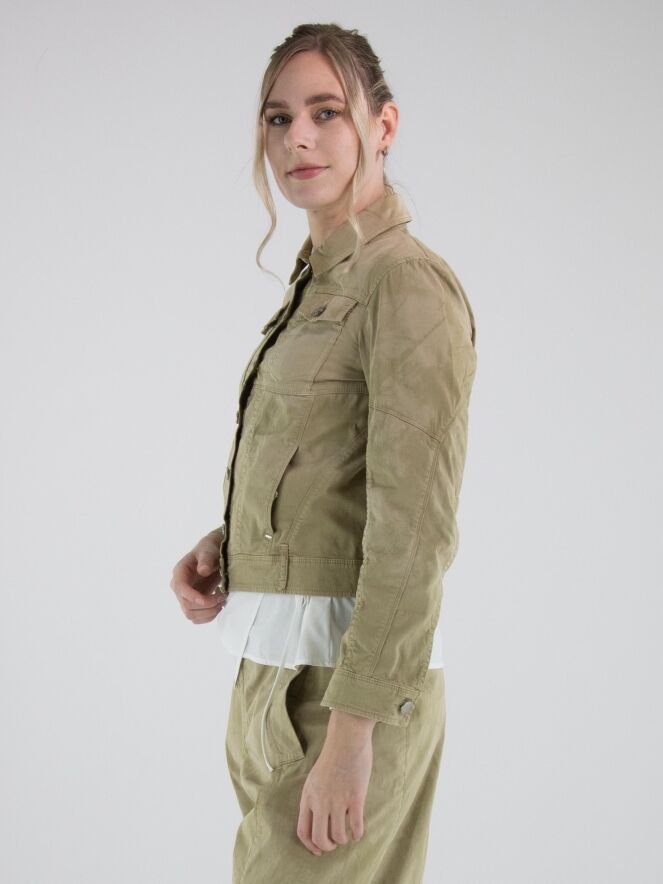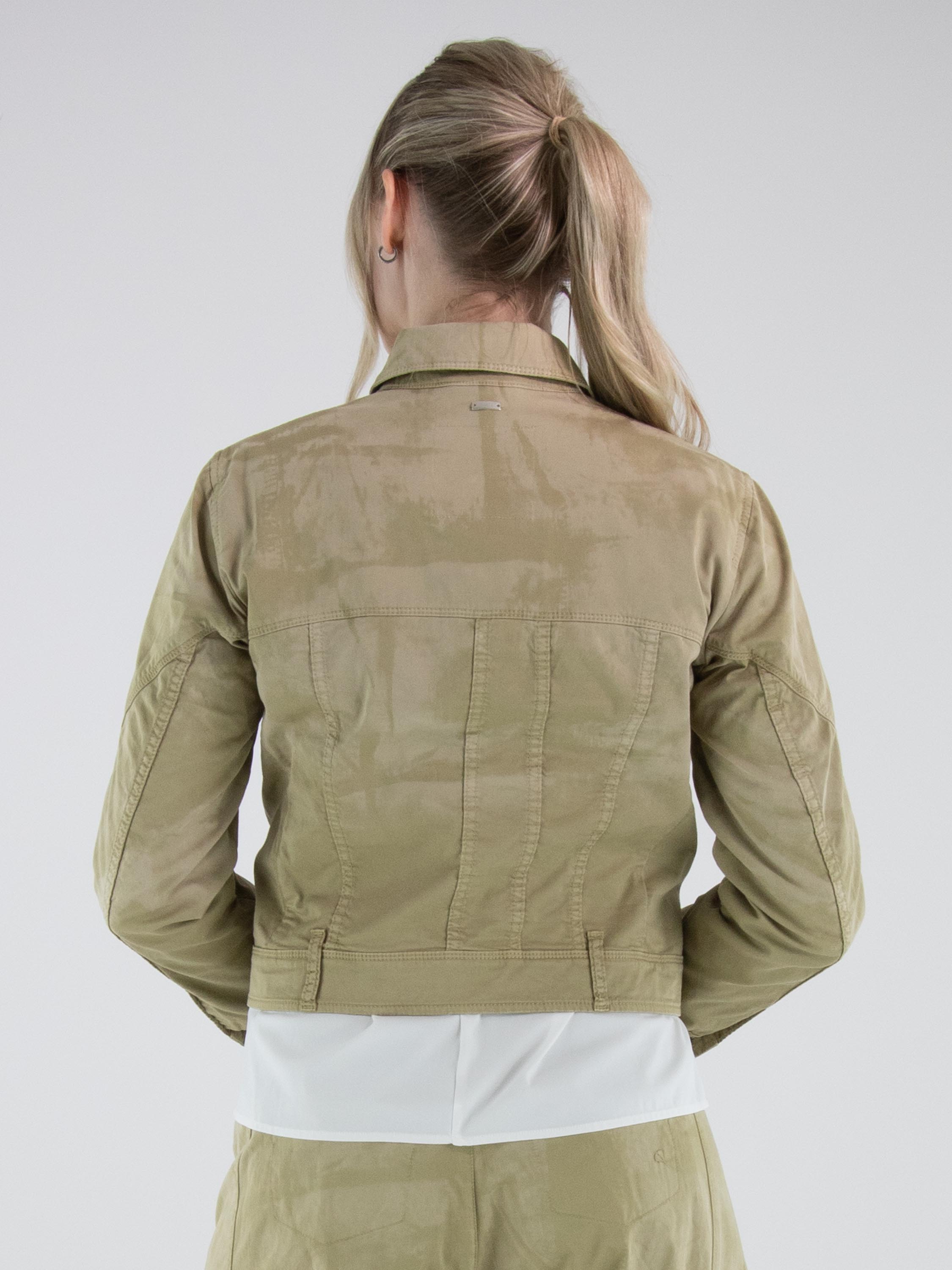 Korte jeansblazer van High in een gevlekte ton-sur-ton print met meerdere olijfgroene tinten. De blazer sluit met knopen en heeft steekzakken ter hoogte van de taille. Het model heeft een eigentijdse en nonchalante uitstraling. Deze blazer kan op 30 graden worden gewassen.
