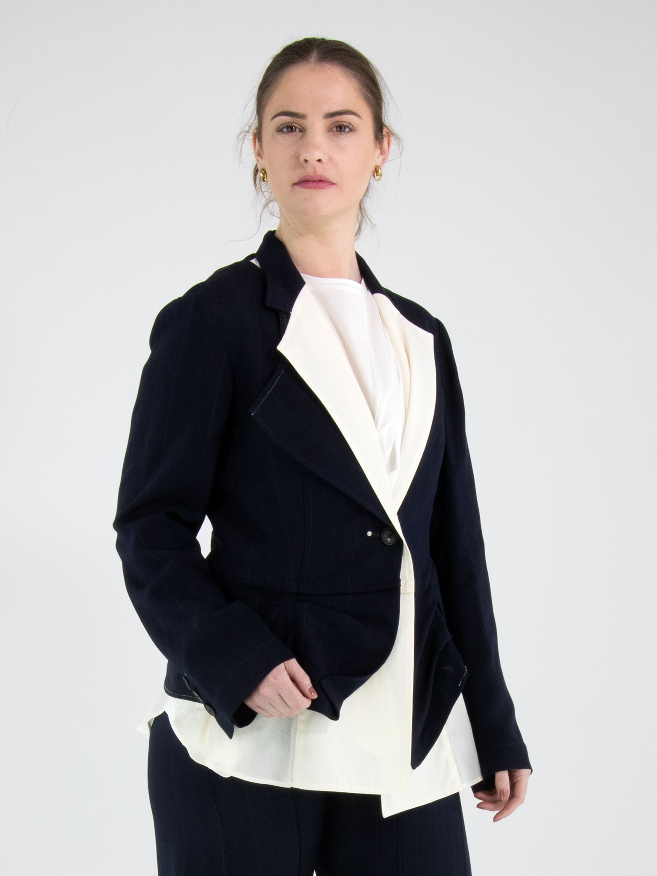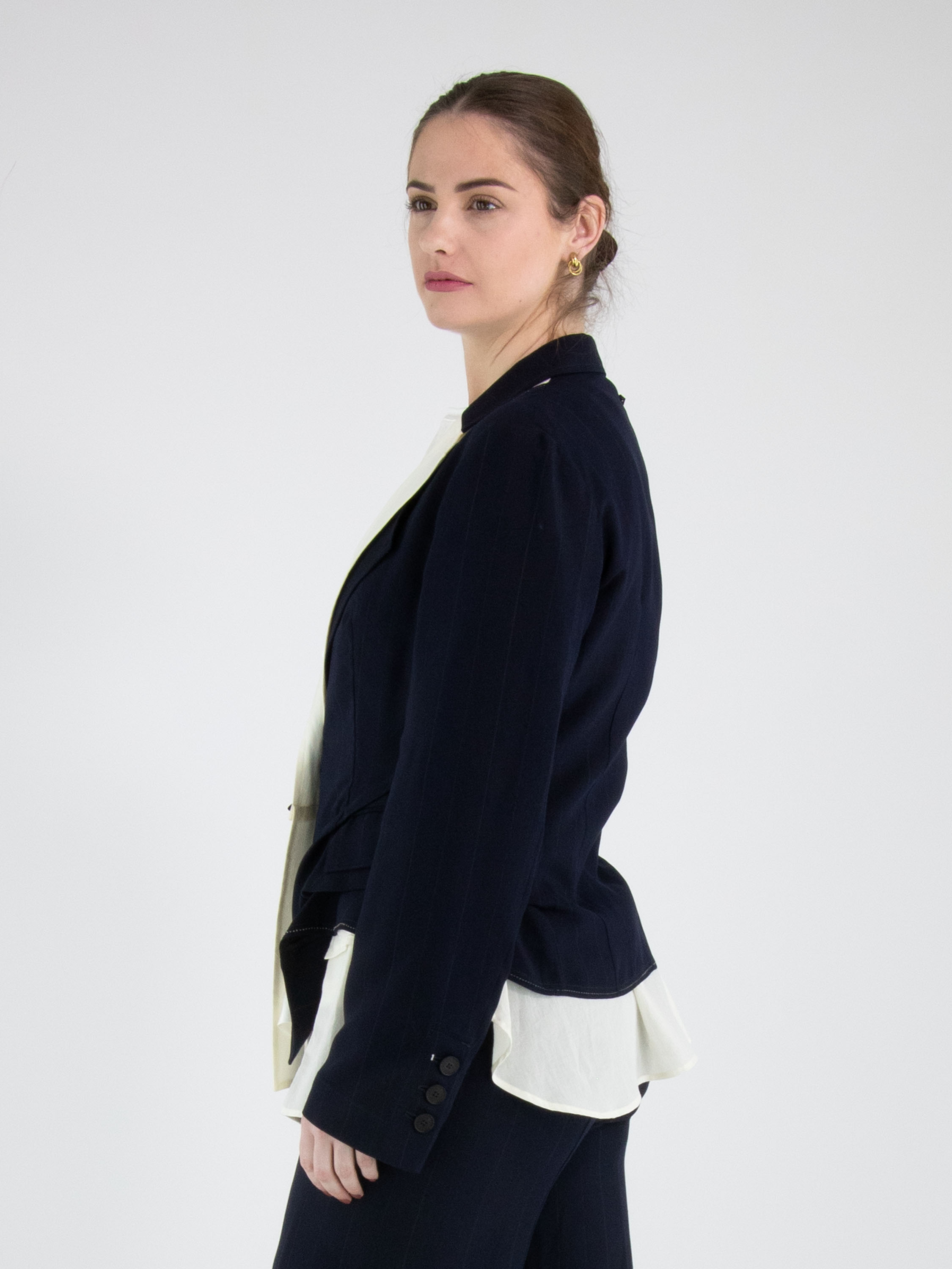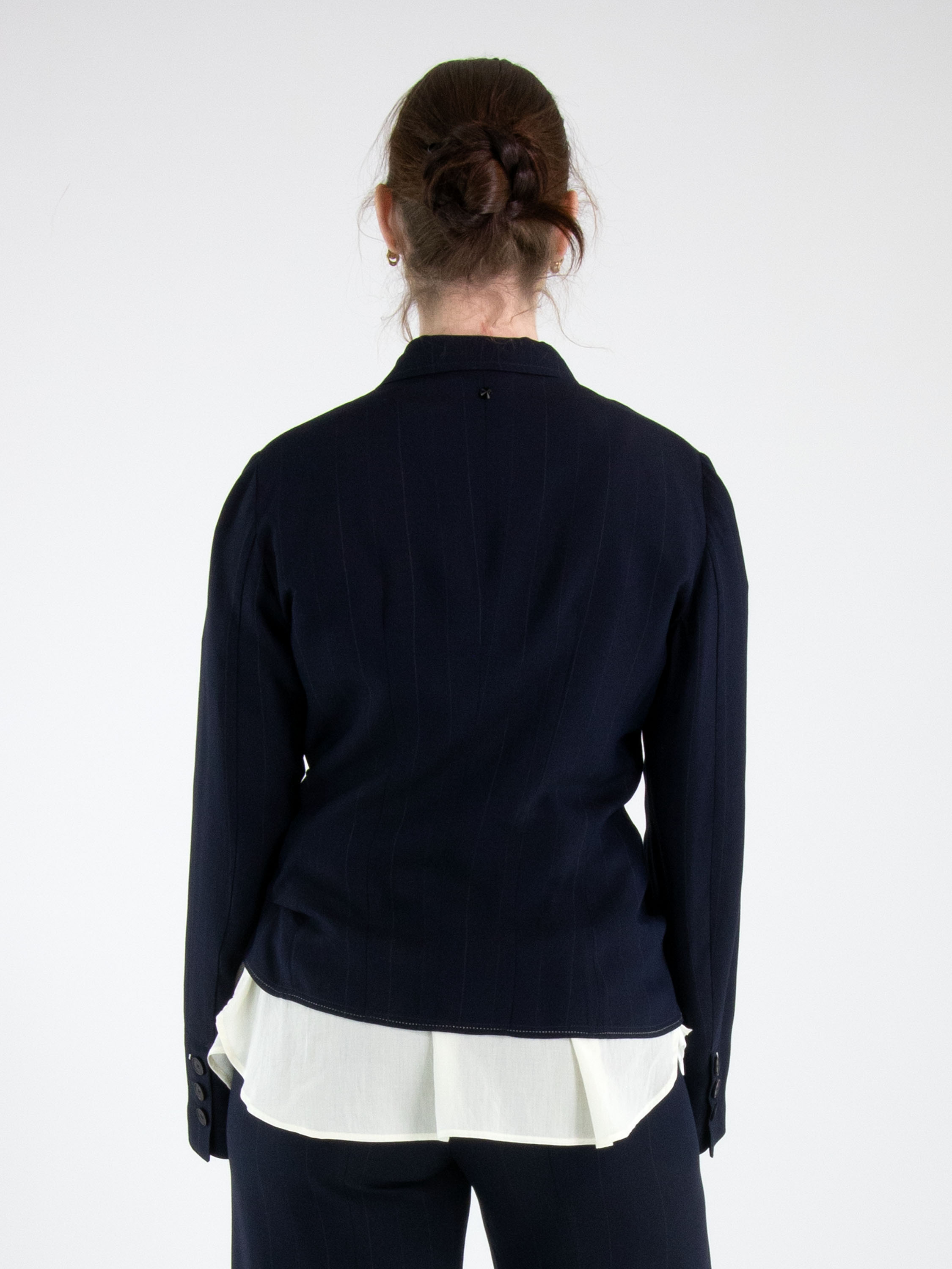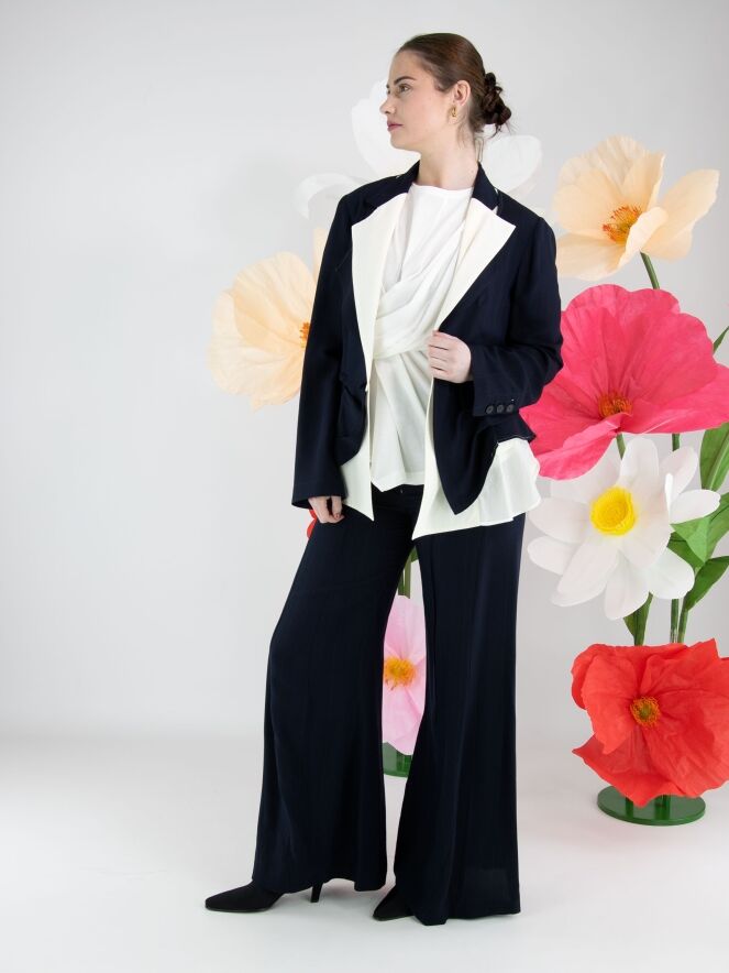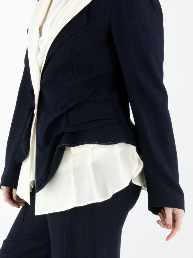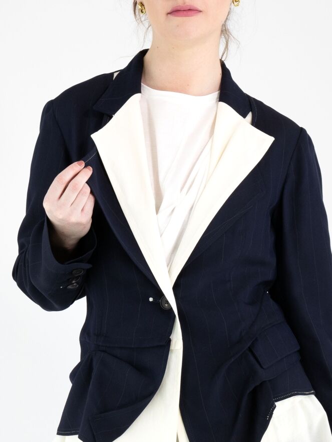 Een blazer van High in een ton sur ton krijtstreepstof in de kleur marineblauw. Vanuit de schouders is een tweede stof in de revers verwerkt, die vanaf de revers naar beneden loopt en onder de originele stof uitkomt. De blazer heeft een sluiting met één knoop, naast een decoratieve stud. Deze blazer mag niet worden gewassen.