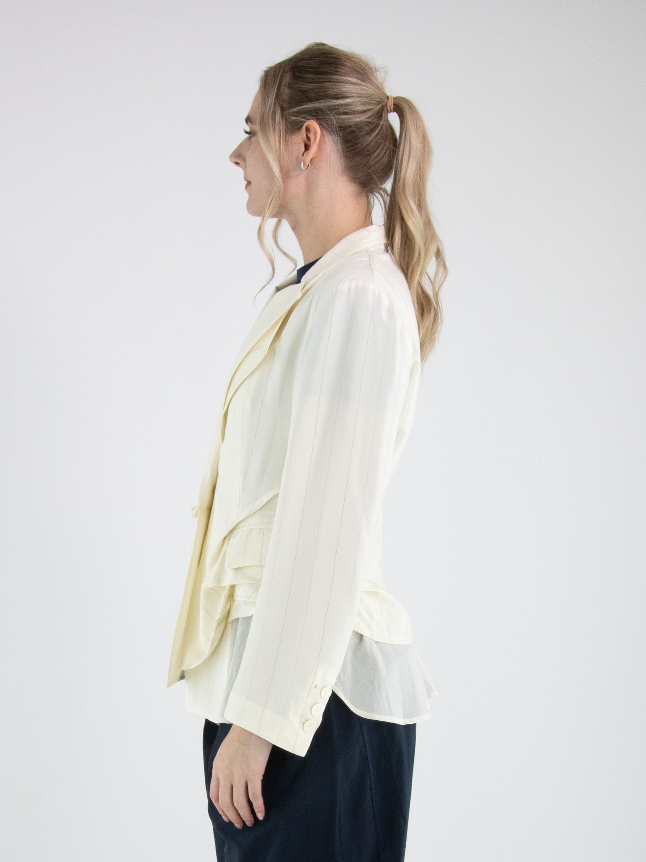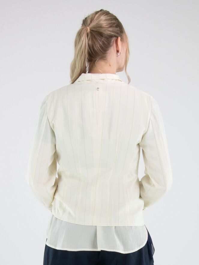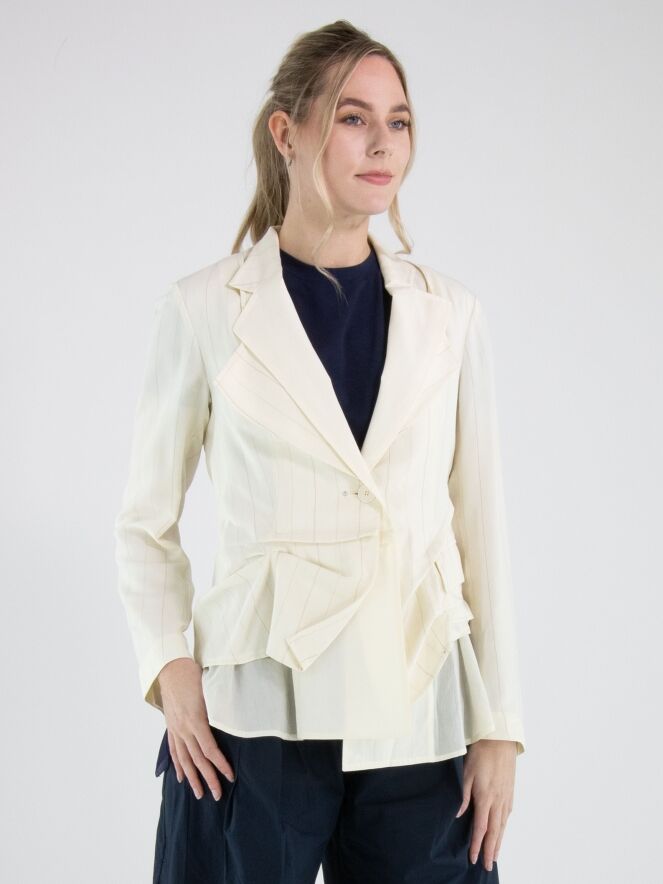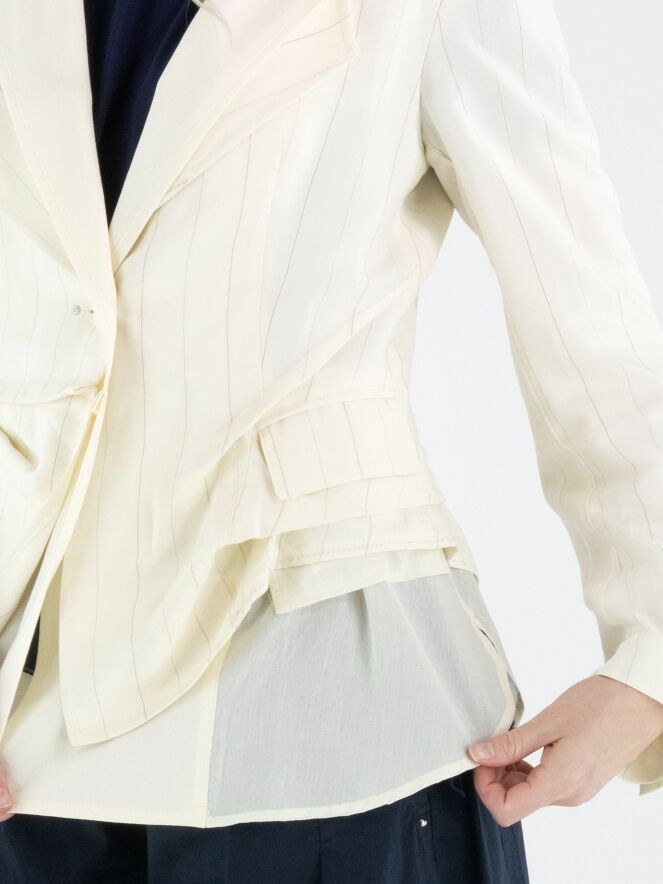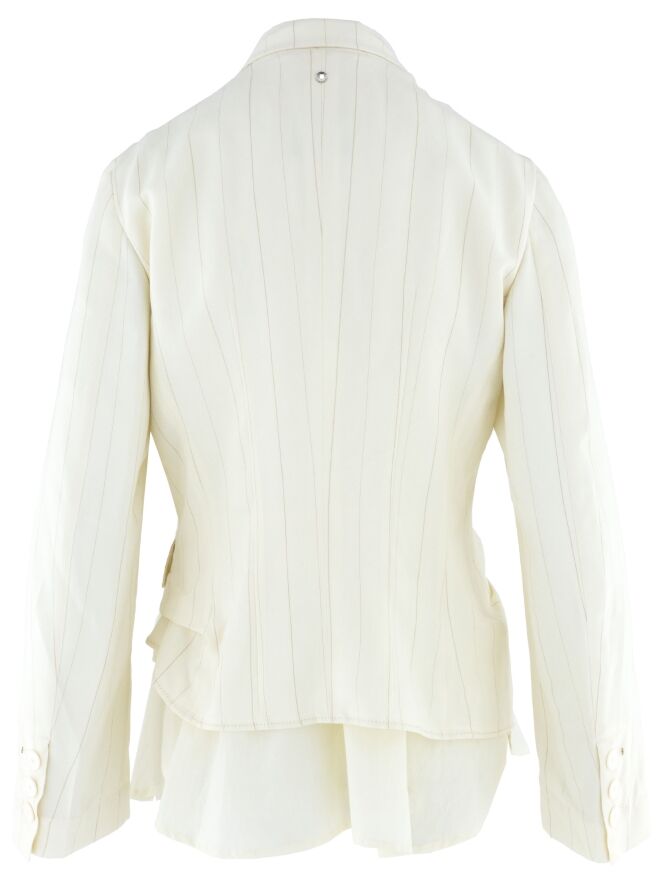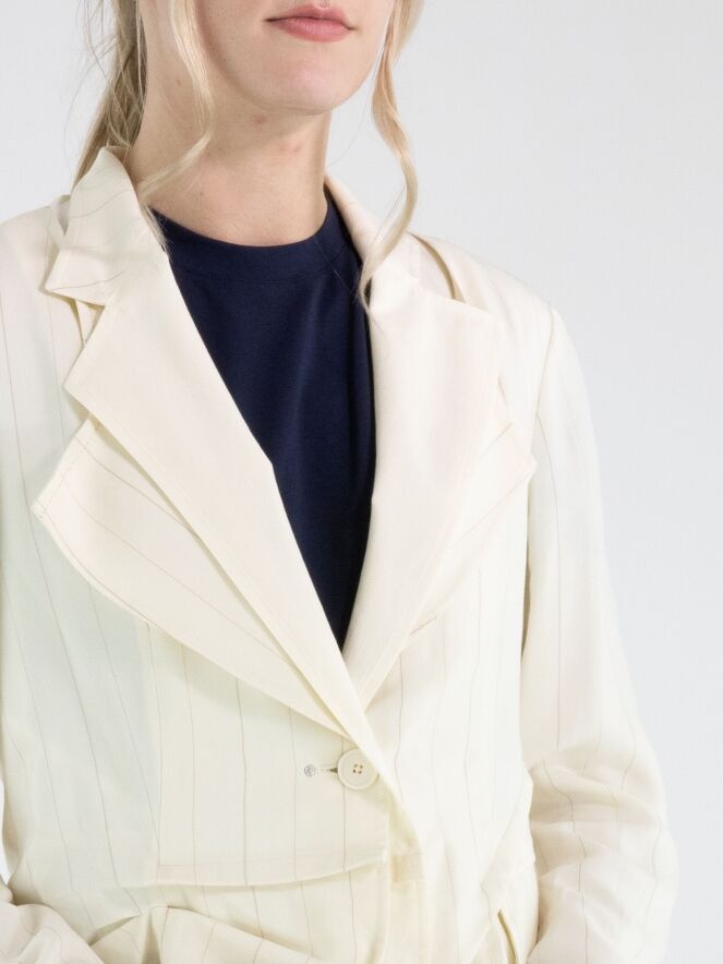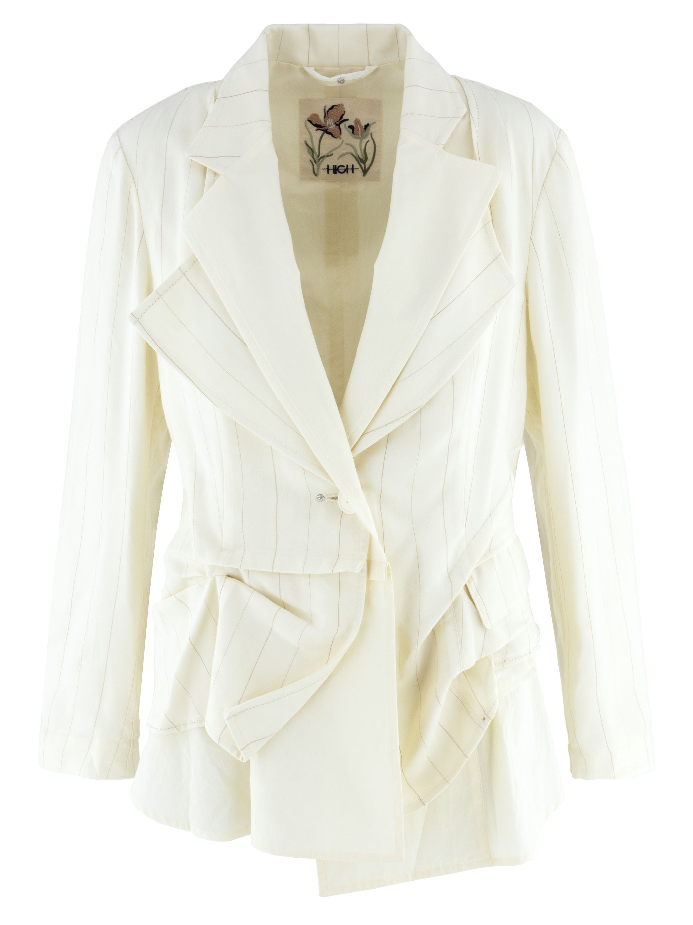 Blazer van High in een verfijnd krijtstreeppatroon in de kleuren roomwit en camel. Het model is uitgevoerd in een dubbele stofverwerking, waarbij de uni stof bij de dubbele kraag over de krijtstreep valt en aan de onderzijde juist onder de krijtstreep stof is geplaatst, wat zorgt voor een gelaagd en eigentijds effect. Onder de zakken is de krijtstreepstof op enkele punten vastgezet, waardoor een subtiel plooieffect ontstaat. Deze exclusieve designerblazer mag niet worden gewassen.