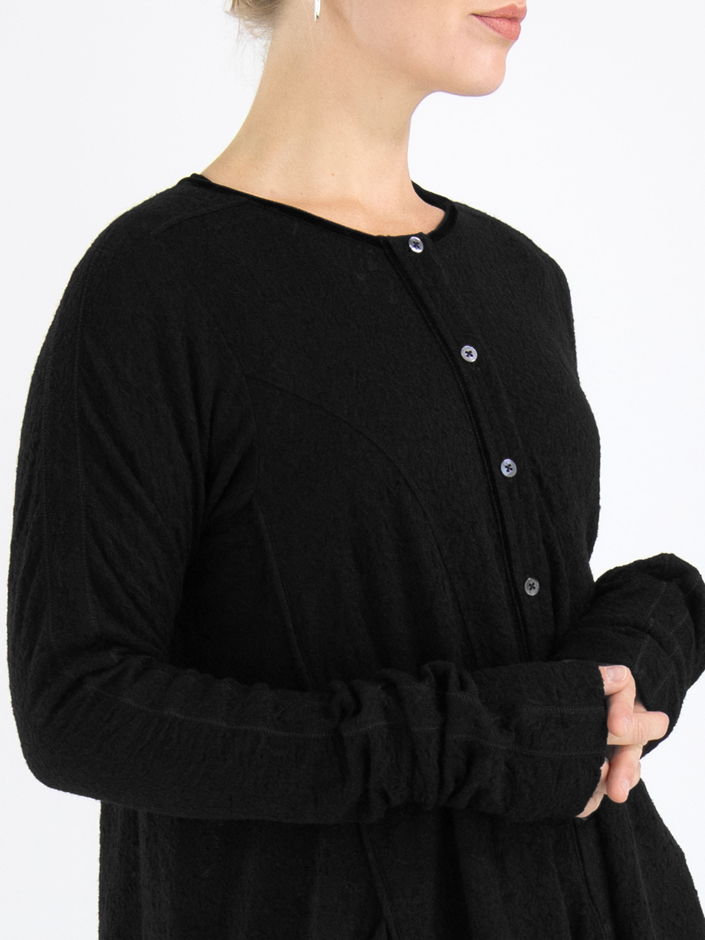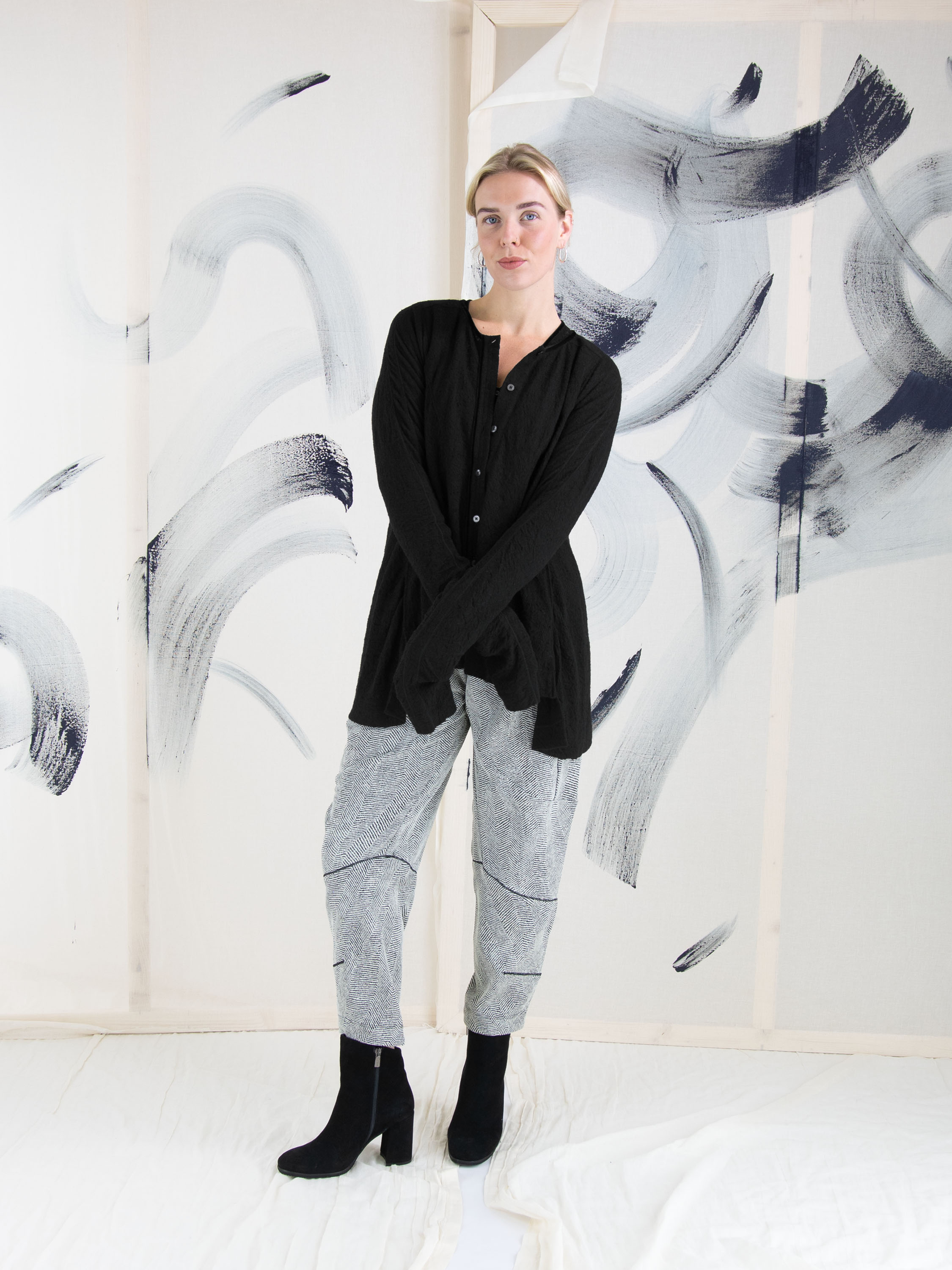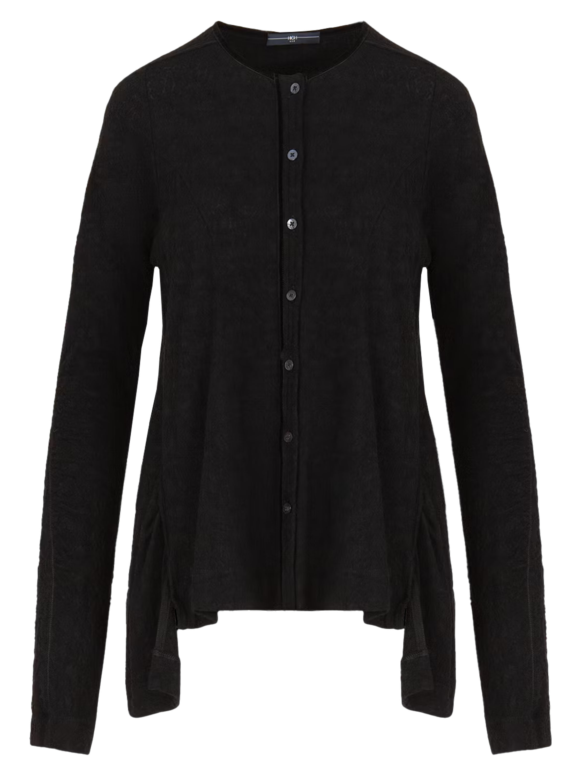 Een licht transparant vest van High in de kleur zwart. De stof heeft een soort reliëf barokstructuur en is elastisch. Vanuit de taille heeft het vest een A-lijn. Langs de rand van de ronde hals en de sluiting is een fluwelen bies. Dit vest mag met de hand worden gewassen.