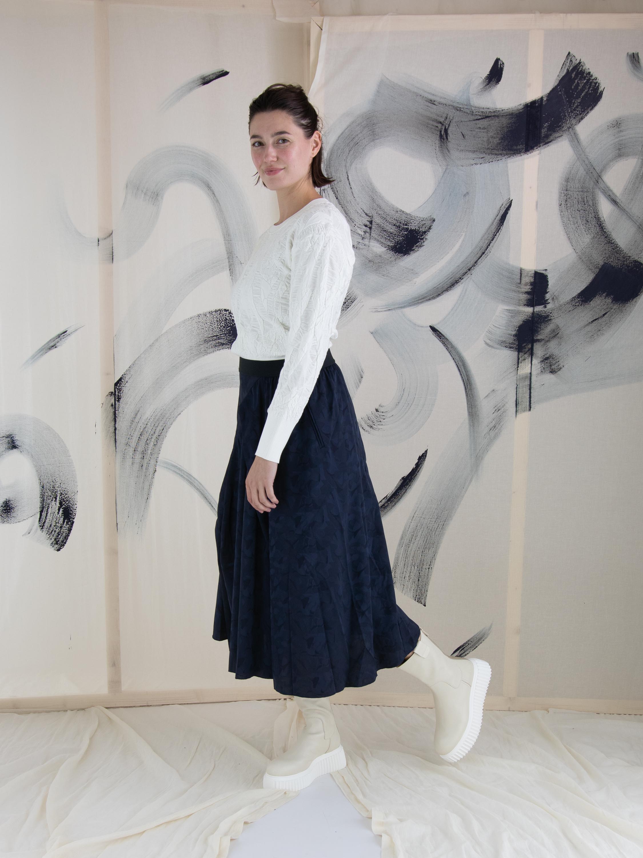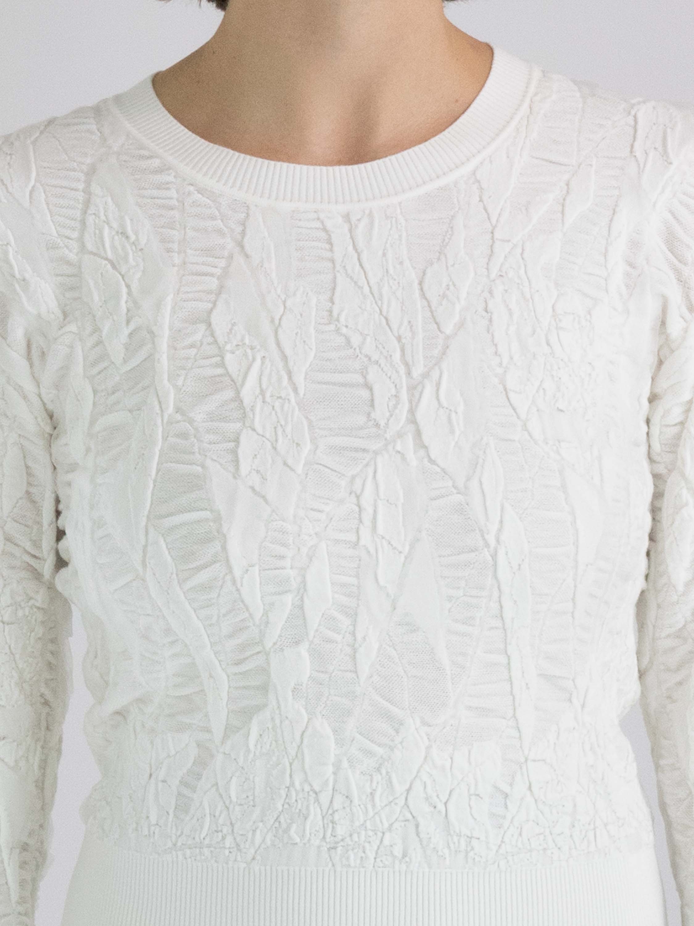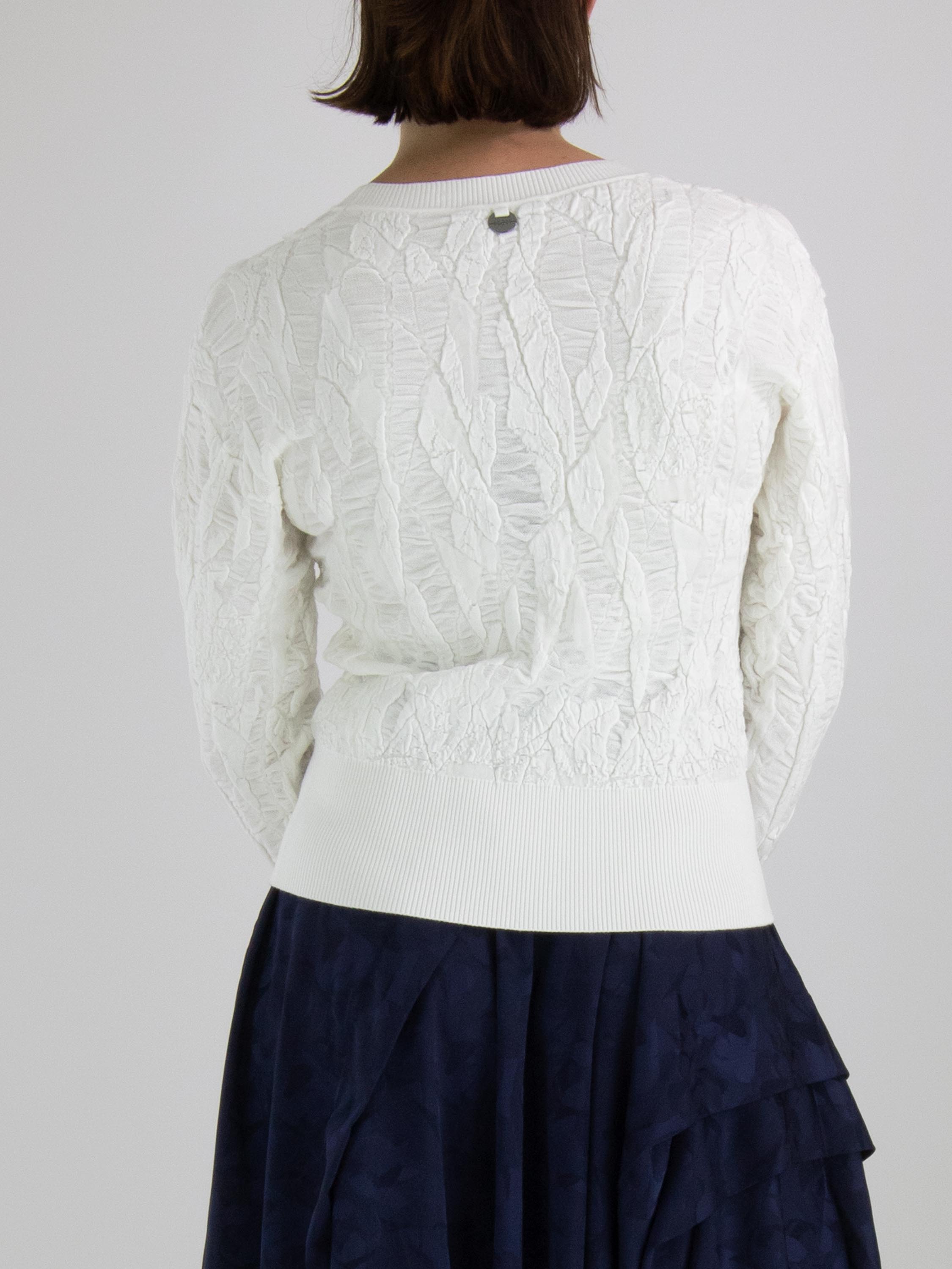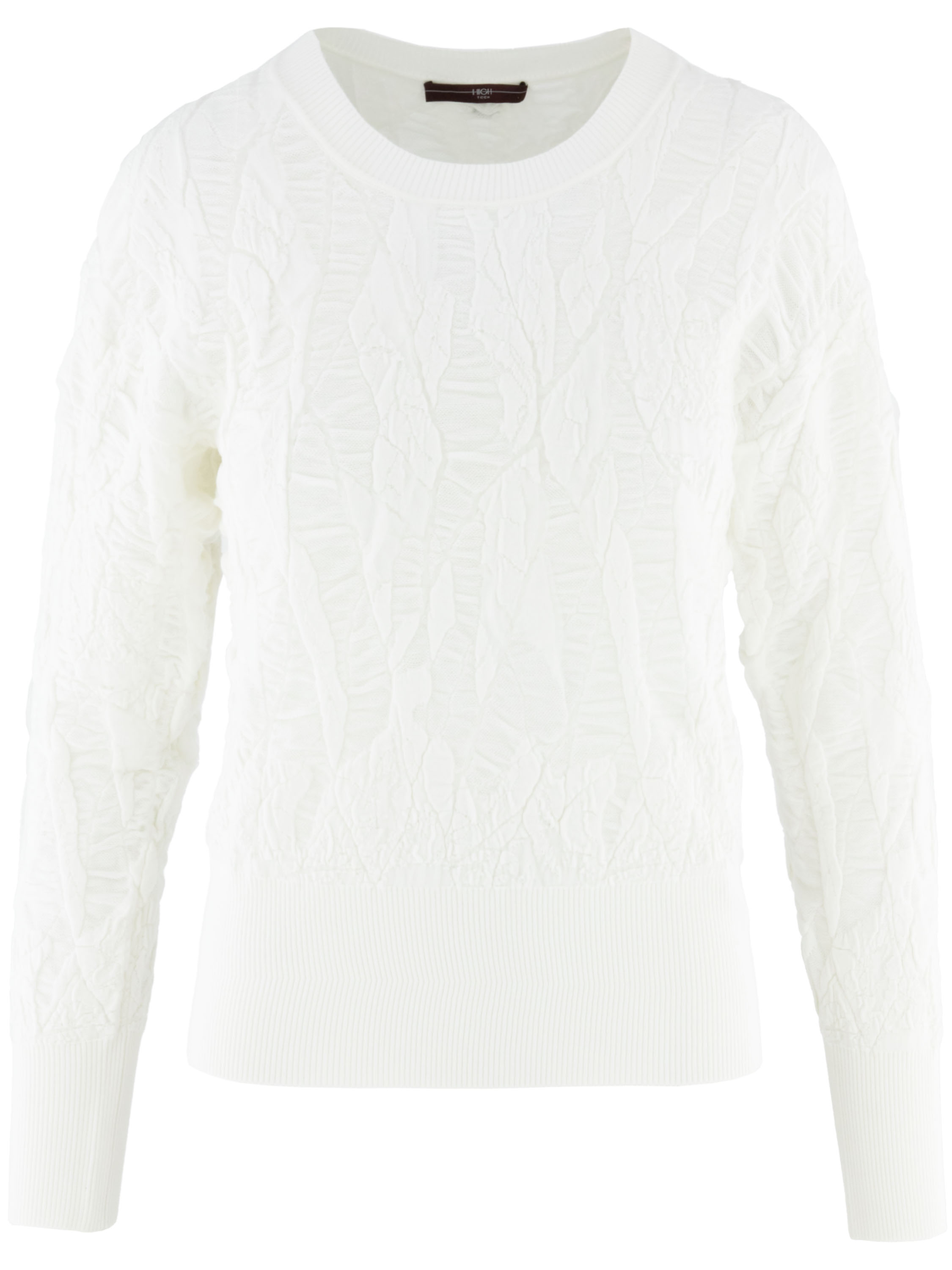 Een pullover van High in de kleur roomwit. De stof is in een reliëf structuur in een bladeren patroon. Langs de rand van de ronde hals, Aan het uiteinde van de korte mouwen en aan de onderkant van de pullover is een fijn geribbelde tricot boord. Deze pullover mag op de hand worden gewassen.