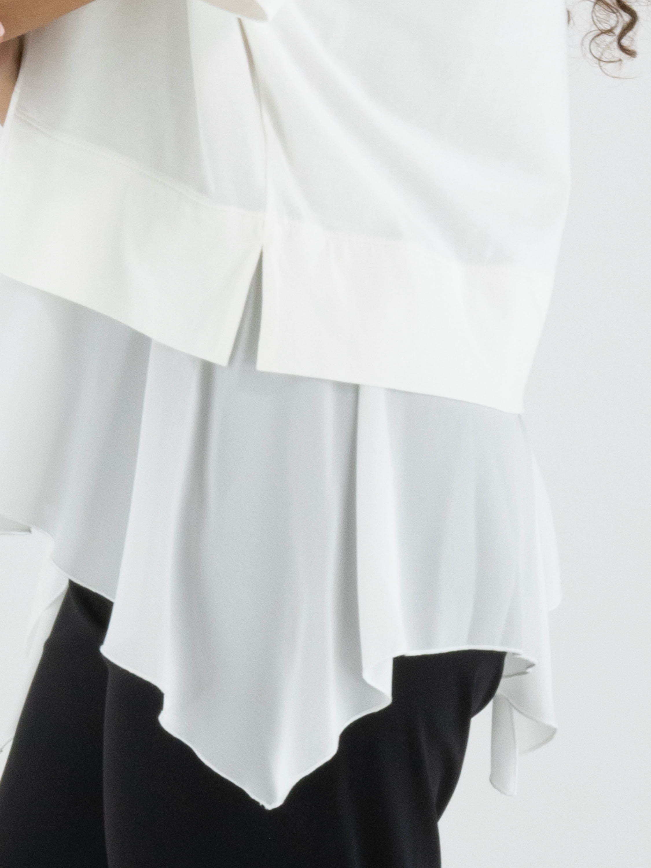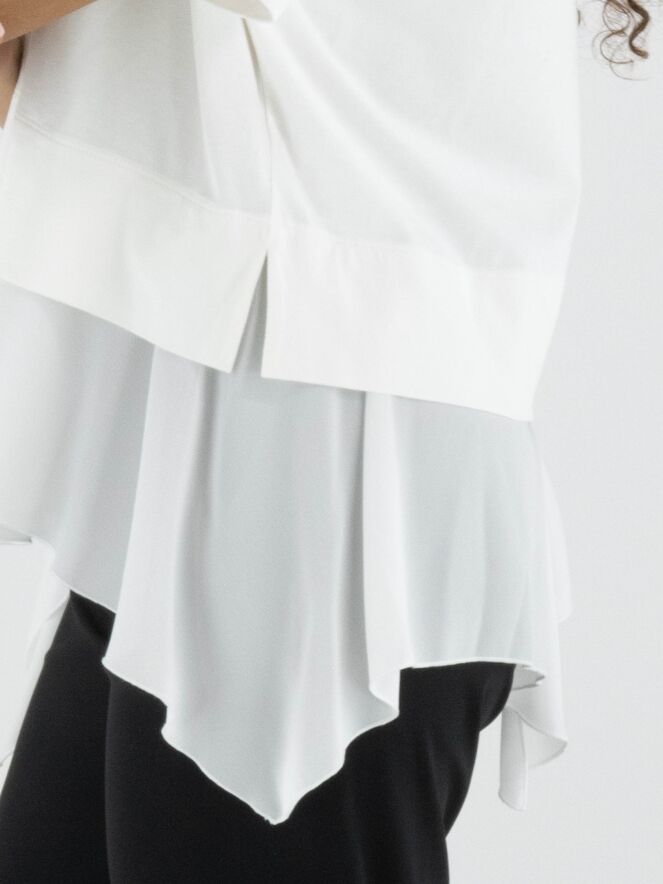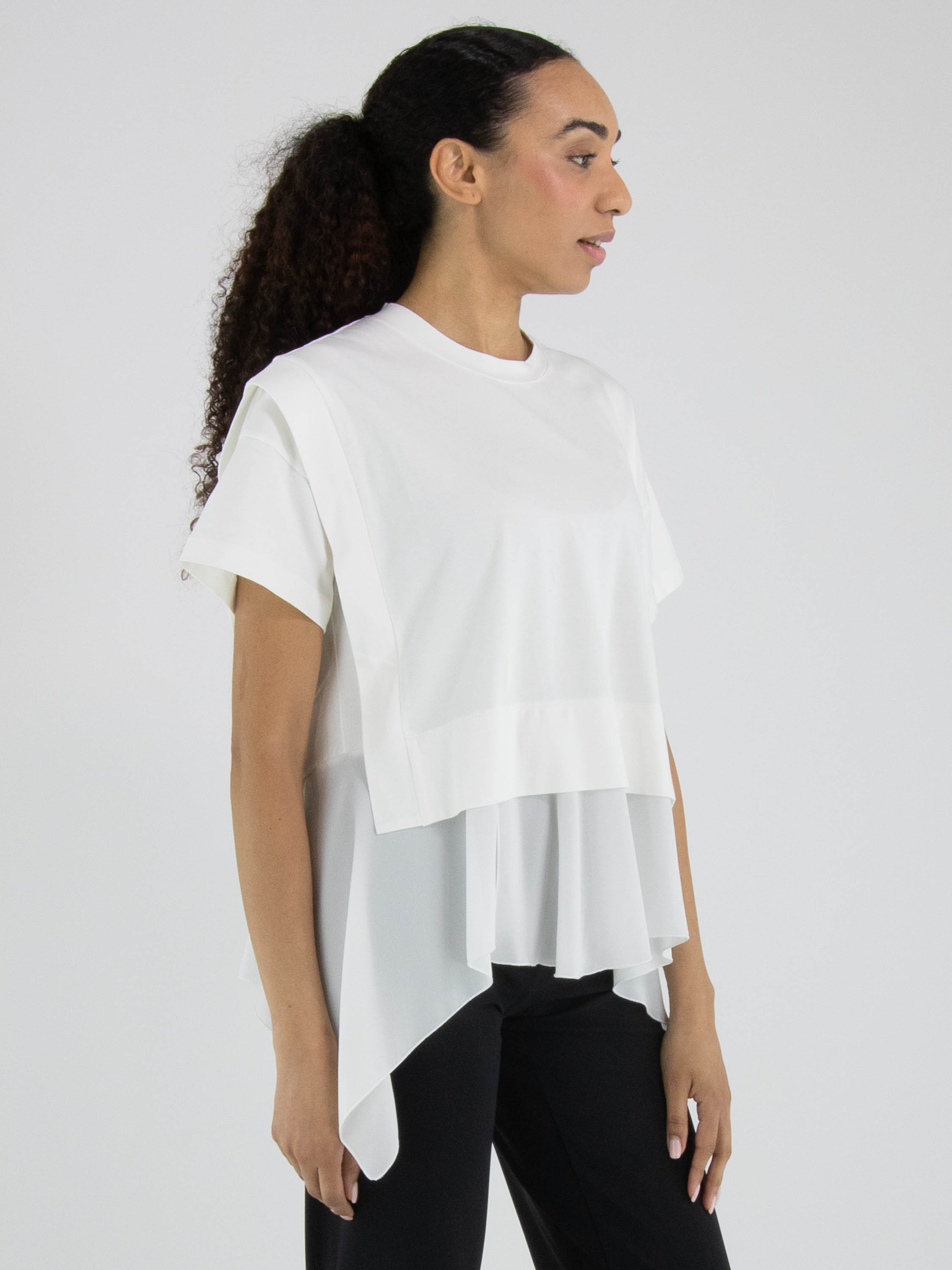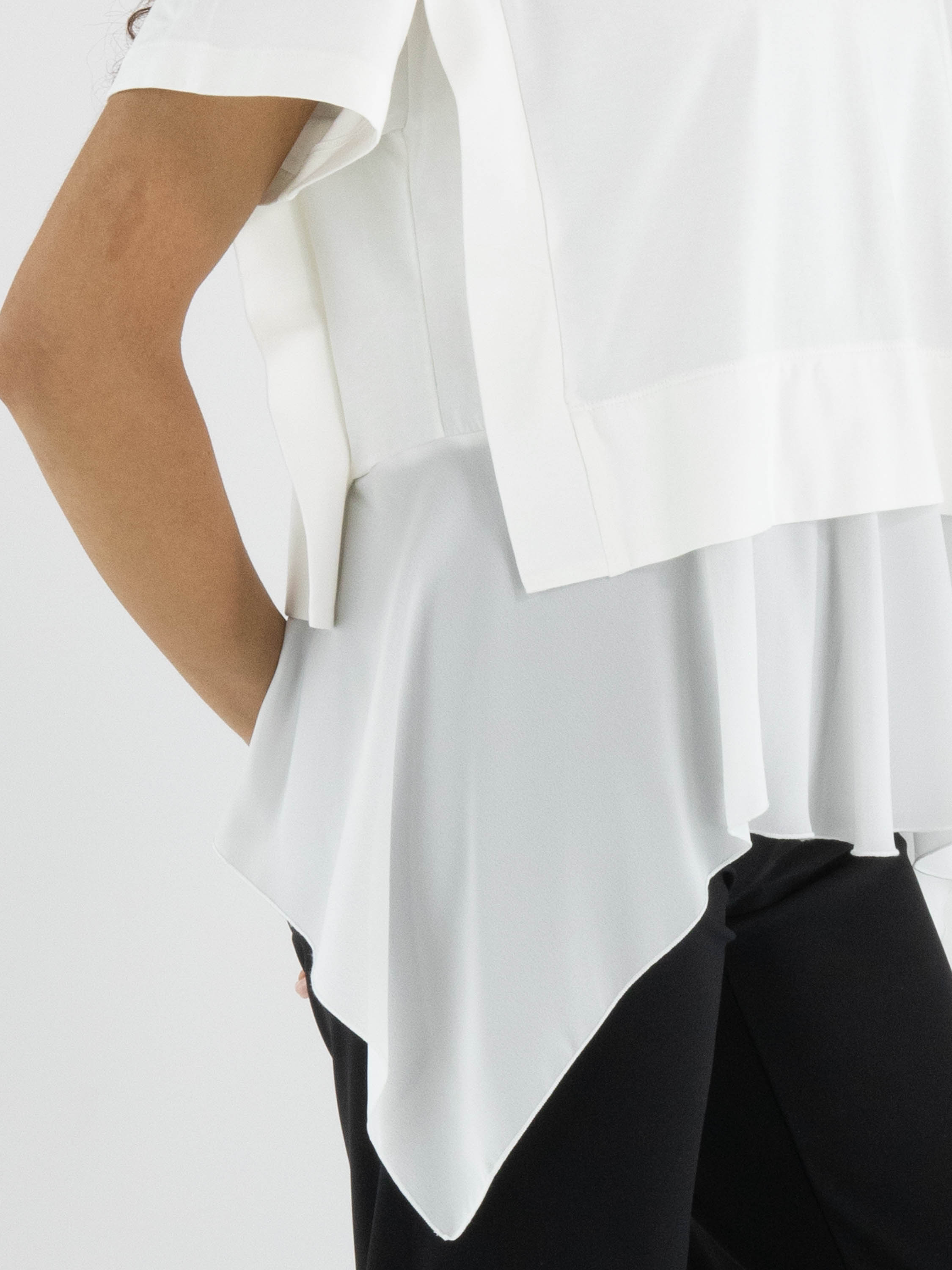 Shirt van High in de kleur roomwit. Het shirt heeft een ronde hals en korte mouwen. Aan de rechterzijde loopt een stiknaad waarna de stof subtiel doorvalt, wat zorgt voor een speels en eigentijds effect. Ook aan de onderzijde is dit detail verwerkt, waar een rond gesneden, geplooide voile stof onderuit komt voor een verfijnde en gelaagde uitstraling. Dit exclusieve designer shirt kan met de hand worden gewassen.