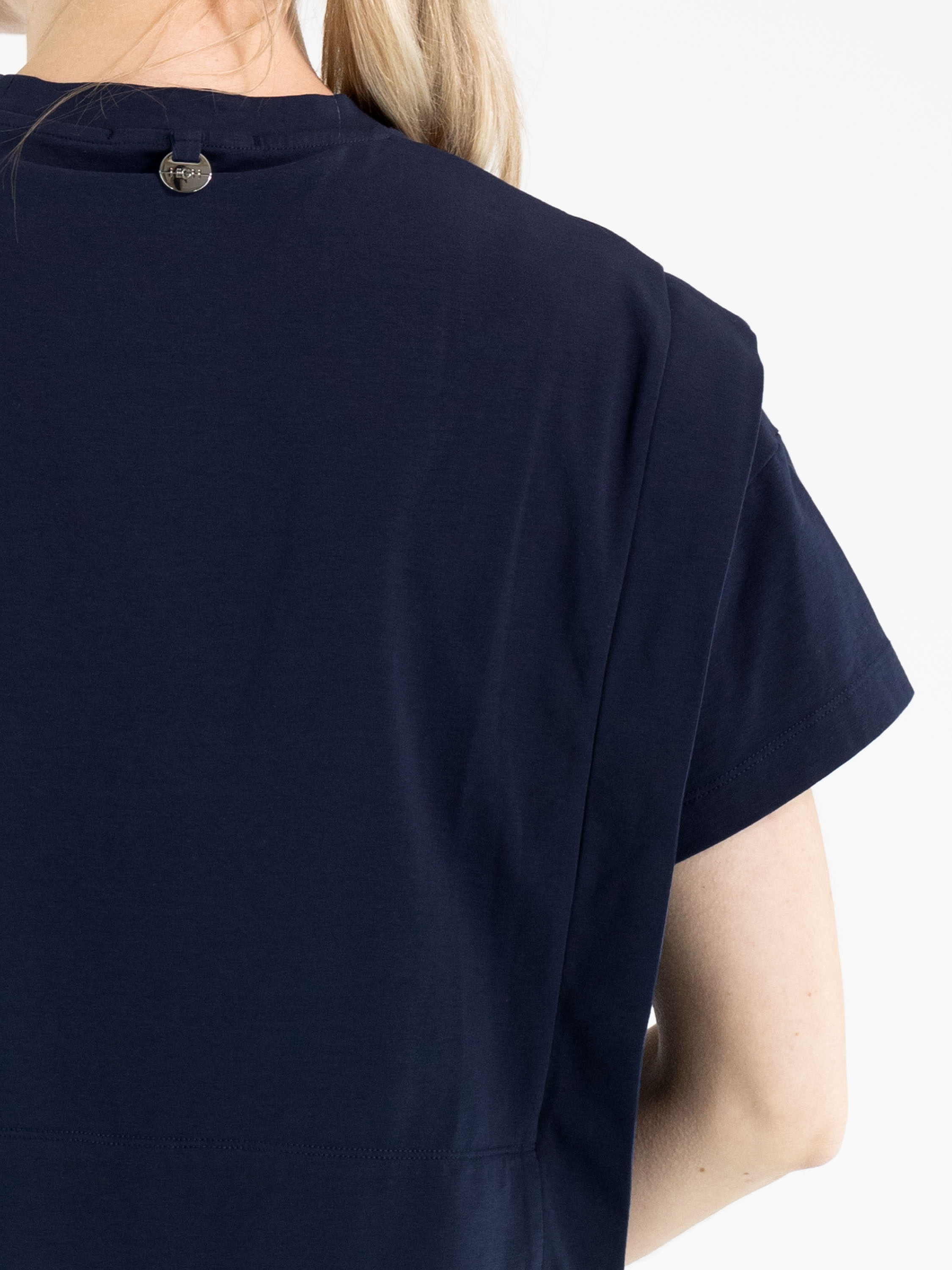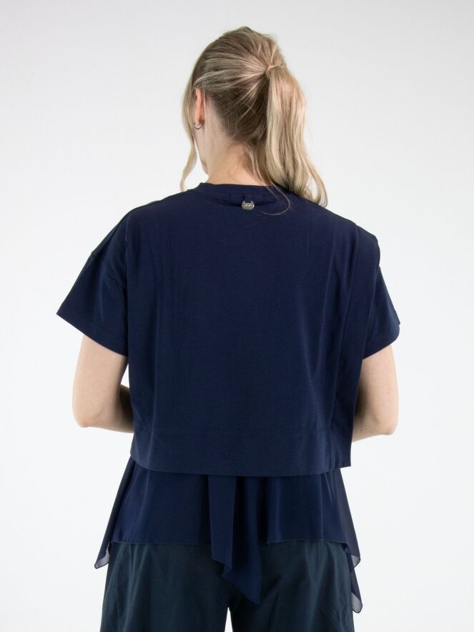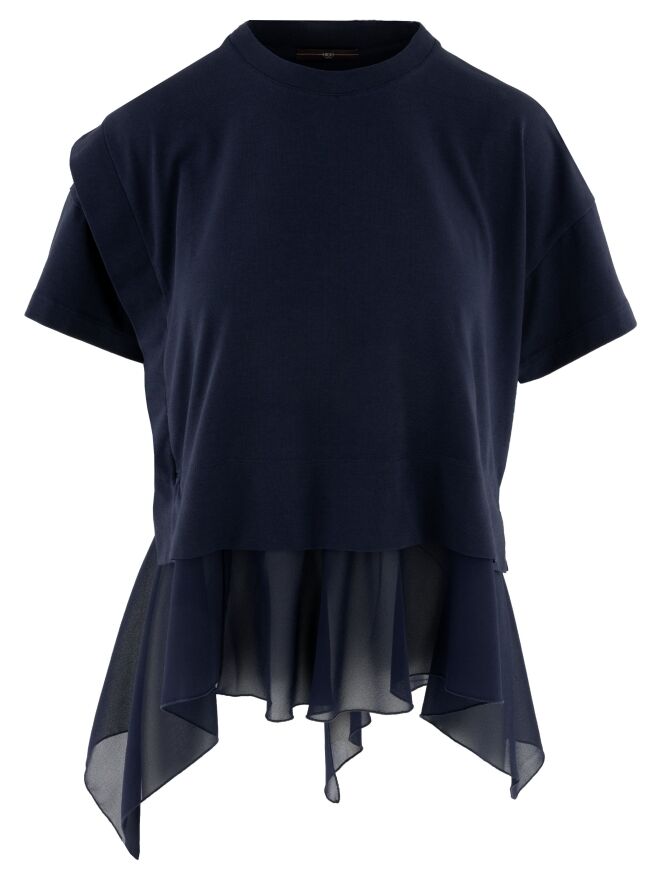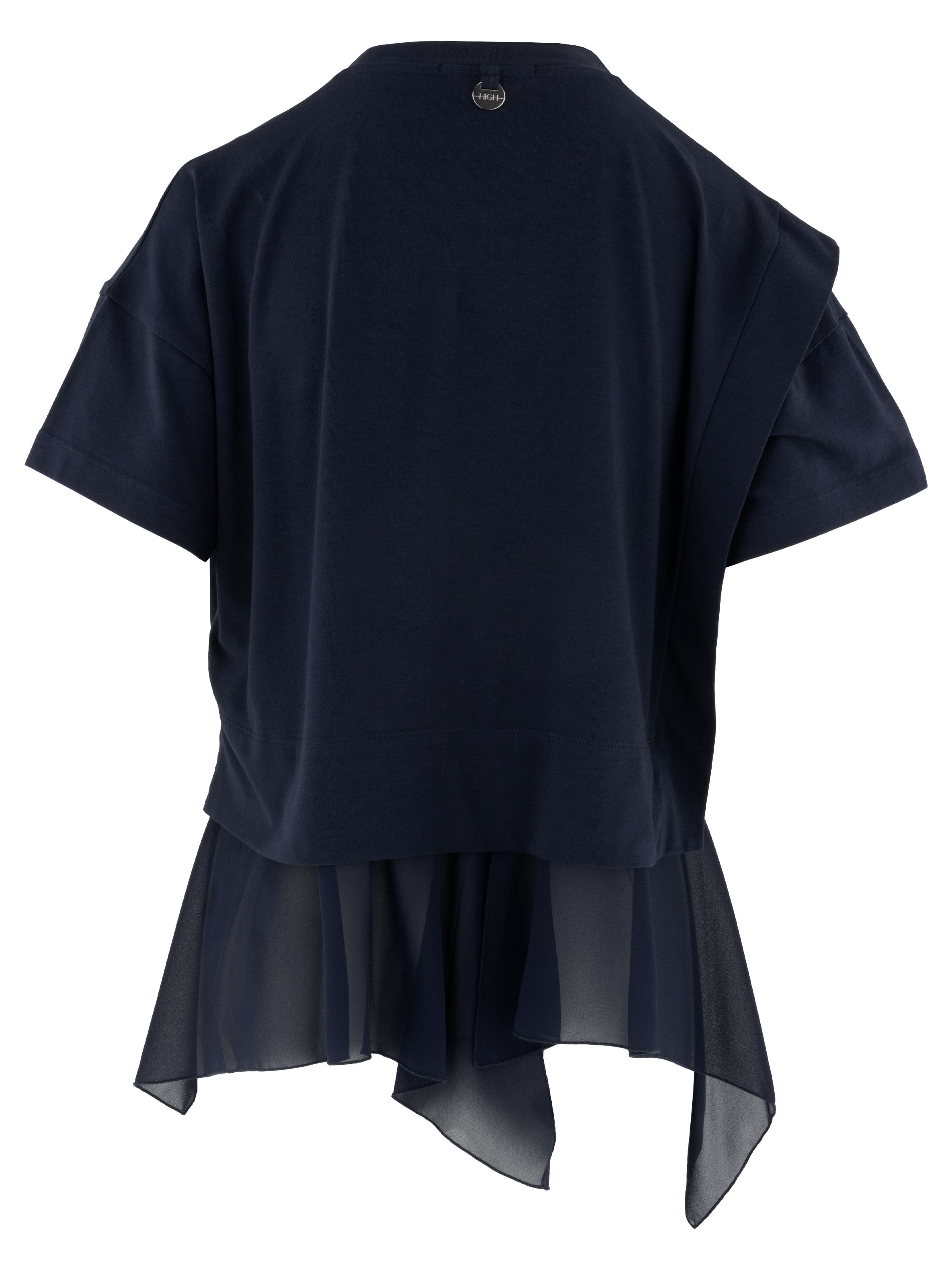 Shirt van High in de kleur marineblauw. Het shirt heeft een ronde hals en korte mouwen. Aan de rechterzijde is een stiknaad aangebracht waar de stof subtiel doorloopt, wat zorgt voor een speels en asymmetrisch effect. Ook aan de onderzijde loopt de stof door, waaronder een rond gesneden, geplooide voile zichtbaar wordt. Dit geeft het ontwerp een lichte en verfijnde uitstraling. Dit exclusieve designer shirt kan met de hand worden gewassen.