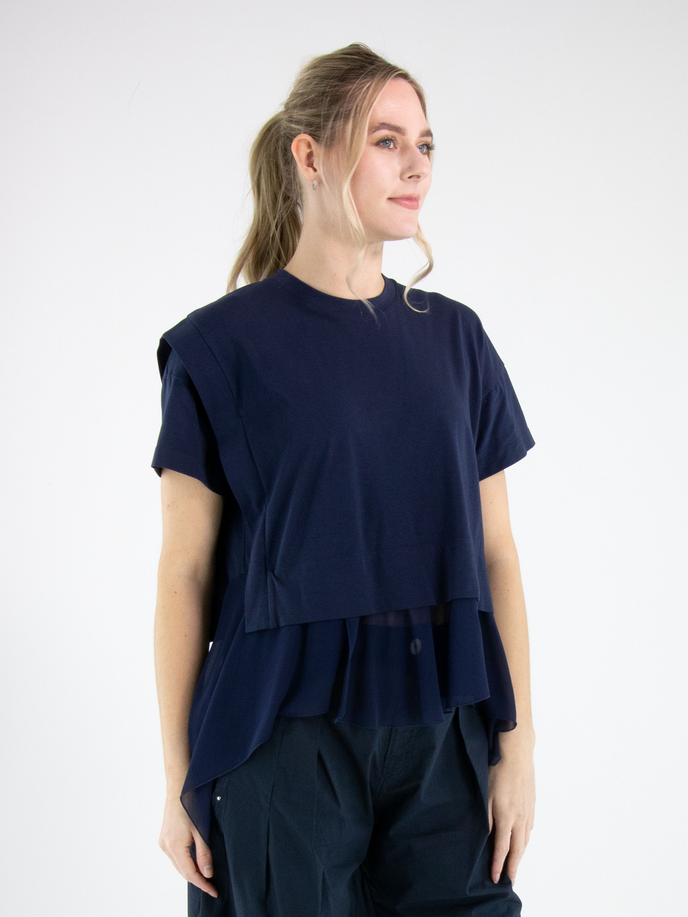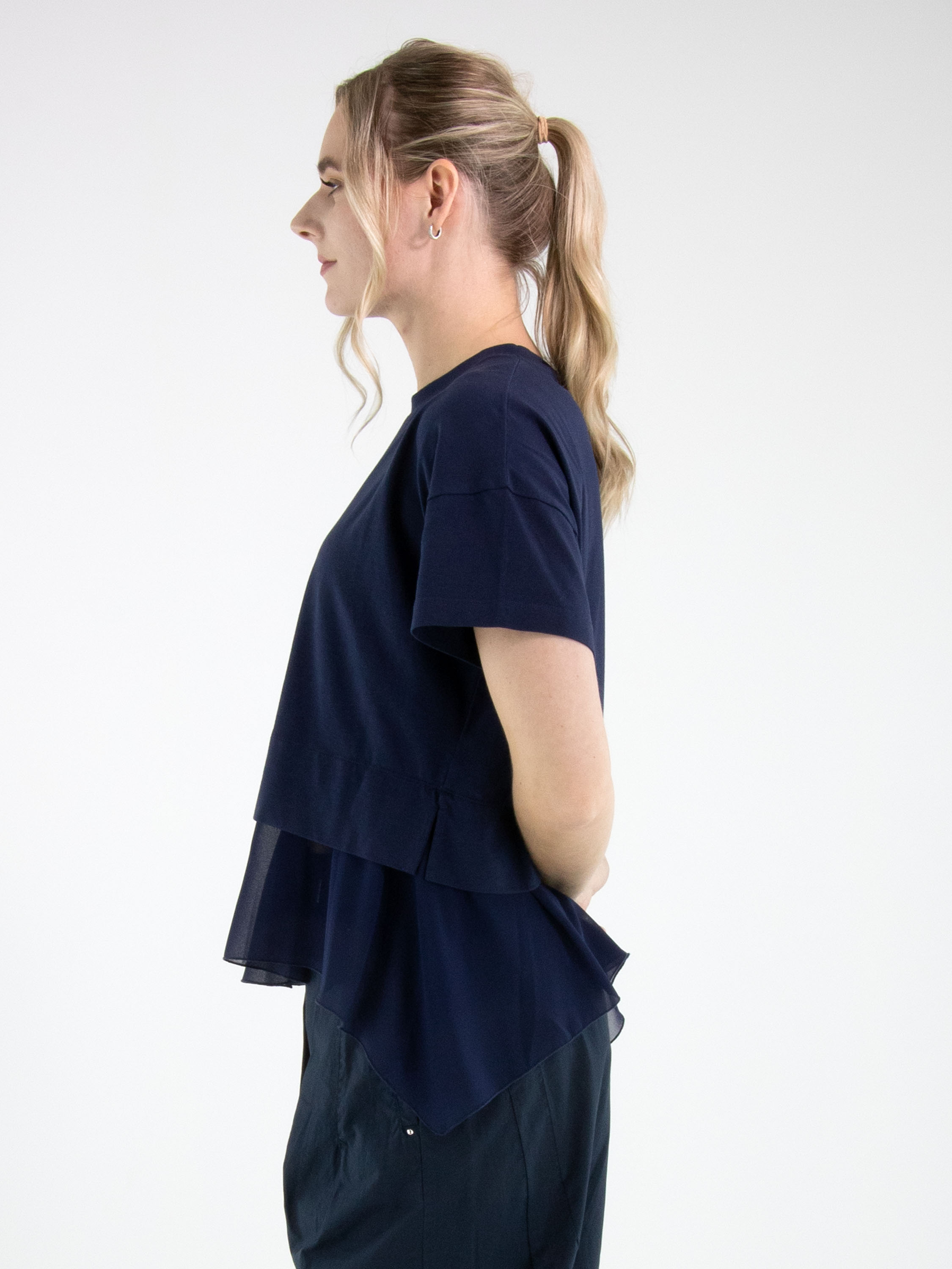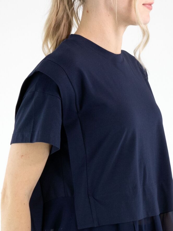 Shirt van High in de kleur marineblauw. Het shirt heeft een ronde hals en korte mouwen. Aan de rechterzijde is een stiknaad aangebracht waar de stof subtiel doorloopt, wat zorgt voor een speels en asymmetrisch effect. Ook aan de onderzijde loopt de stof door, waaronder een rond gesneden, geplooide voile zichtbaar wordt. Dit geeft het ontwerp een lichte en verfijnde uitstraling. Dit exclusieve designer shirt kan met de hand worden gewassen.