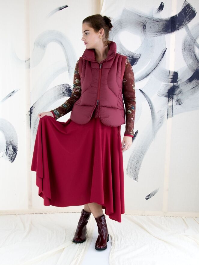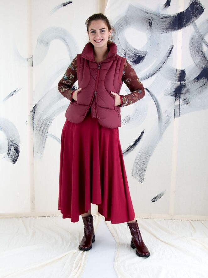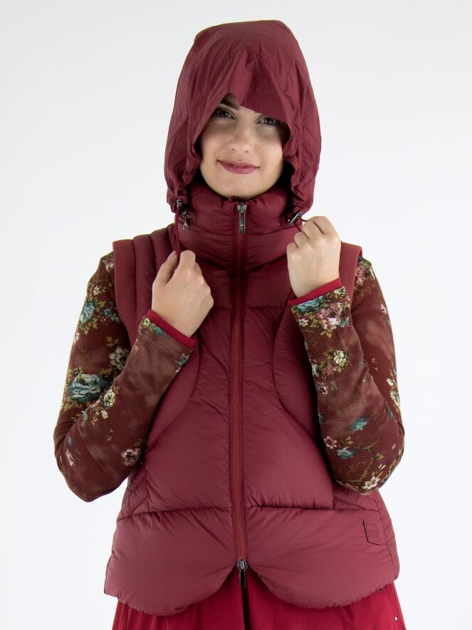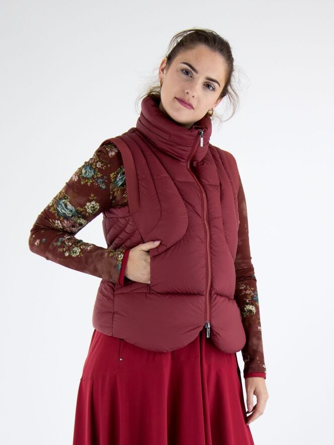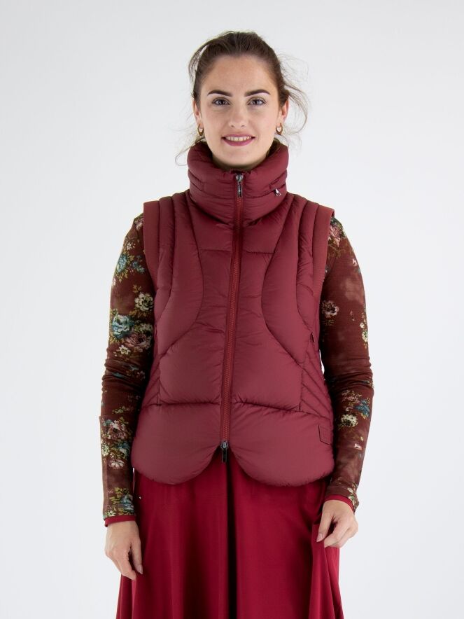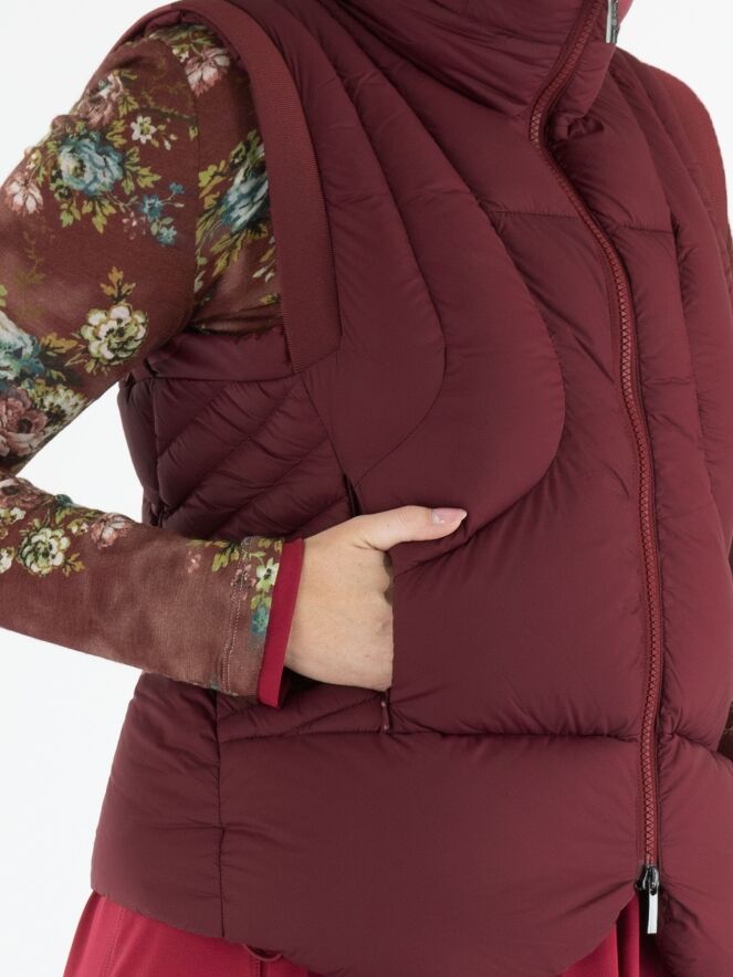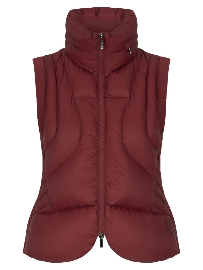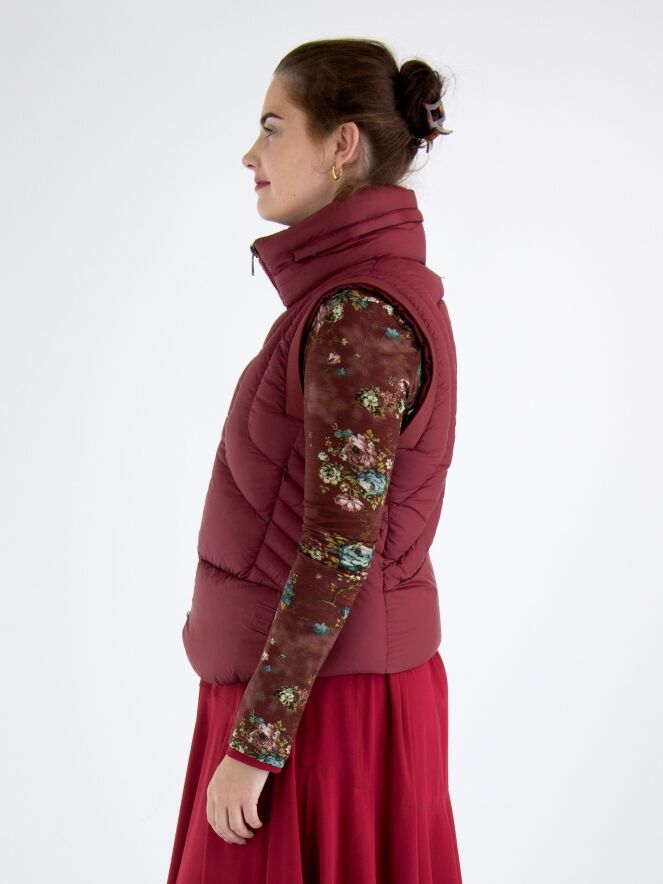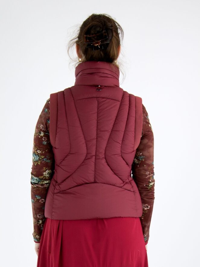 Een gestepte bodywarmer van High in de kleur bordeauxrood. De bodywarmer heeft steekzakken met een ritssluiting en in de rand aan de onderkant zijn koorden waarmee een plooi effect kan worden gecreëerd. Langs de rand van de mouwinzet zijn fijn geribbelde tricot boorden. Deze bodywarmer mag op 30 graden worden gewassen.