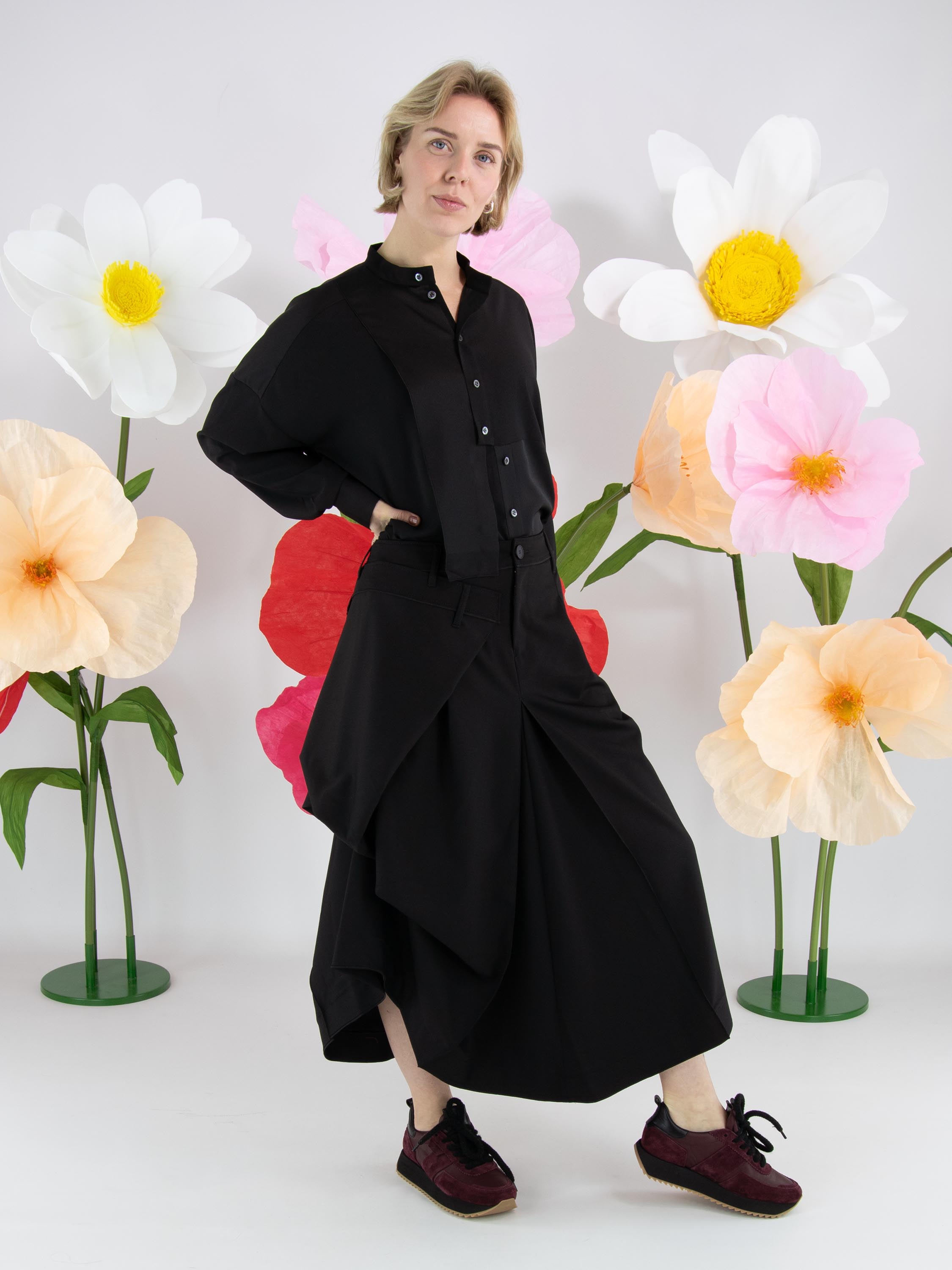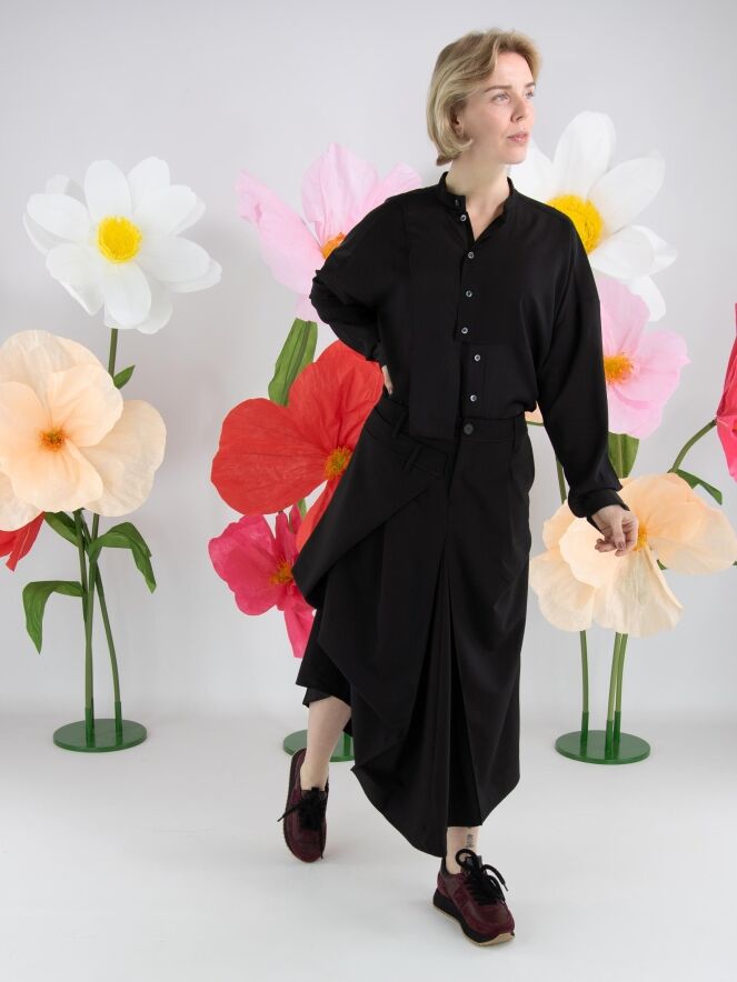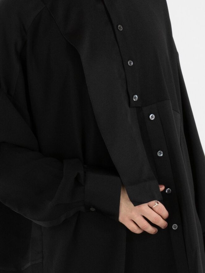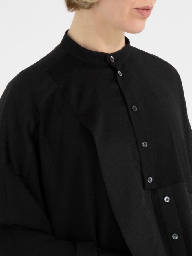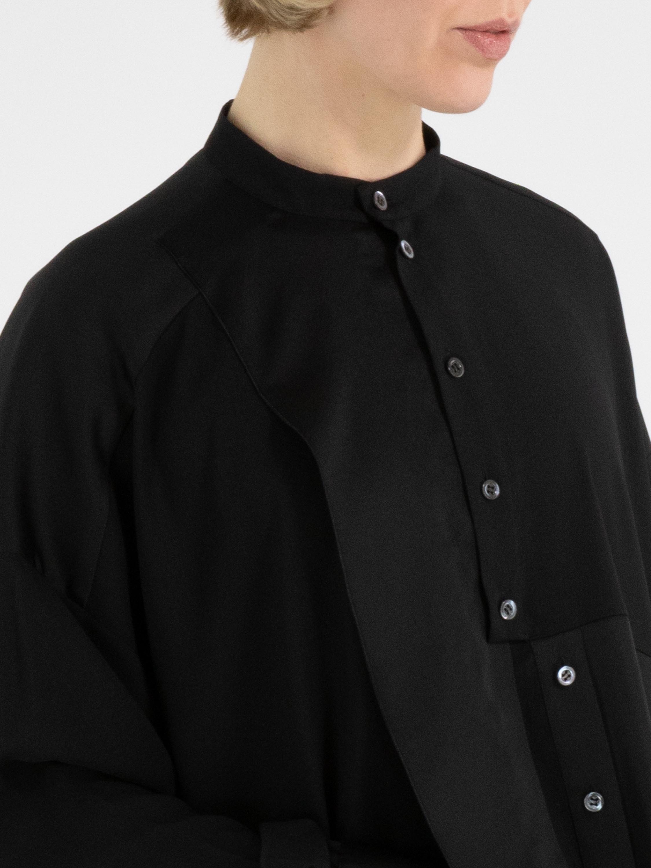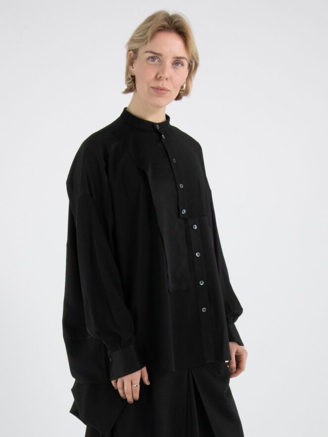 Een blouse van High Tech in de kleur zwart. De stof is deels mat en deels uitgevoerd in een mat satijnen kwaliteit. Vanuit de hals tot onder de buste is de knoopsluiting gecentreerd. Vanaf onder de buste is de knoopsluiting enkele centimeters naar rechts opgeschoven, waardoor de blouse niet volledig geopend kan worden. Langs de rand van de manchetten van de lange mouwen is de stof geplooid. Deze blouse mag op de hand worden gewassen.