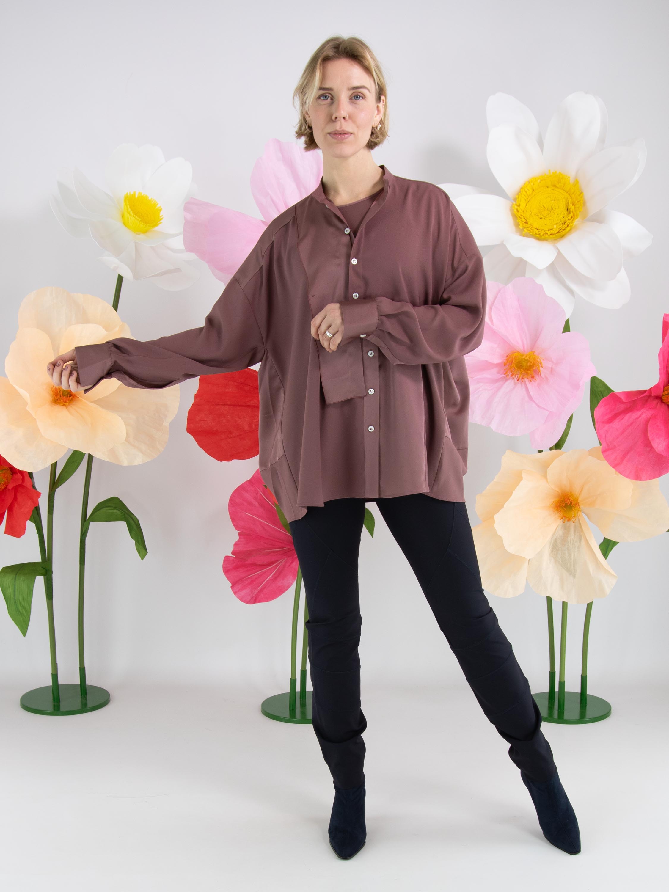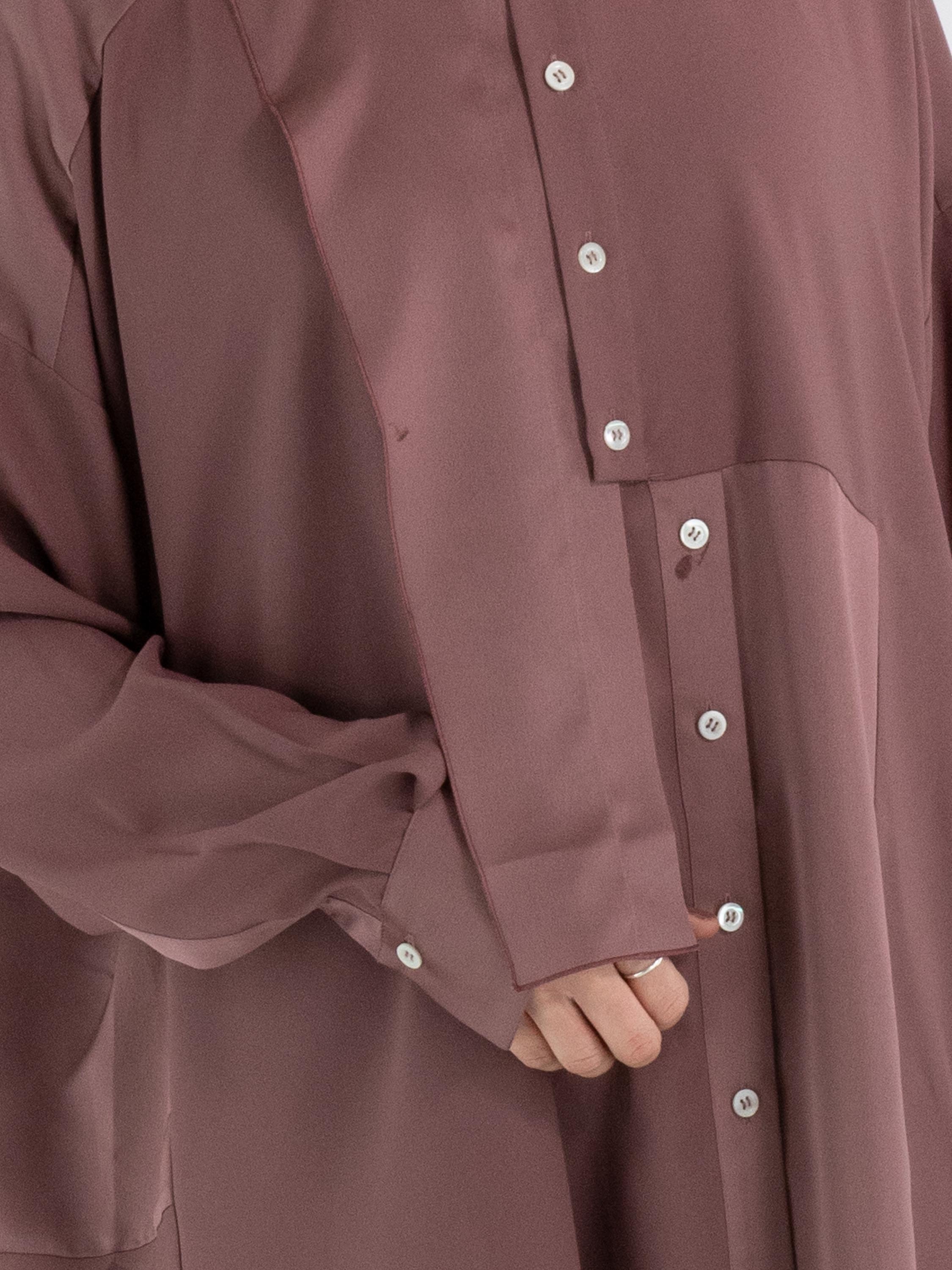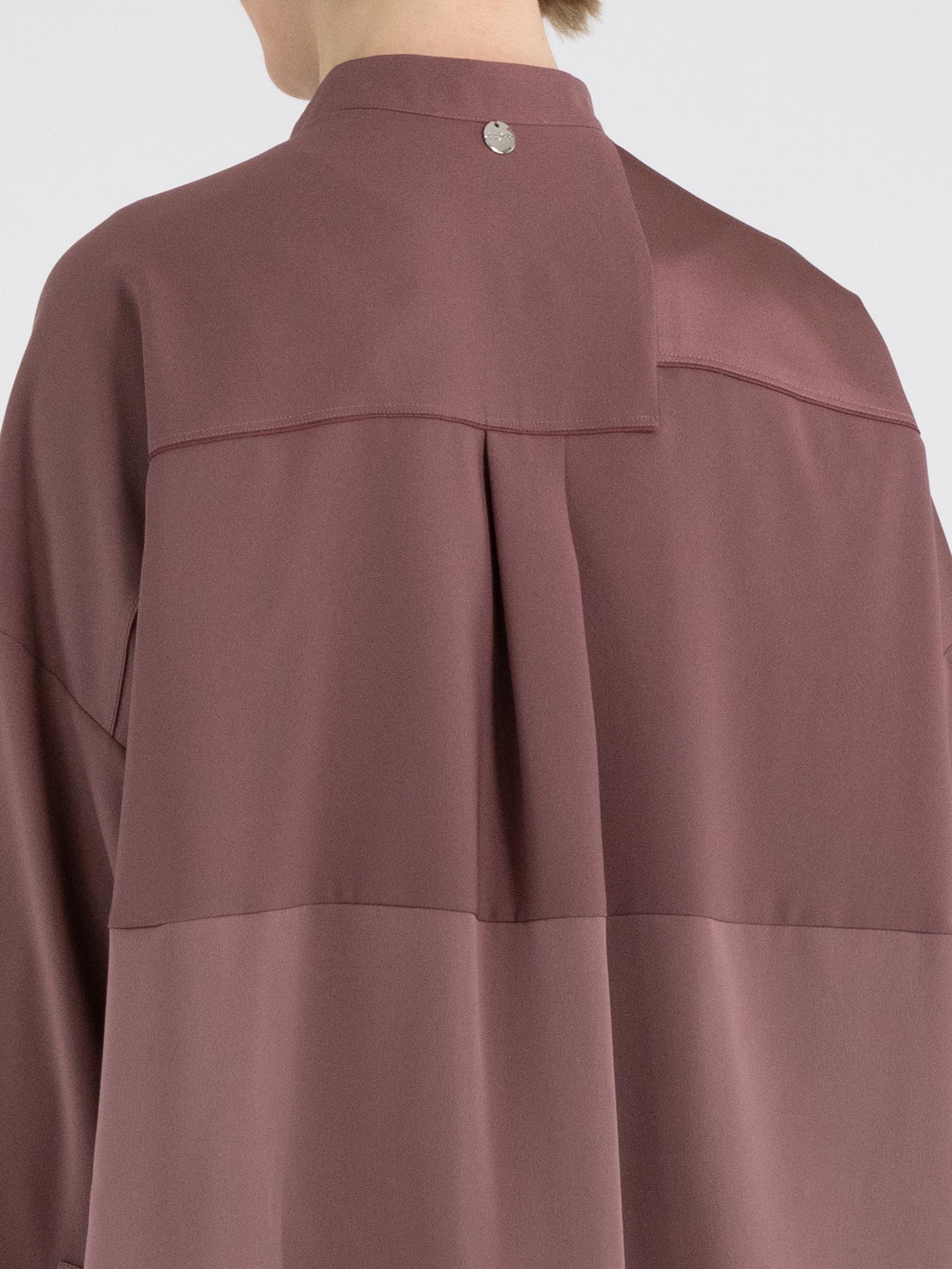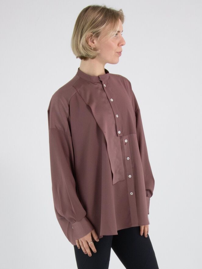 Een blouse van High Tech in de kleur mauve. De stof is deels mat en deels mat satijn. Vanuit de hals tot onder de buste is de knoopsluiting gecentreerd. Vanaf onder de buste is de knoopsluiting enkele centimeters naar rechts verplaatst, waardoor de blouse niet volledig kan worden geopend. Langs de rand van de manchetten van de lange mouwen is de stof geplooid. Deze blouse mag op de hand worden gewassen.