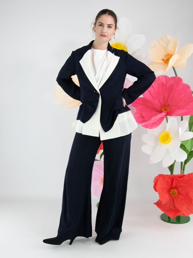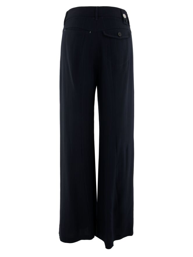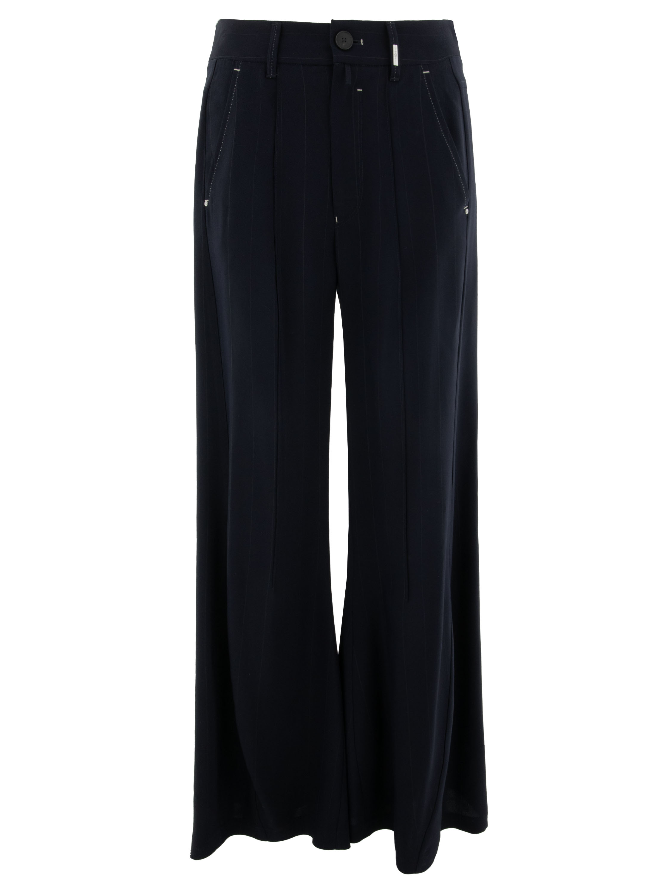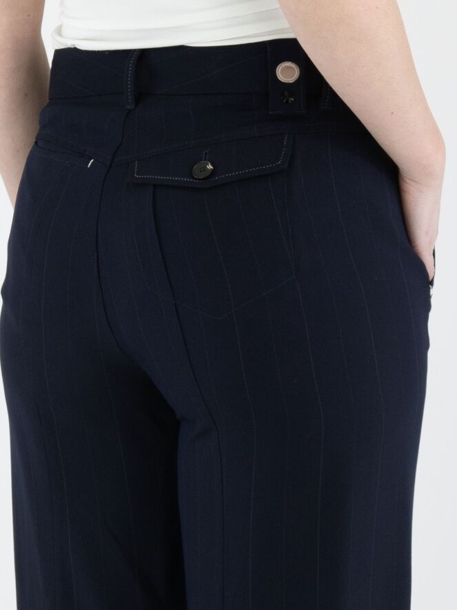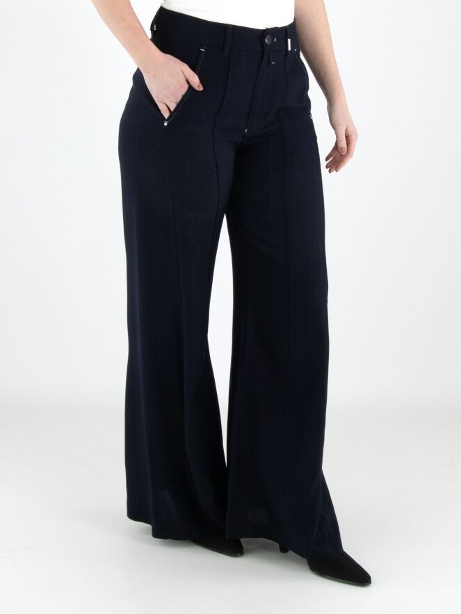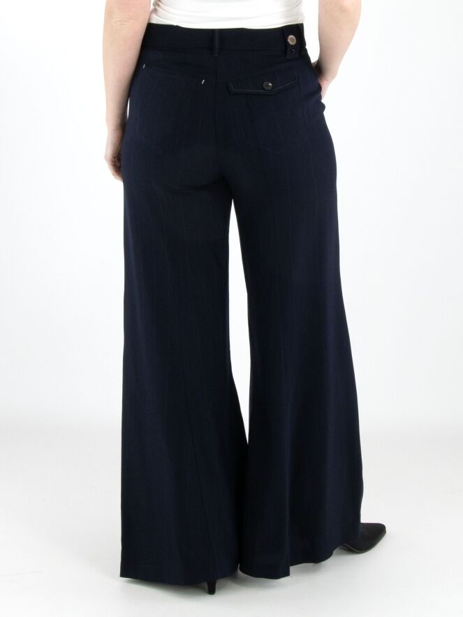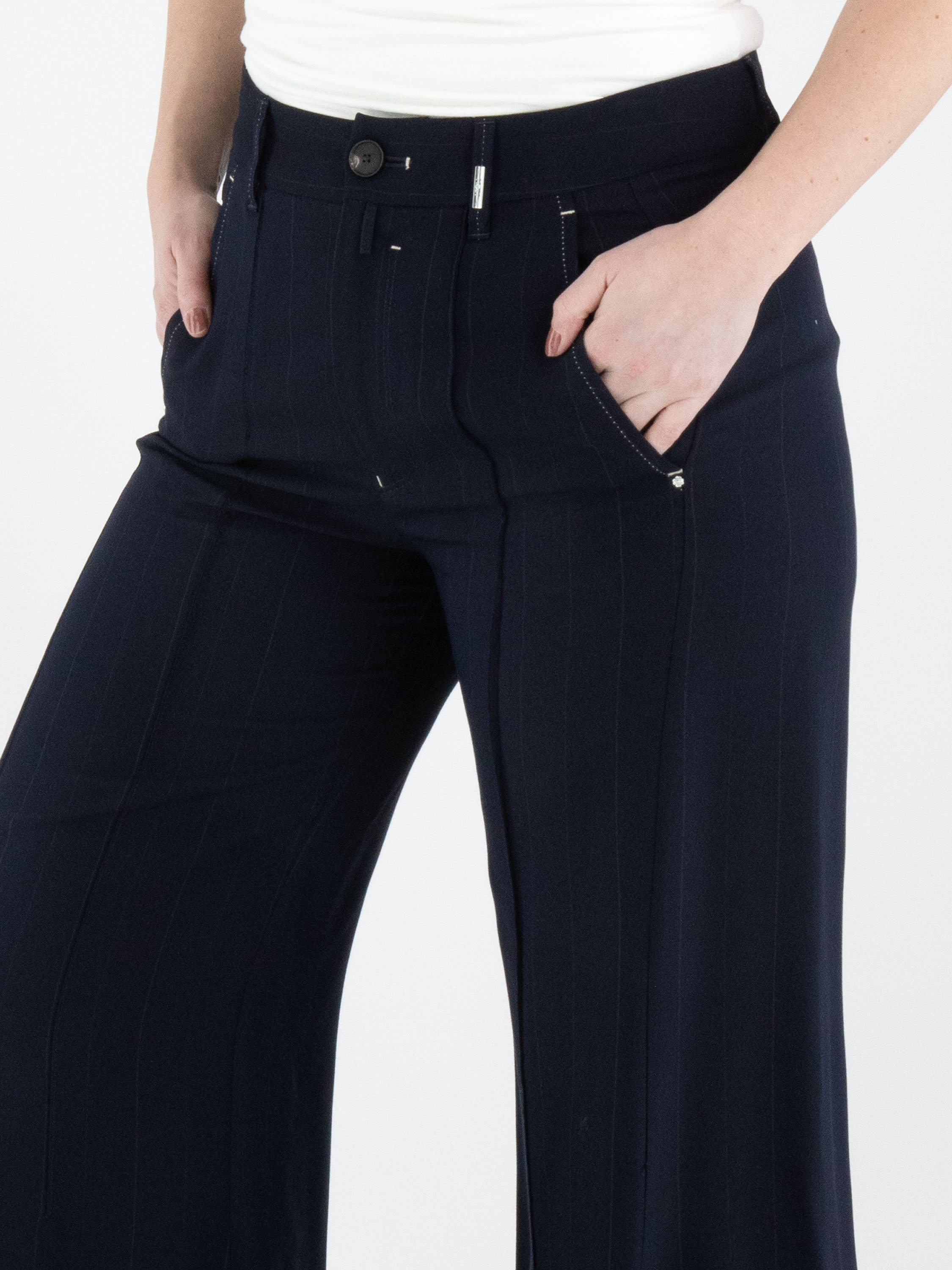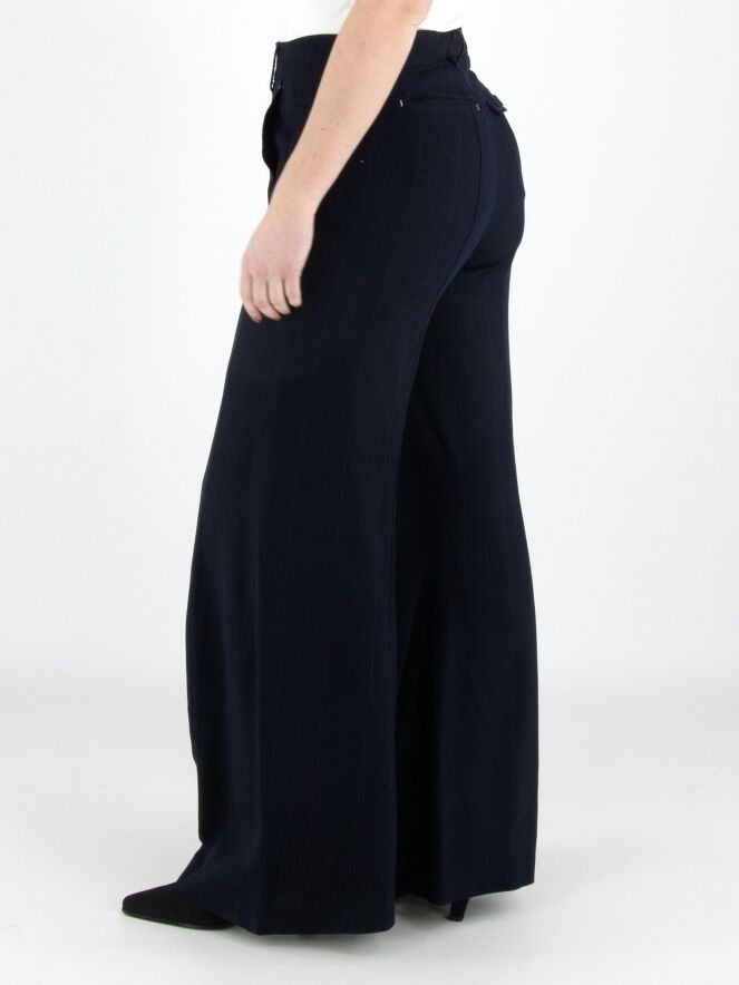 Een design flared broek van High die aan de onderkant zeer wijd uitloopt. De stof is uitgevoerd in een krijtstreep. Aan de voorzijde loopt één stiknaad en één omgekeerde stiknaad. In de rand van de steekzakken is een witte stikdraad verwerkt. Aan de achterkant heeft de broek twee zakken, waarvan één met een omslag. Deze broek mag niet worden gewassen.