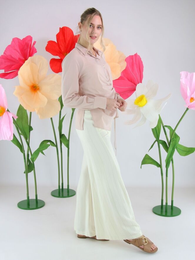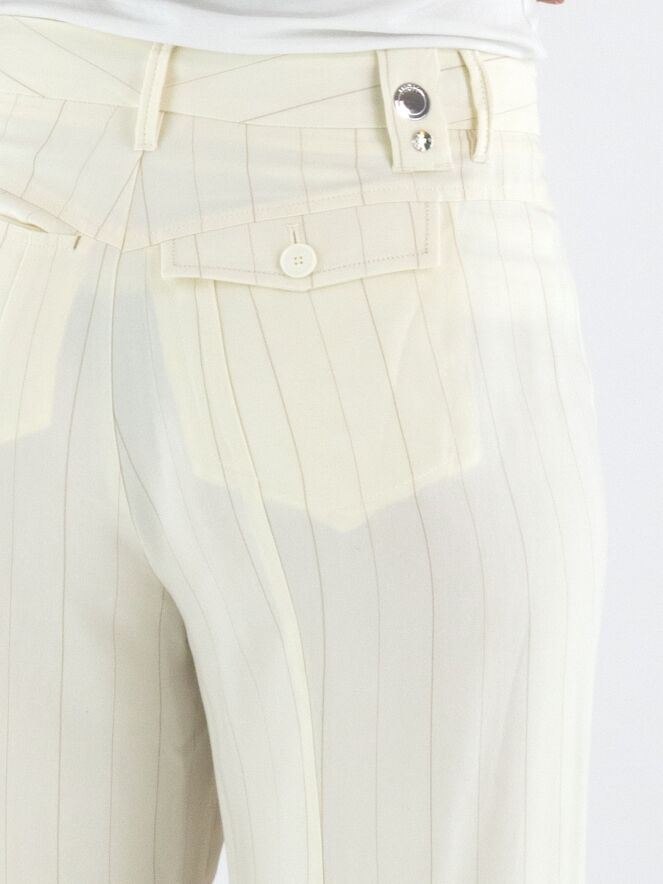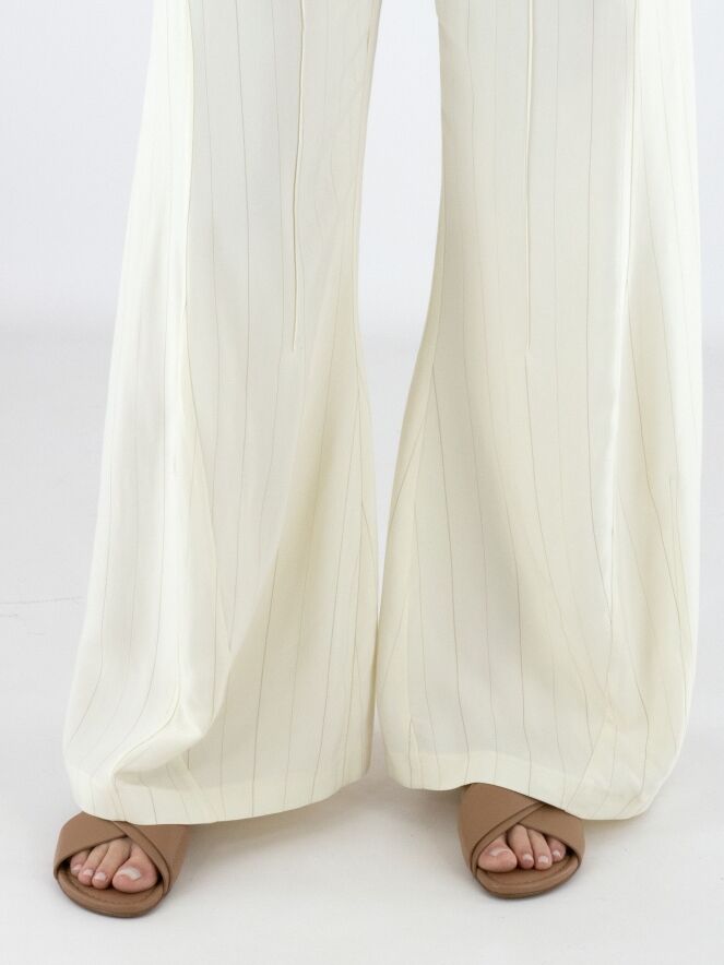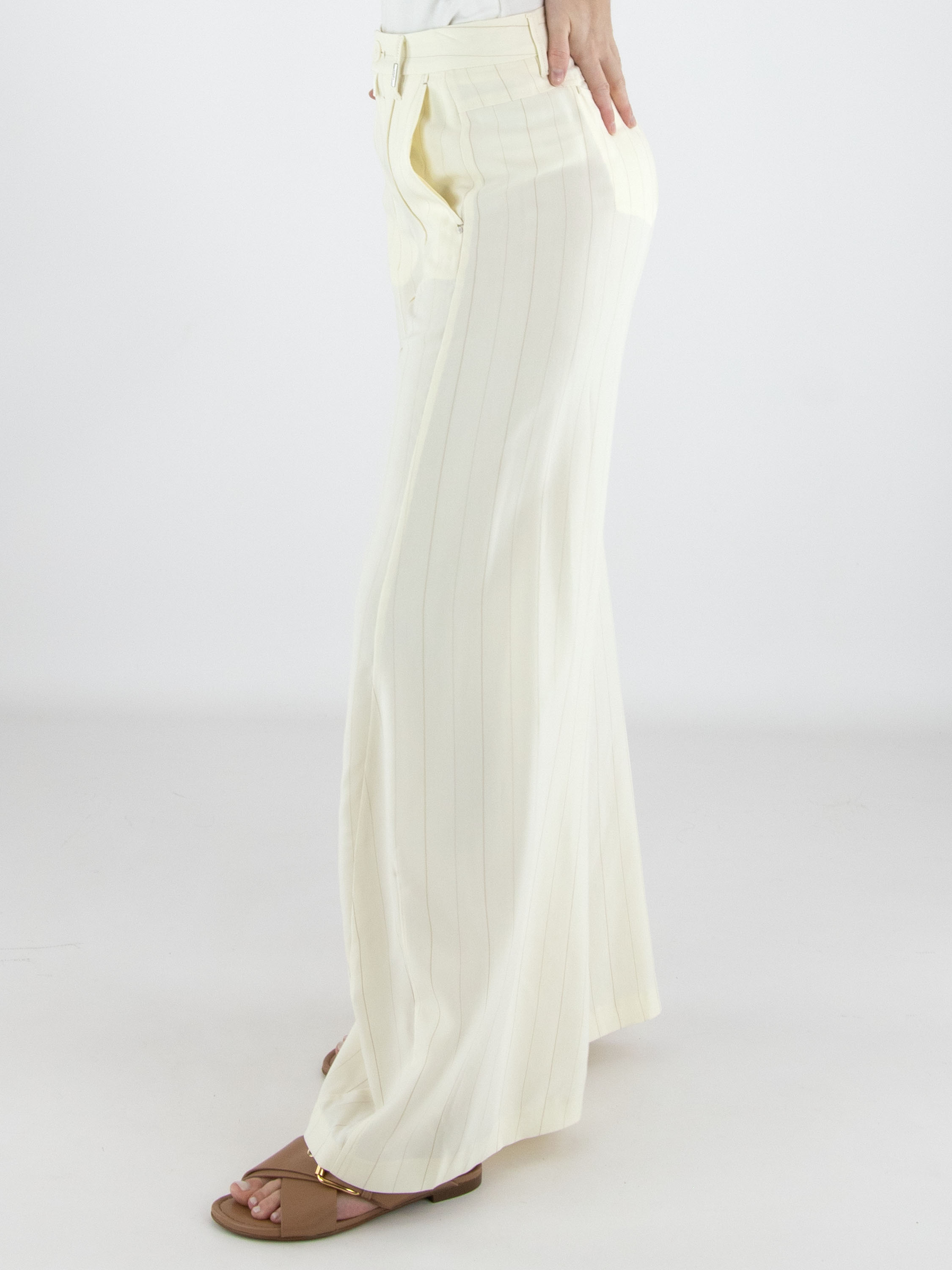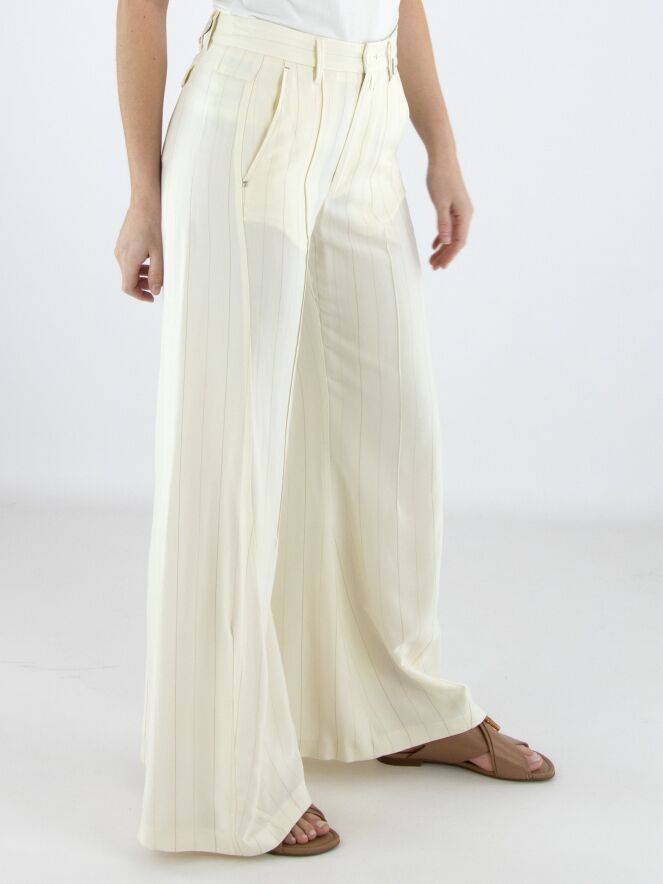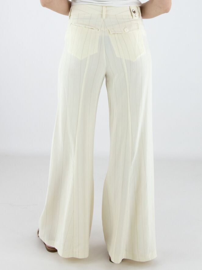 Wijde broek van High in een verfijnd krijtstreeppatroon in de kleuren roomwit en camel. De pijpen lopen uit in een subtiele flared lijn, wat zorgt voor een vrouwelijke en eigentijdse uitstraling. De broek is voorzien van steekzakken en mag niet worden gewassen.