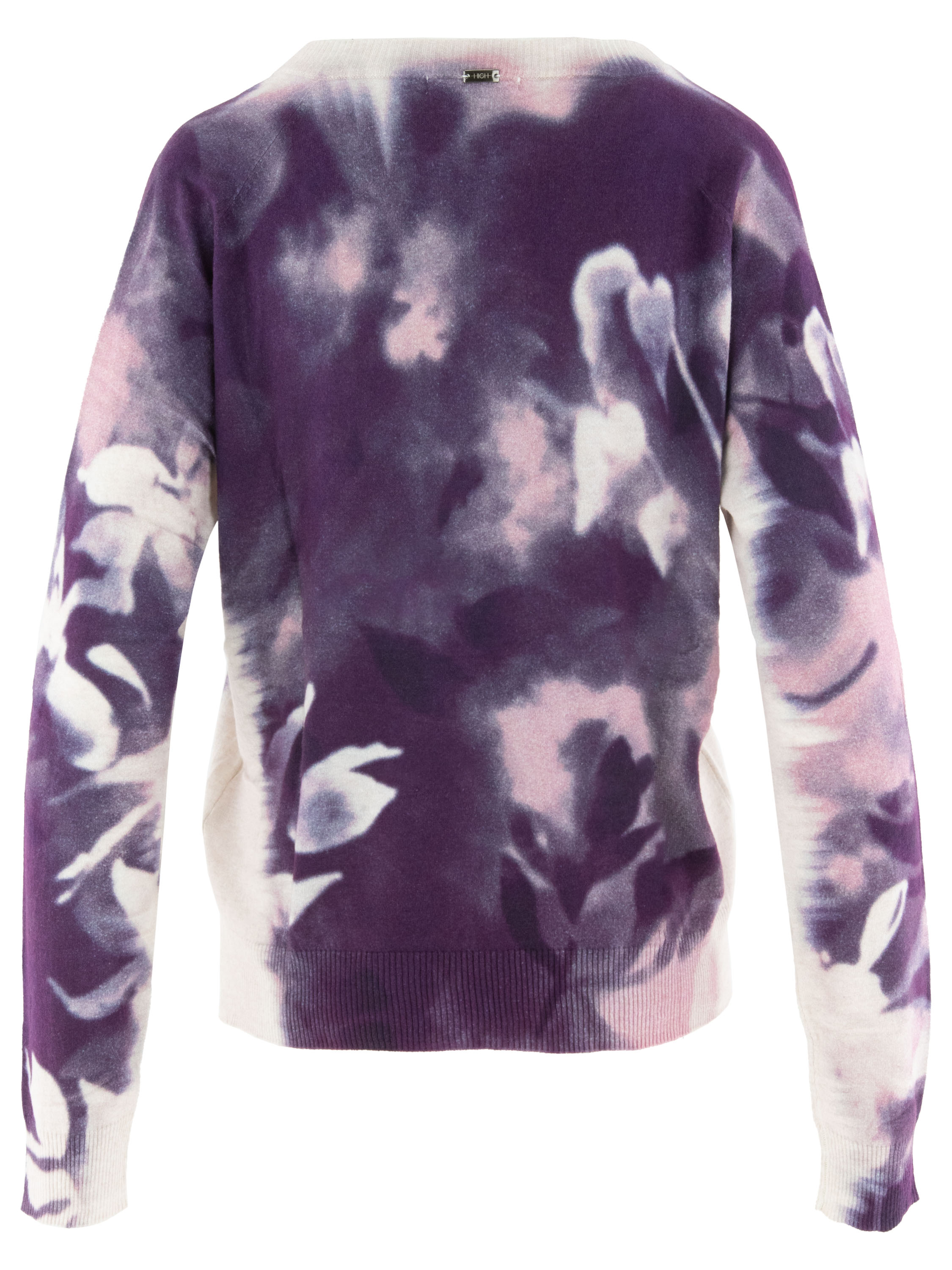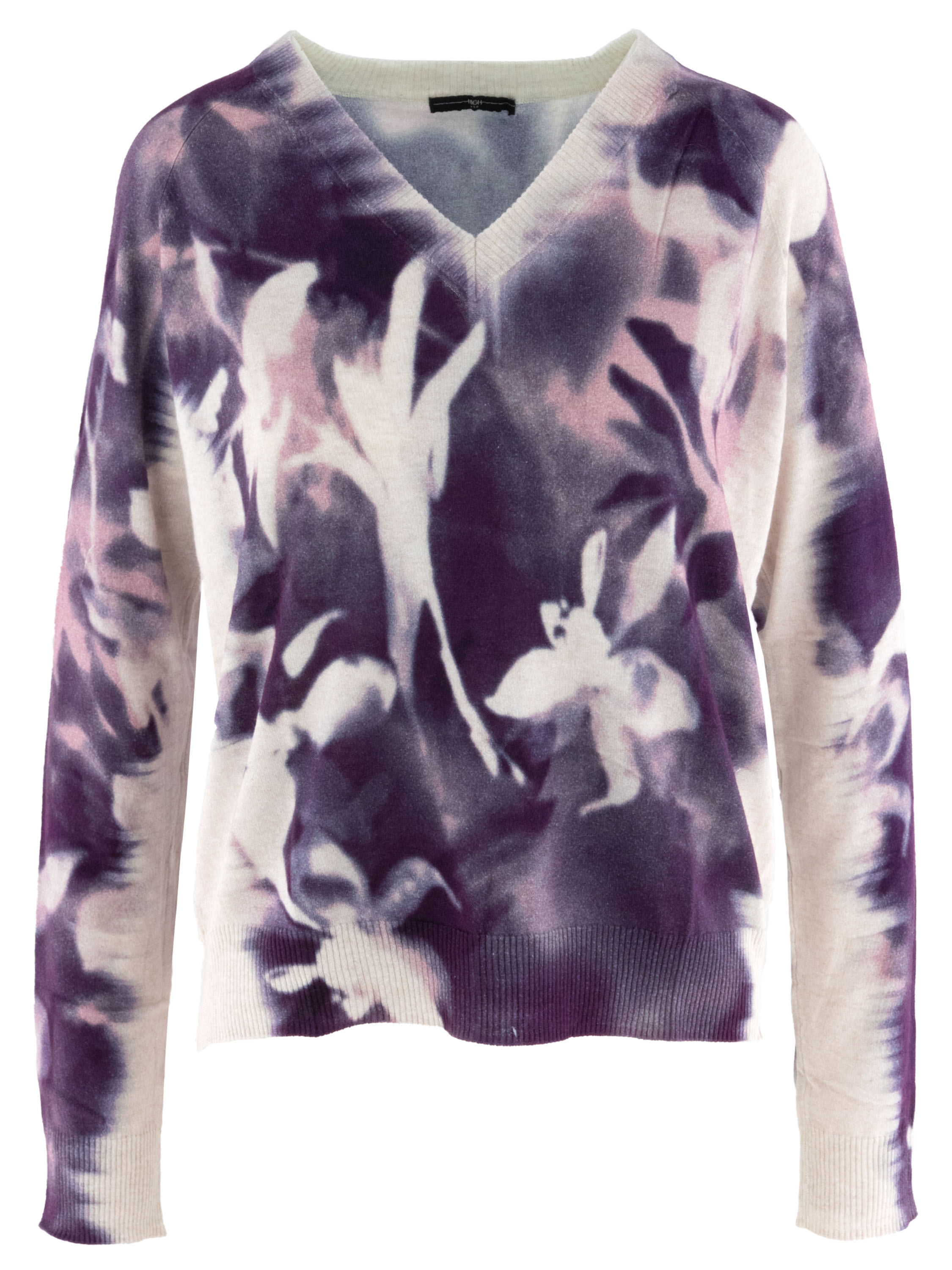 Een pullover van High met een grafische bloemenprint in meerdere tinten paars en lila op een roomwitte achtergrond. De pullover heeft een V-hals met langs de rand een fijn geribbelde tricot boord. Deze pullover kan met de hand worden gewassen.