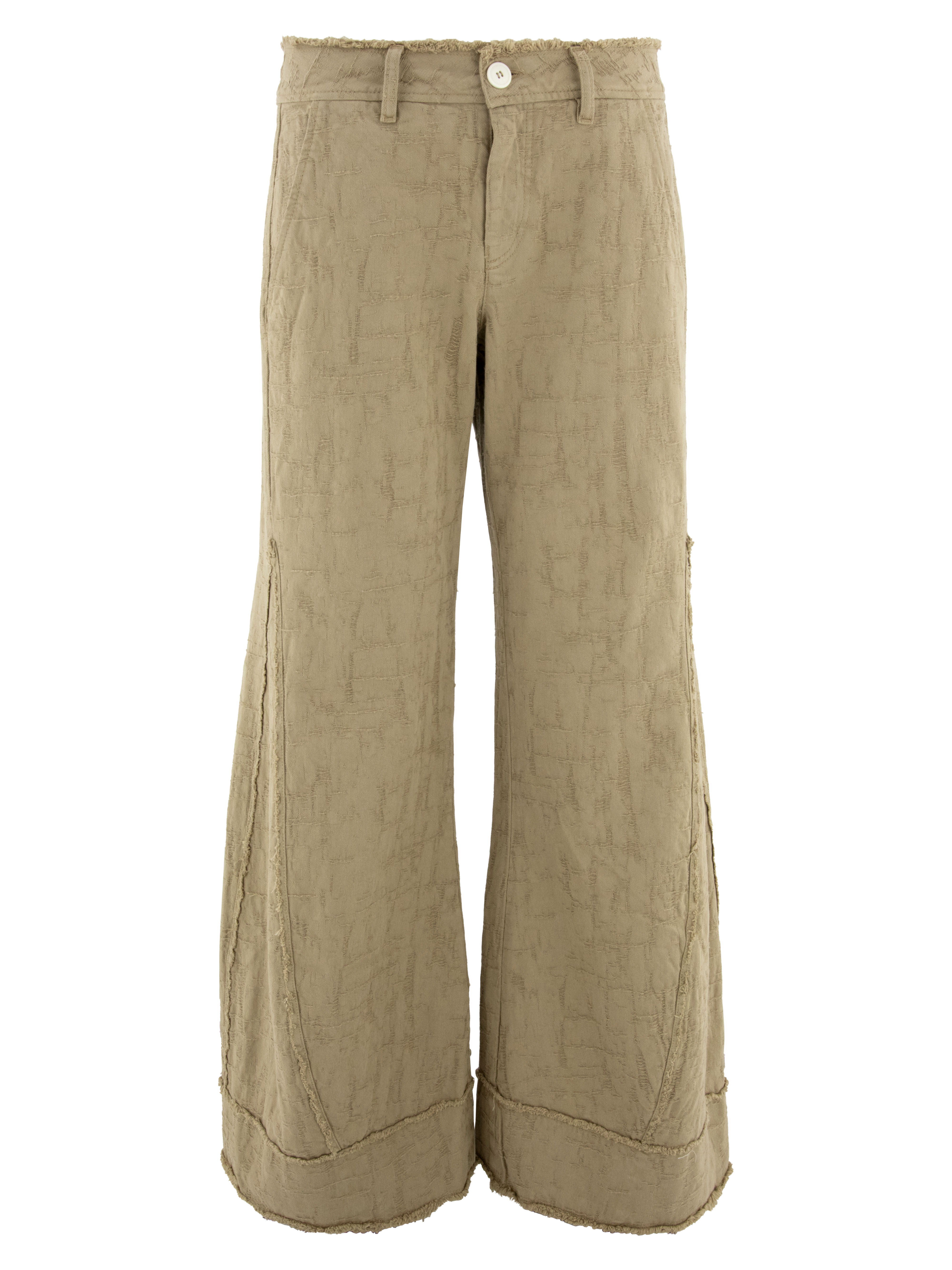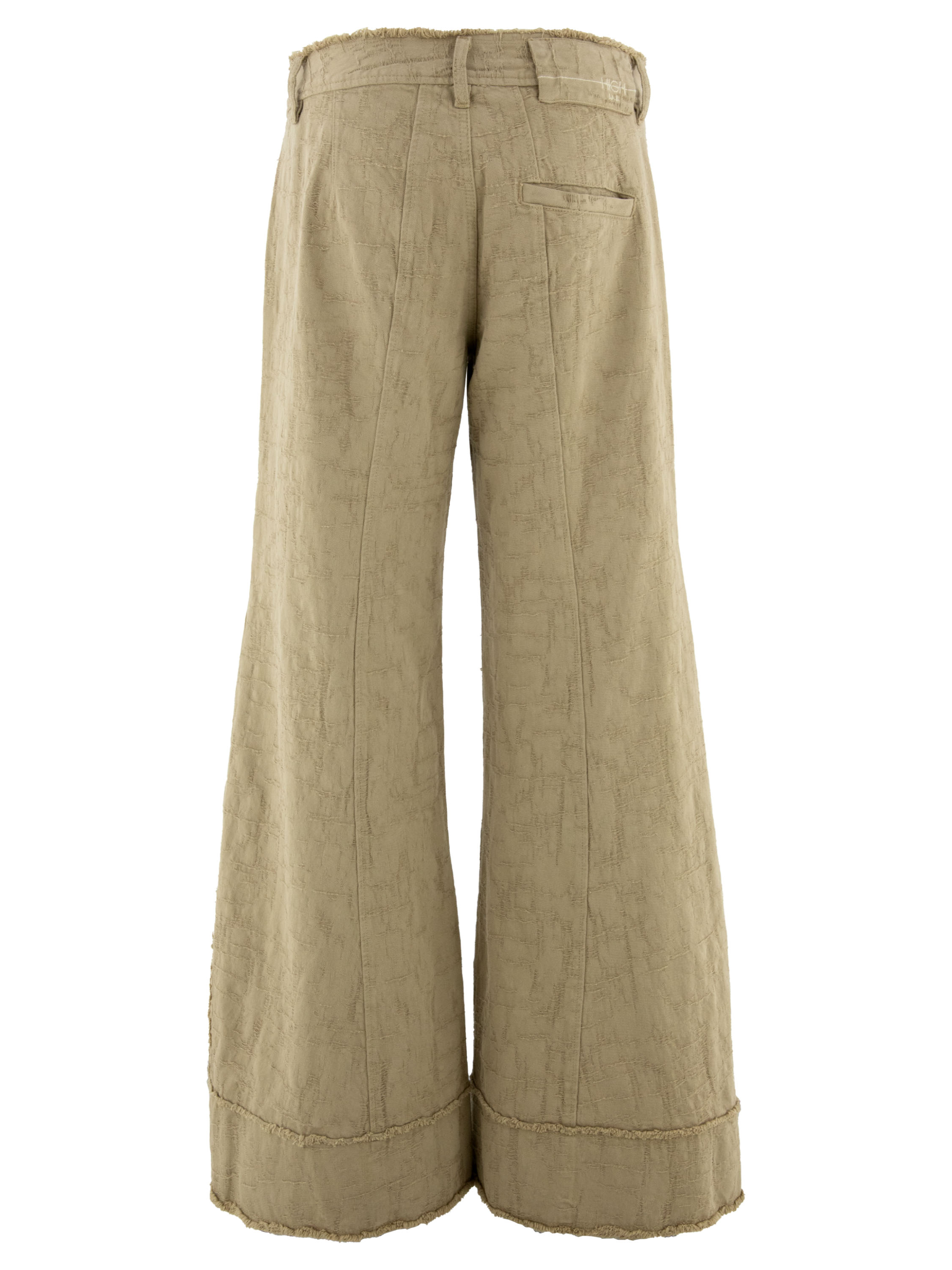 Een broek van High Lab in een camelkleur. De stof heeft een zichtbare structuur, waarbij de randen fijn zijn gerafeld. Boven de knie is aan beide zijkanten een spie ingezet die zorgt voor de wijde pijpen; ook hier zijn de randen subtiel gerafeld. De broek heeft steekzakken en kan op 30 graden worden gewassen.
