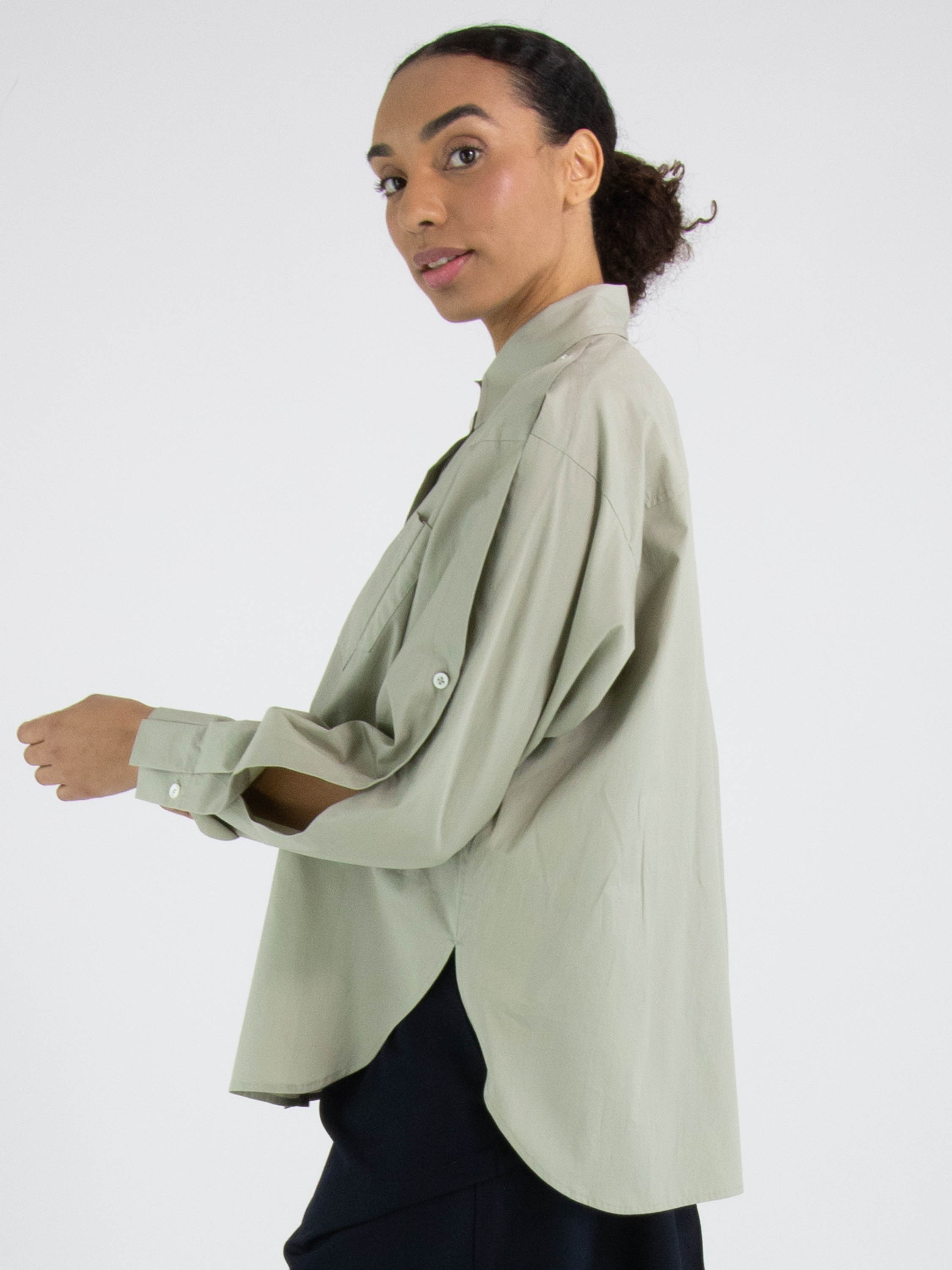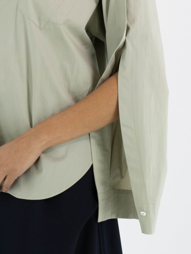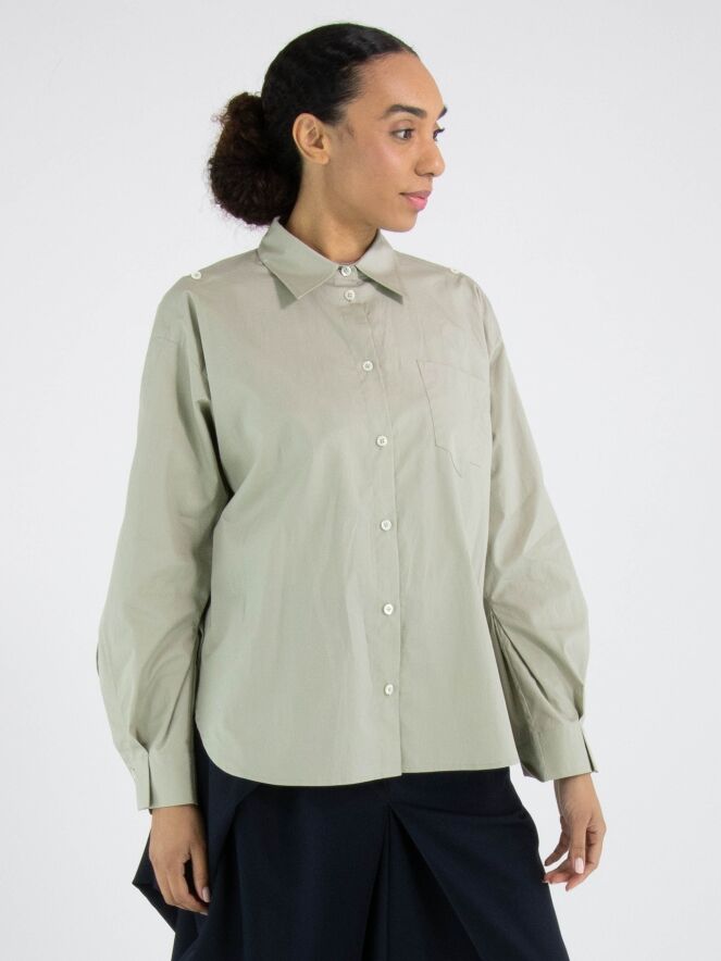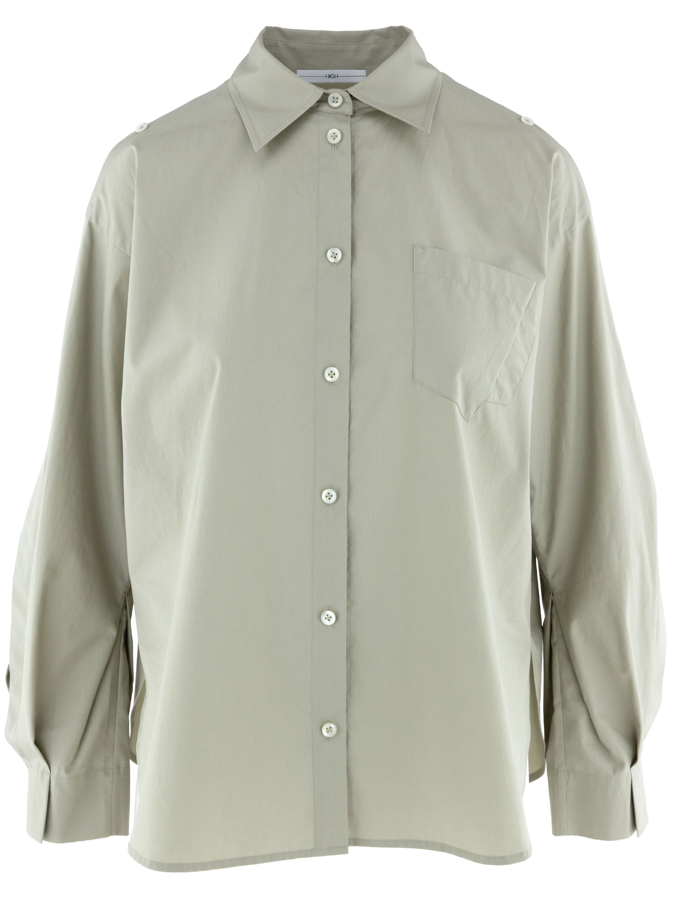 Een blouse van High in een zachte olijfgroene kleur. De borstzak heeft een dubbele asymmetrische stiknaad. De bovenkant van de lange mouwen is vanaf de schouder open en met knoopsluitingen deels gesloten. Deze blouse mag op de hand worden gewassen.