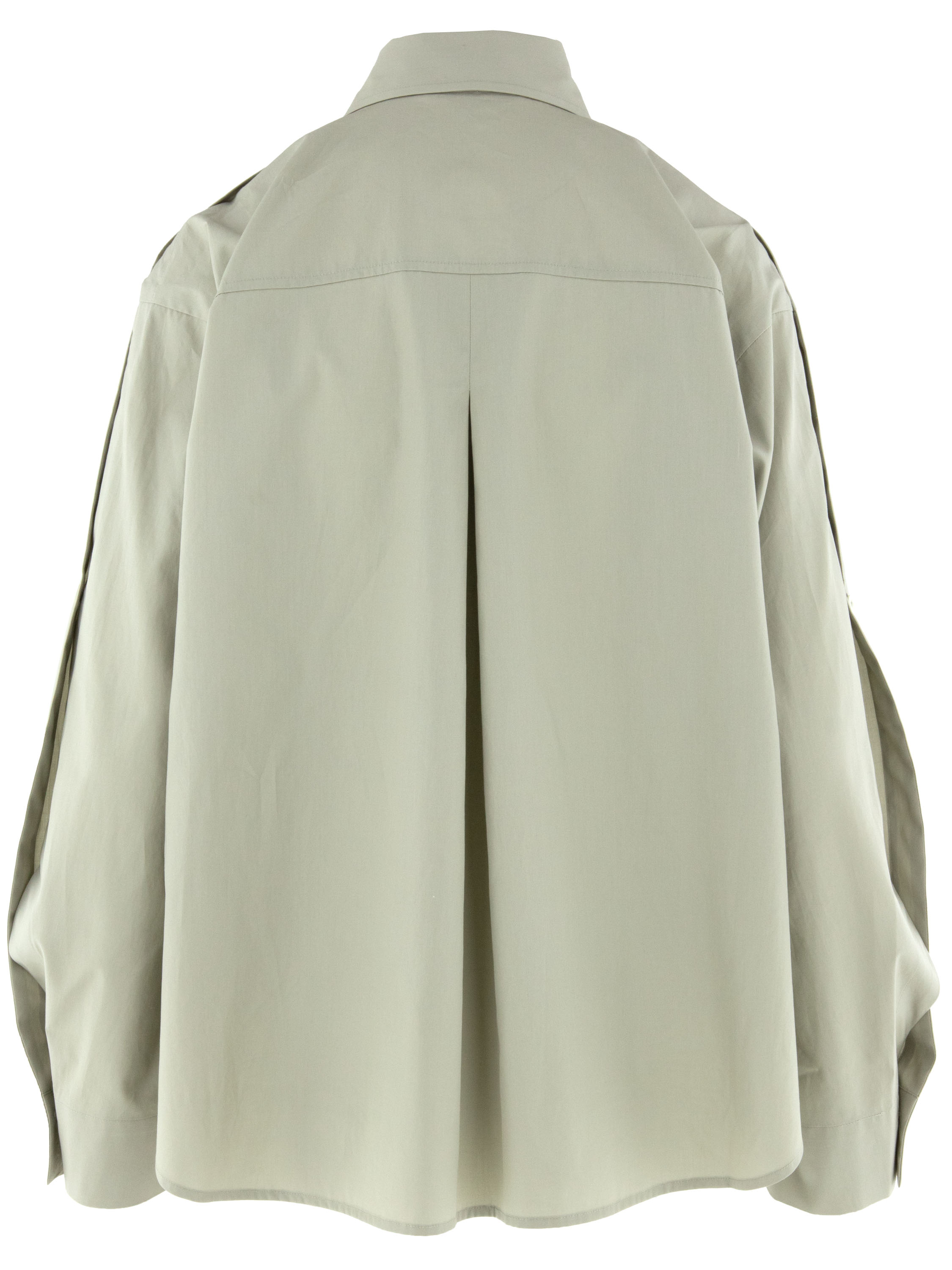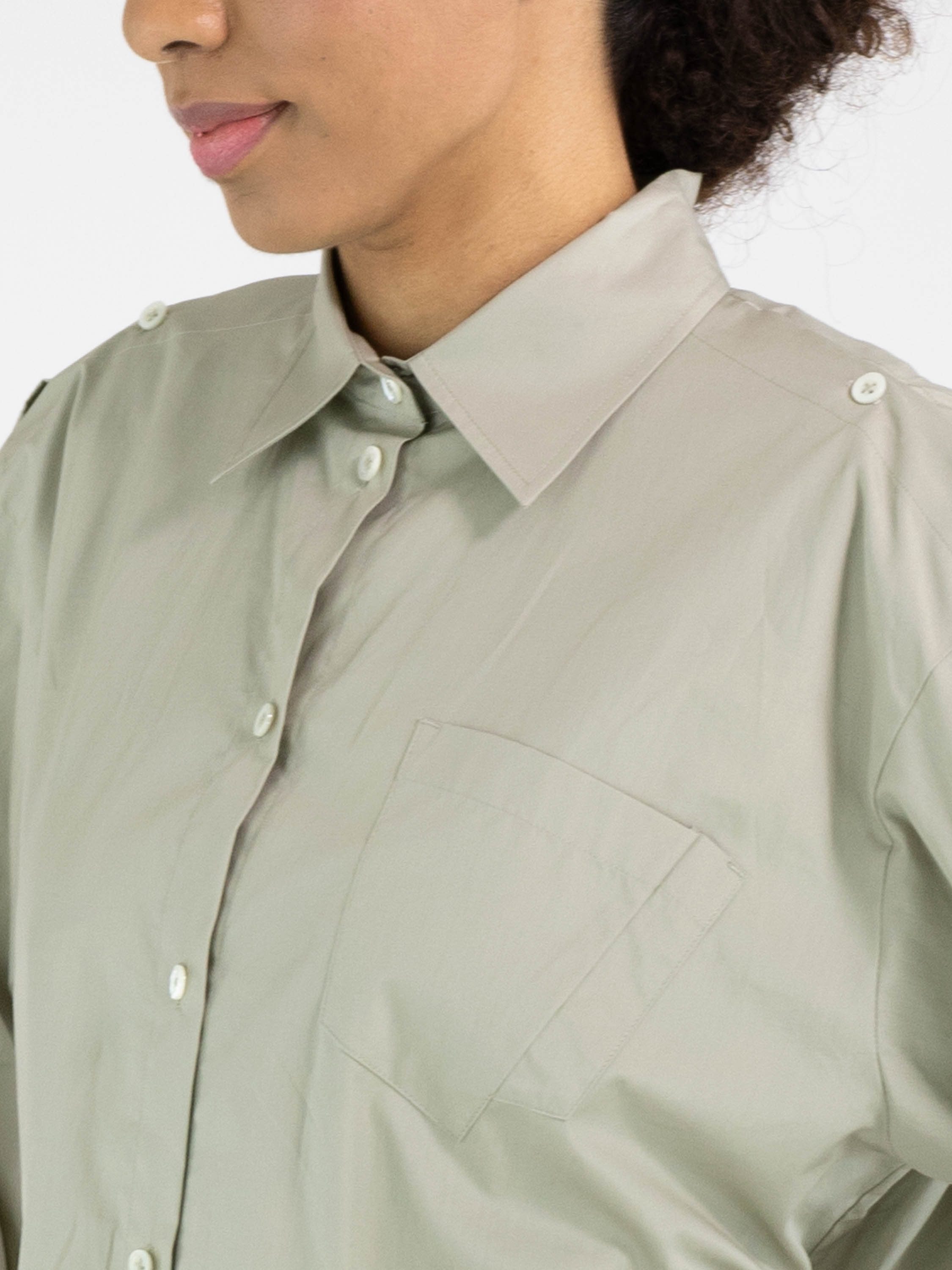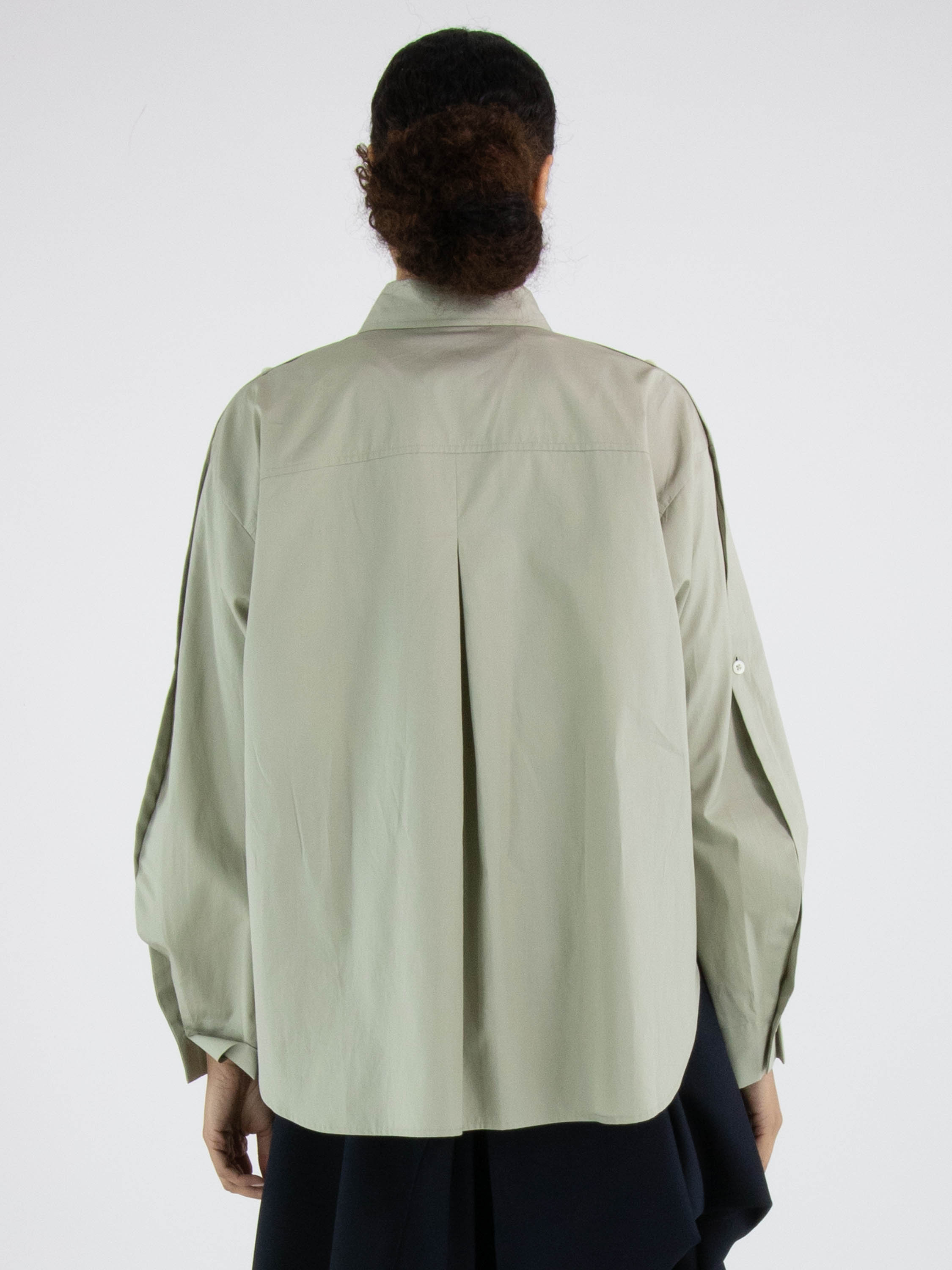 Een blouse van High in een zachte olijfgroene kleur. De borstzak heeft een dubbele asymmetrische stiknaad. De bovenkant van de lange mouwen is vanaf de schouder open en met knoopsluitingen deels gesloten. Deze blouse mag op de hand worden gewassen.