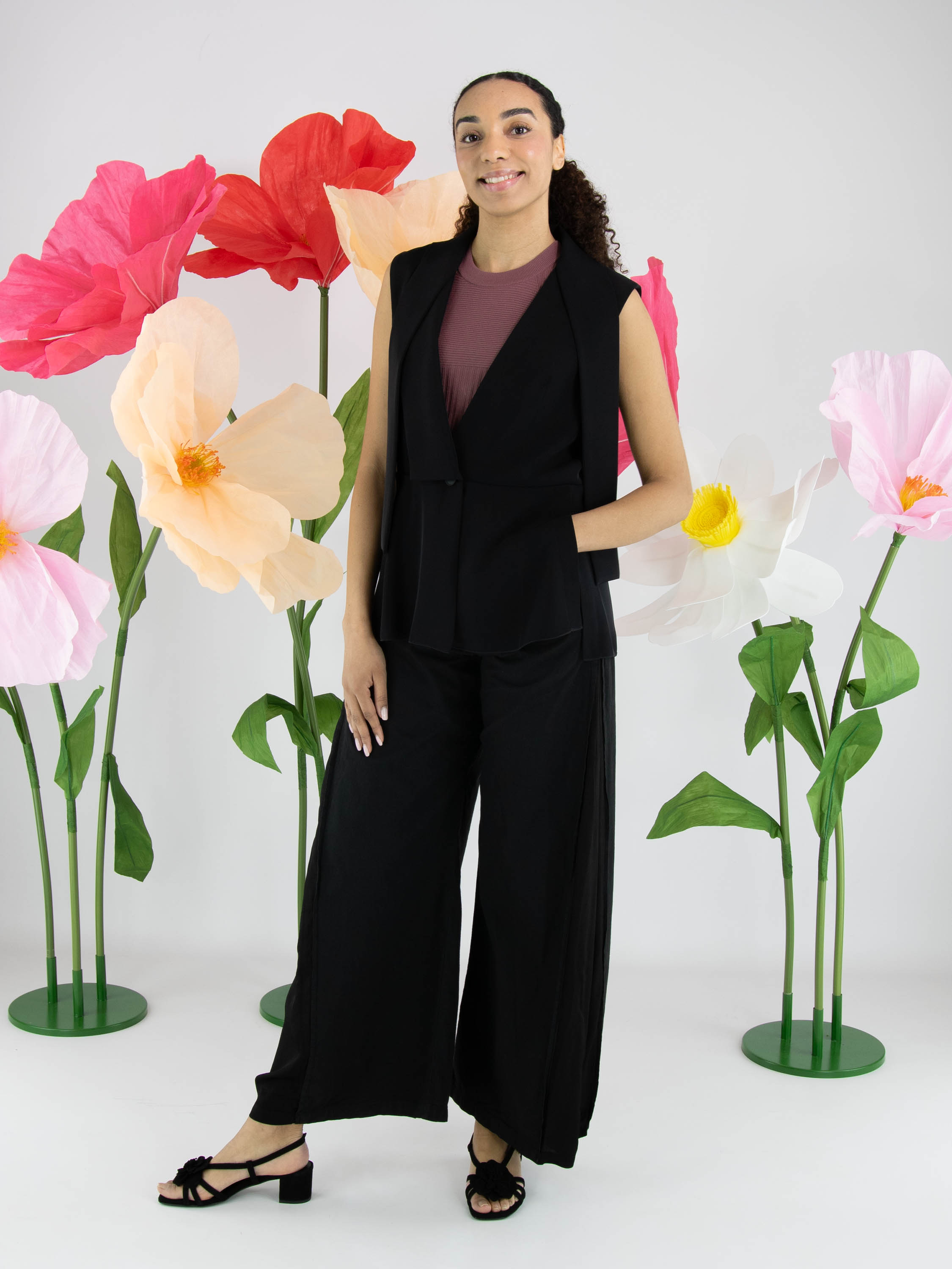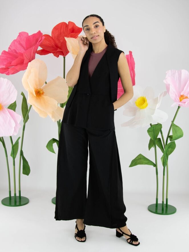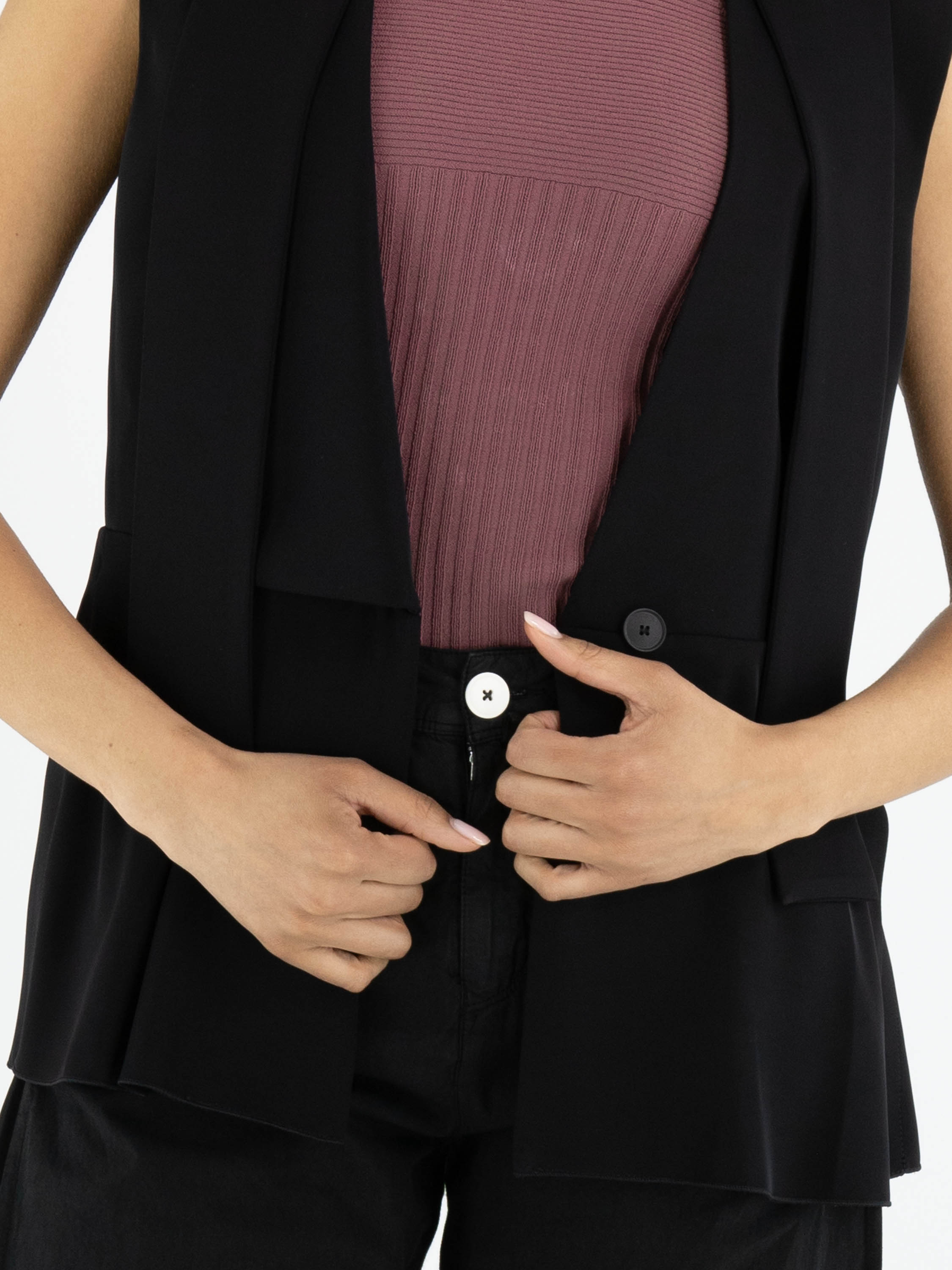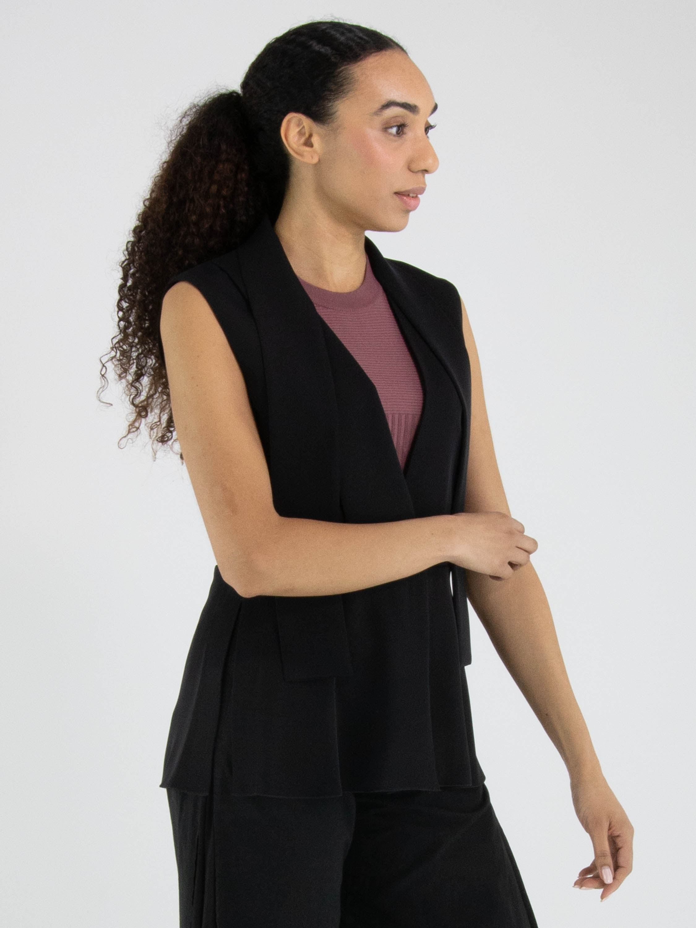 Gilet van High in de kleur zwart. Het gilet heeft aan de rechterzijde een kraag, terwijl de linkerzijde kraagloos is, wat zorgt voor een asymmetrisch en eigentijds karakter. Vanuit de schouders vallen twee lange linten in dezelfde stof, die optisch het effect van een shawlkraag creëren. Ter hoogte van de taille sluit het gilet met één knoop. Aan de zijkanten zijn splitten tot aan de taillelijn aangebracht voor extra bewegingsvrijheid. Dit exclusieve designergilet kan op 30 graden worden gewassen.