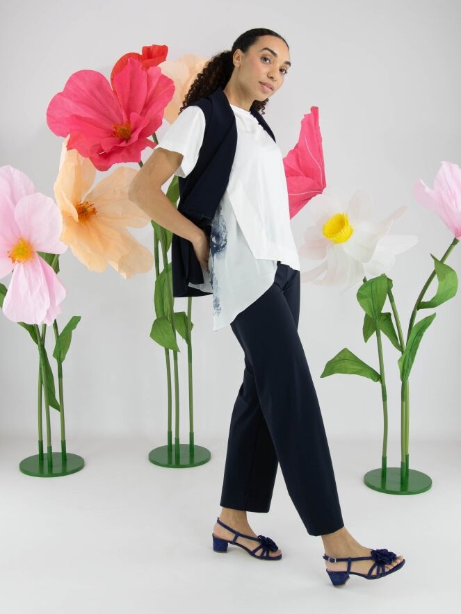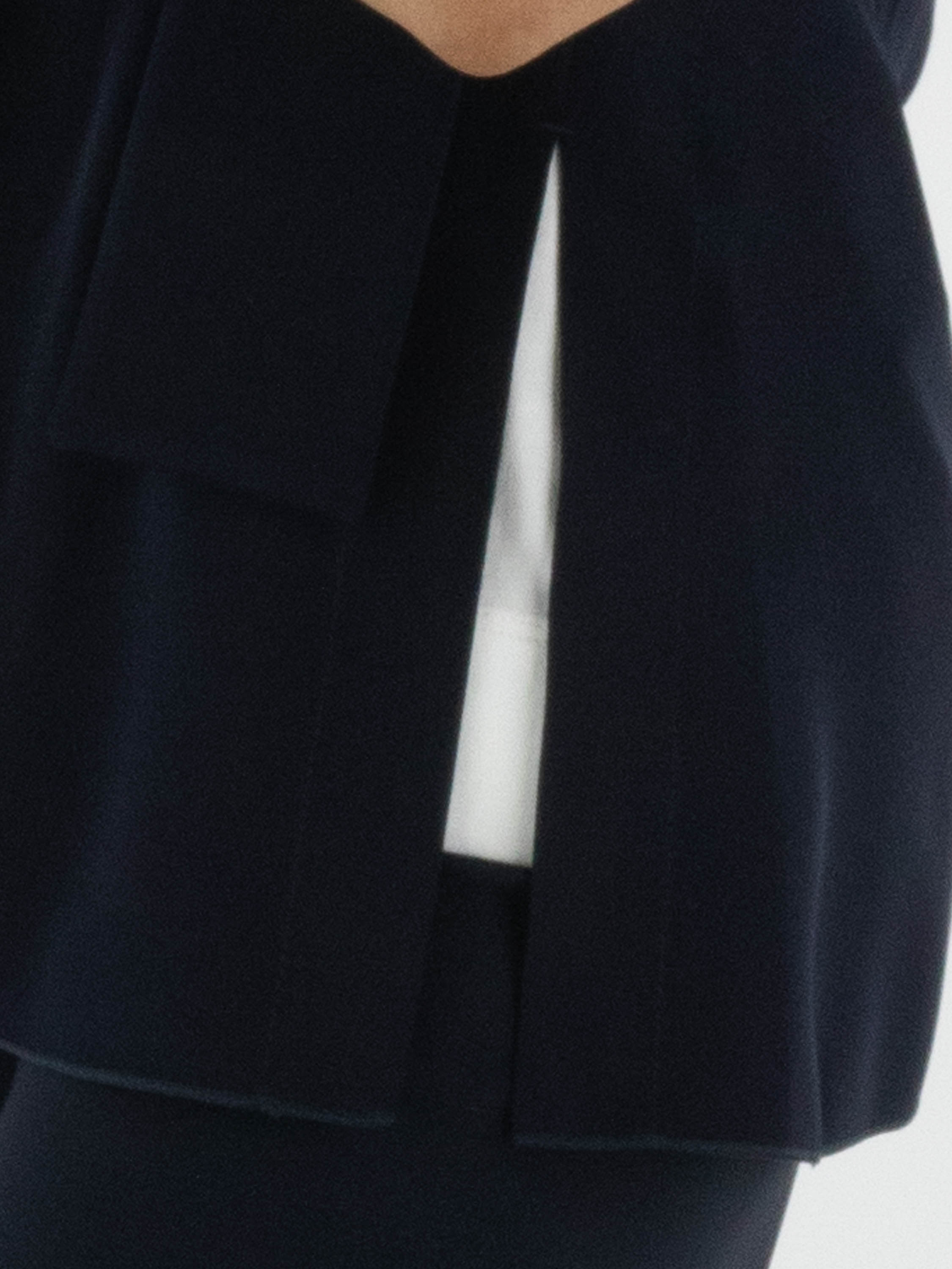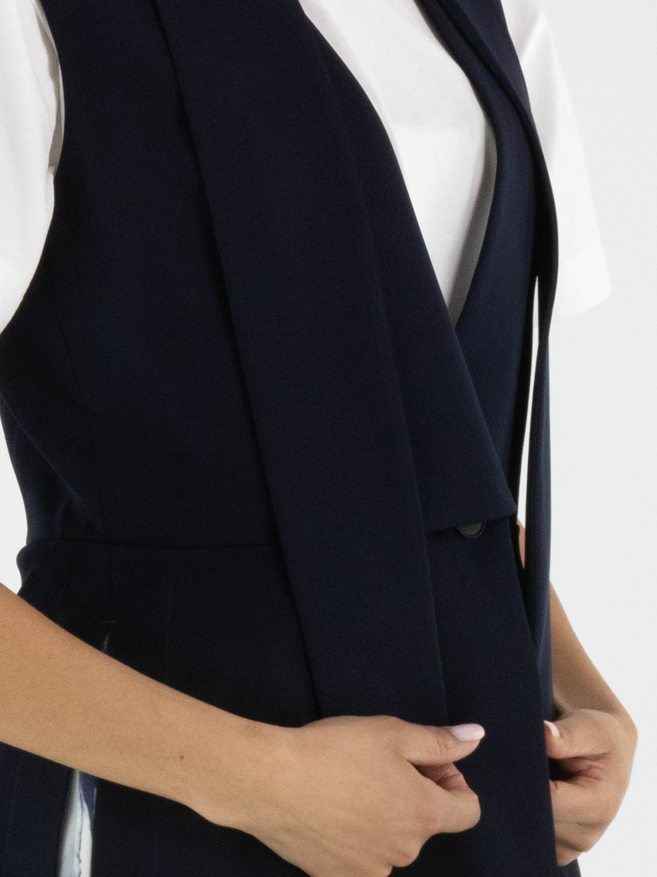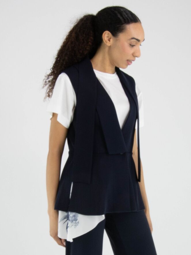Gilet van High in de kleur marineblauw. Het model heeft aan de rechterzijde een kraag, terwijl de linkerzijde kraagloos is, wat zorgt voor een uitgesproken asymmetrisch effect. Vanuit de schouders vallen twee lange linten in dezelfde stof, die optisch doen denken aan een elegante shawlkraag. Ter hoogte van de taille sluit het gilet met één knoop. Aan de zijkanten zijn splitjes verwerkt tot aan de taillelijn, wat het silhouet een luchtige en eigentijdse uitstraling geeft. Dit exclusieve designergilet kan op 30 graden worden gewassen.