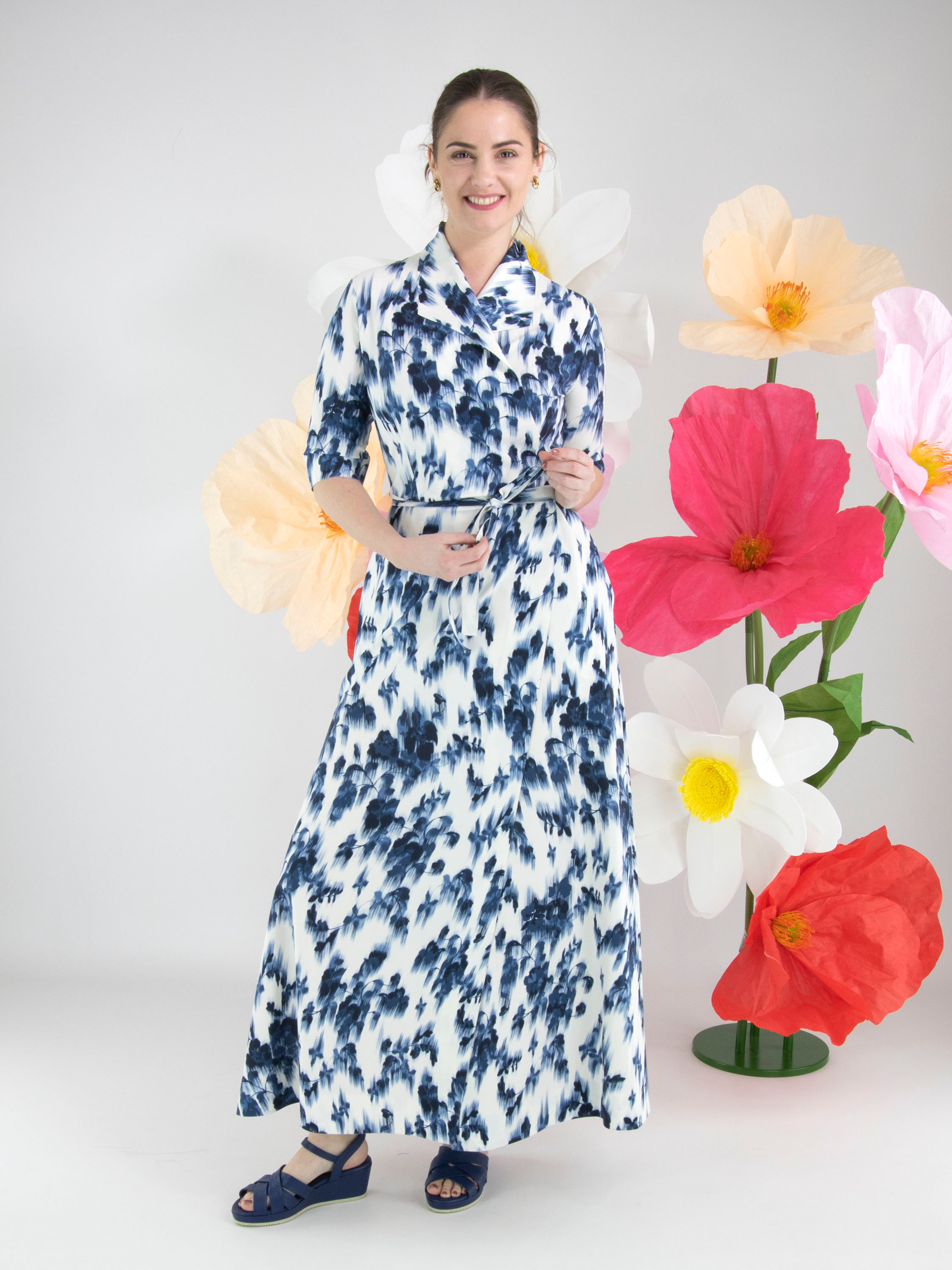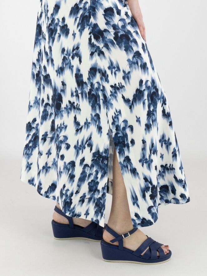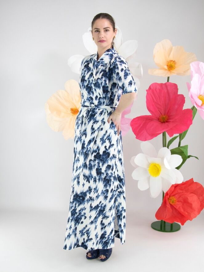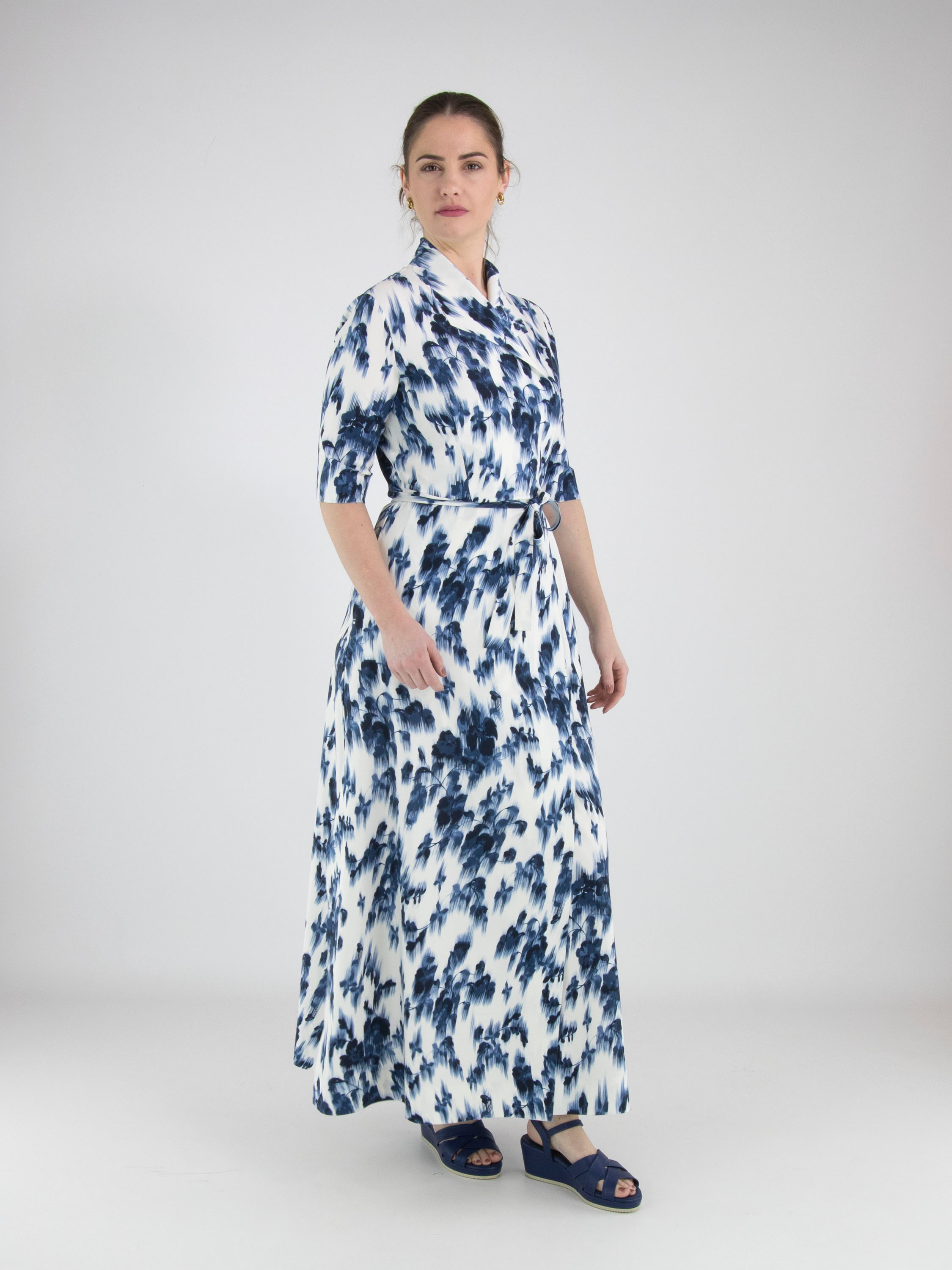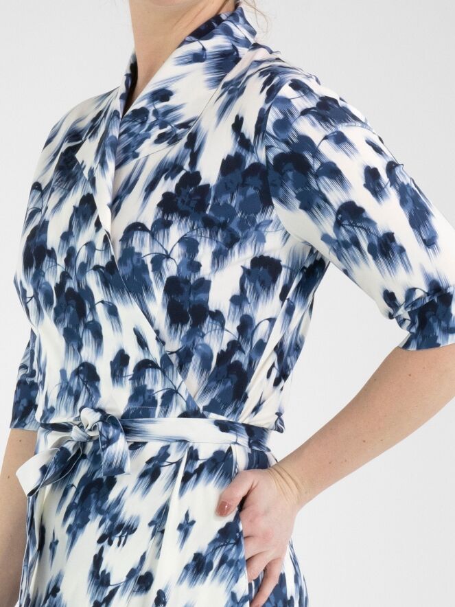 Een overslagjurk van High Tech in een geveegde bloemenprint met meerdere tinten blauw op een witte achtergrond. De jurk heeft korte mouwen. Aan de onderkant is aan beide zijkanten een split. Deze jurk mag op de hand worden gewassen.
