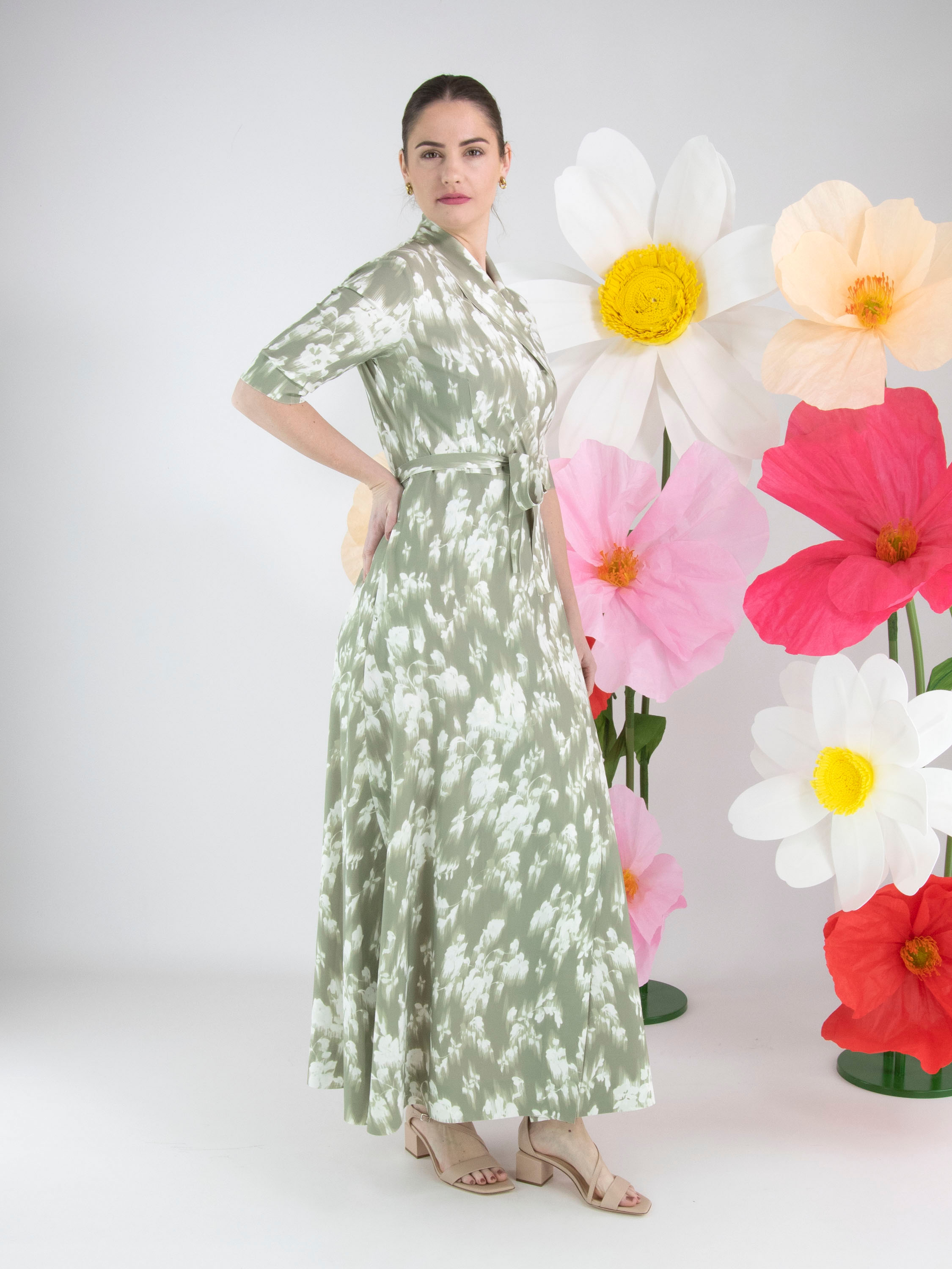 Een overslagjurk van High Tech in een geveegde bloemenprint met meerdere tinten pastel olijfgroen op een roomwitte achtergrond. De jurk heeft korte mouwen. Aan de onderkant is aan beide zijkanten een split. Deze jurk mag op de hand worden gewassen.