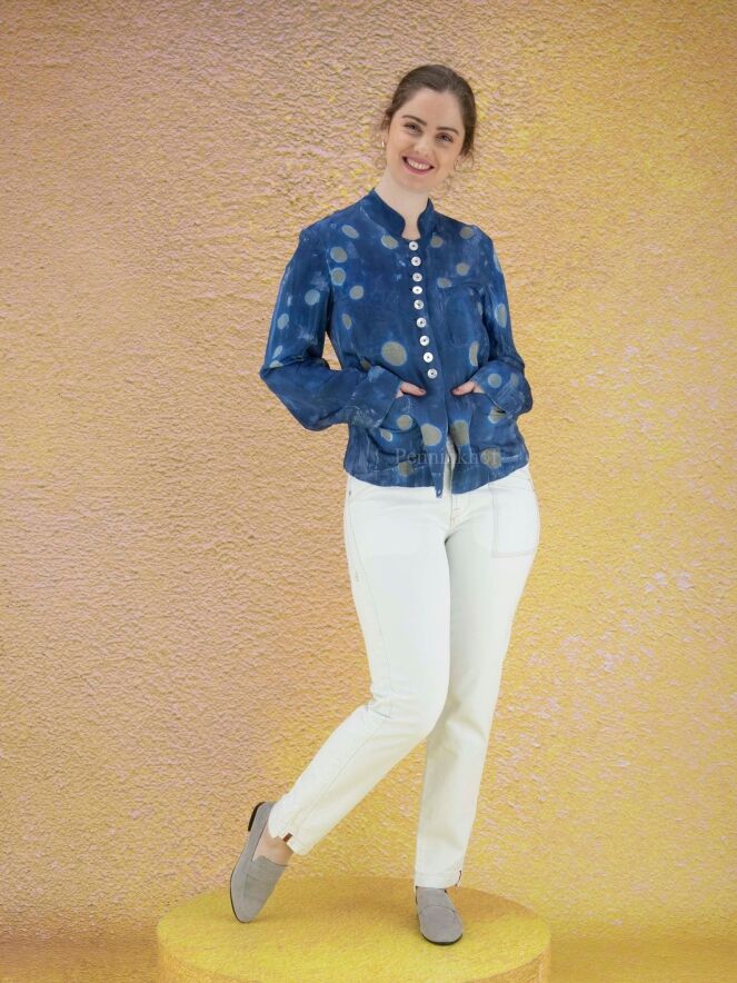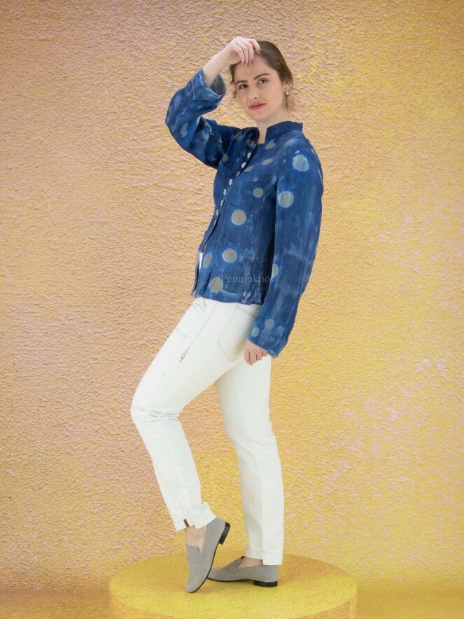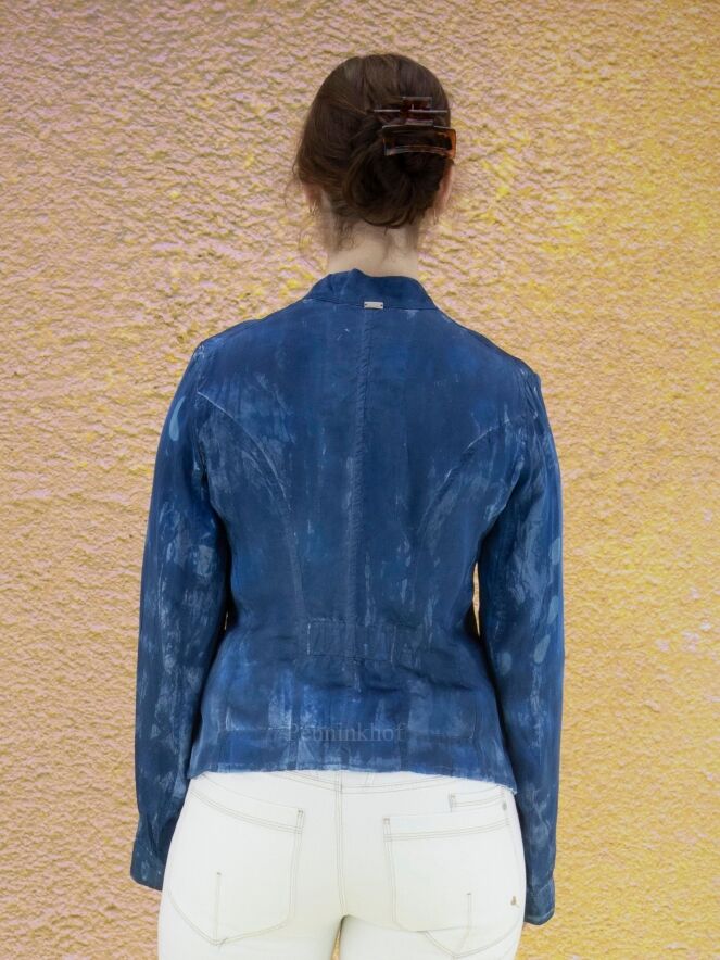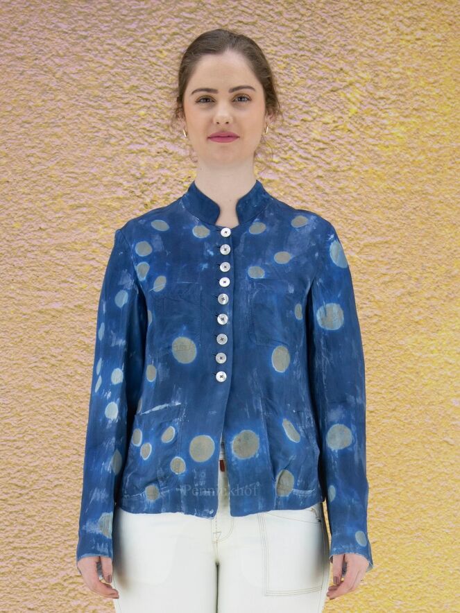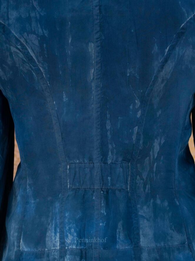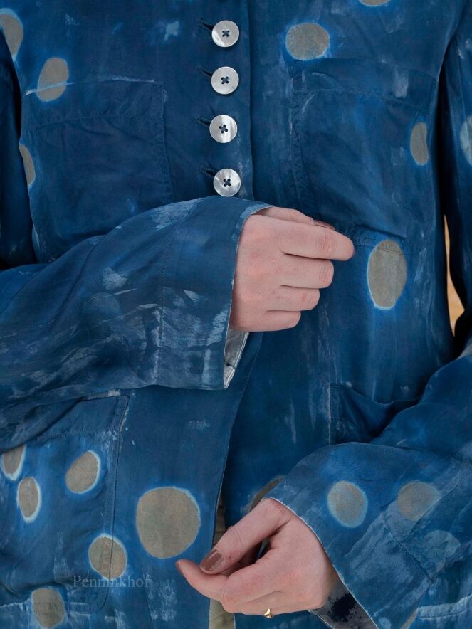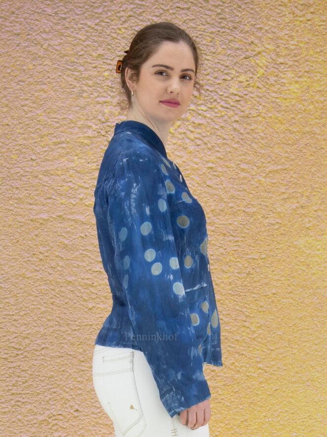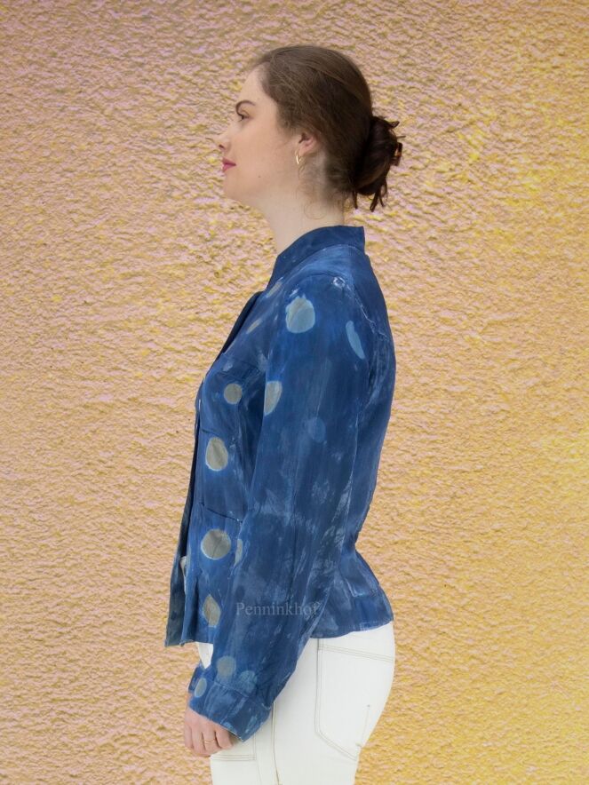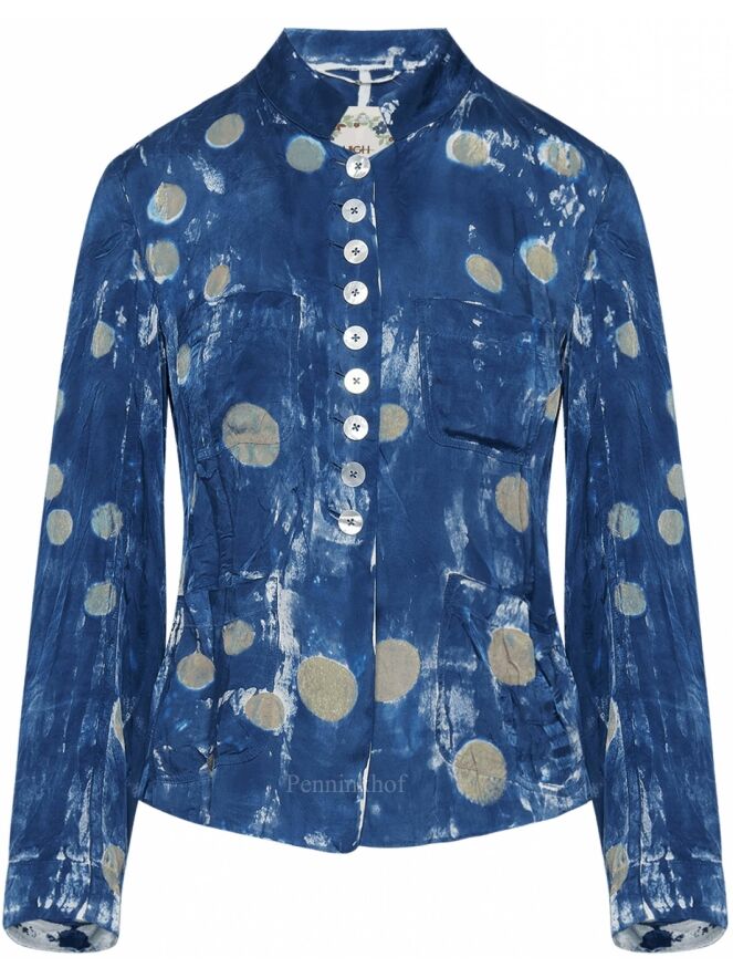 Een gekreukte blazer van High in een batik achtige print in meerdere tinten blauw met willekeurige cirkels in de kleur taupe. De blazer is ongevoerd en mag op de hand worden gewassen.