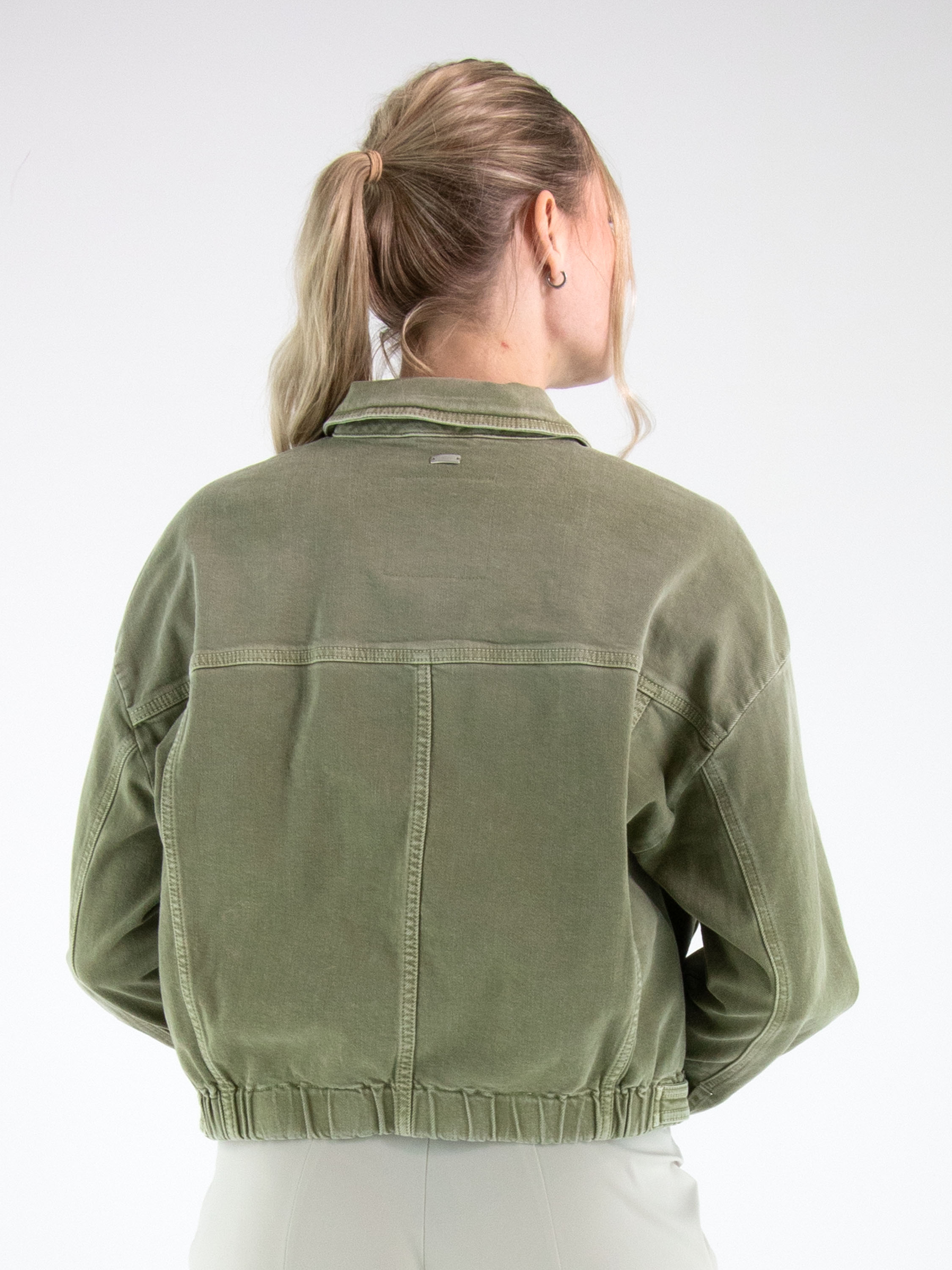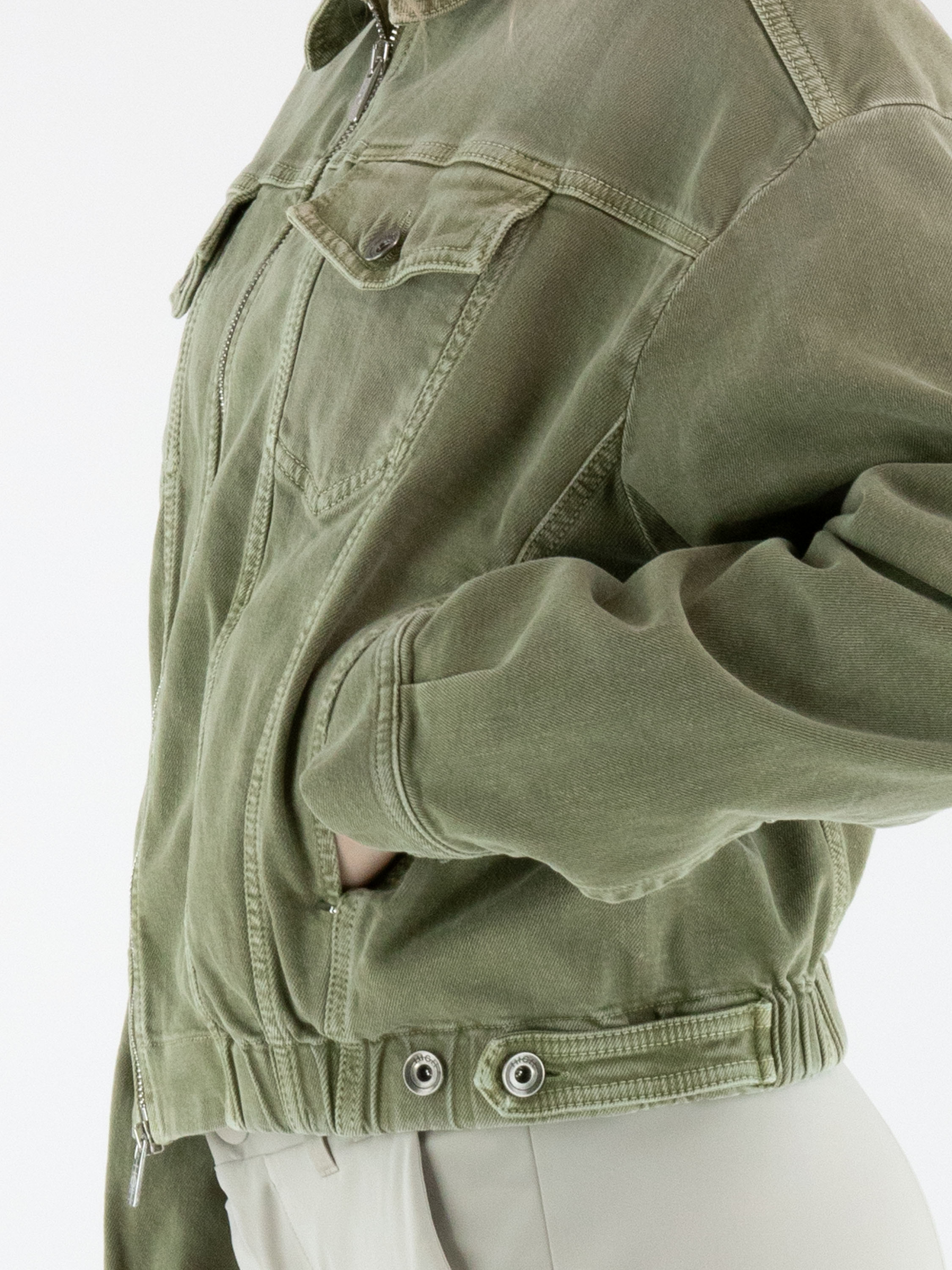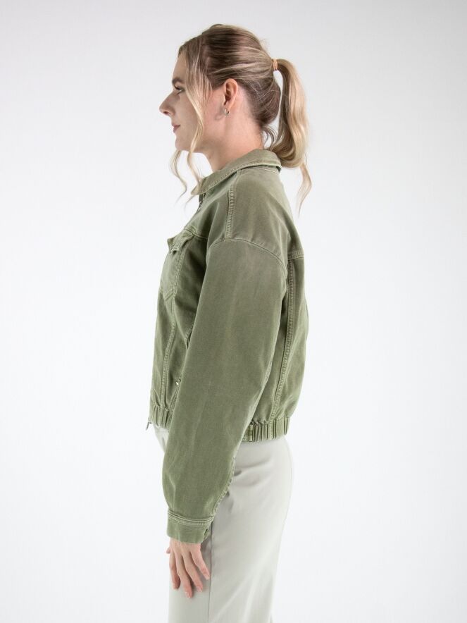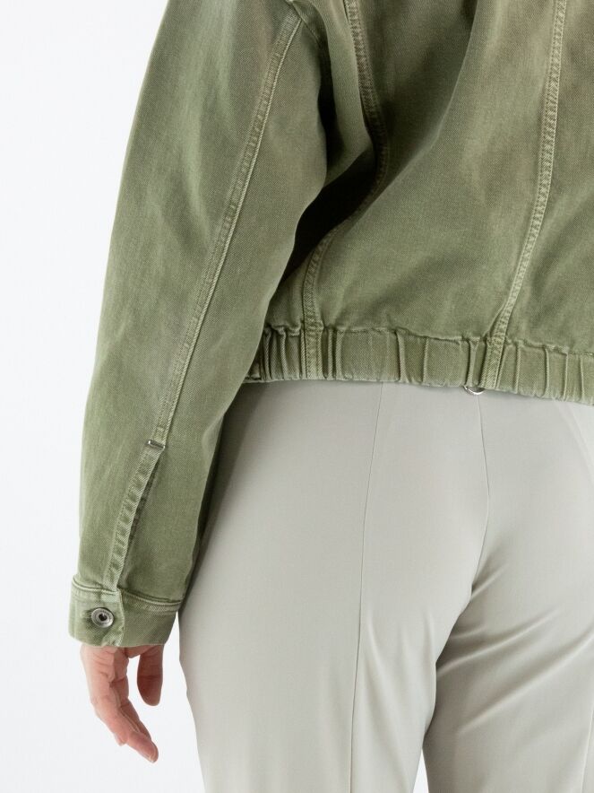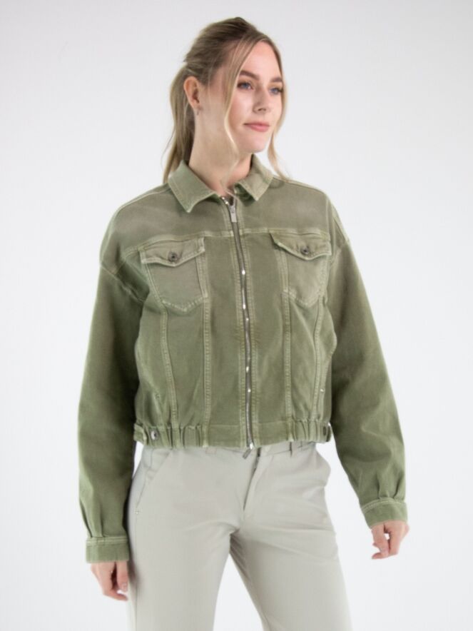Jeansjack van High in een used olijfgroene tint. Het jack heeft een ritssluiting en aan de onderzijde is in de boord een elastische band verwerkt, waardoor de denimstof subtiel wordt geplooid en het model een eigentijdse uitstraling krijgt. Dit jack kan op 30 graden worden gewassen.