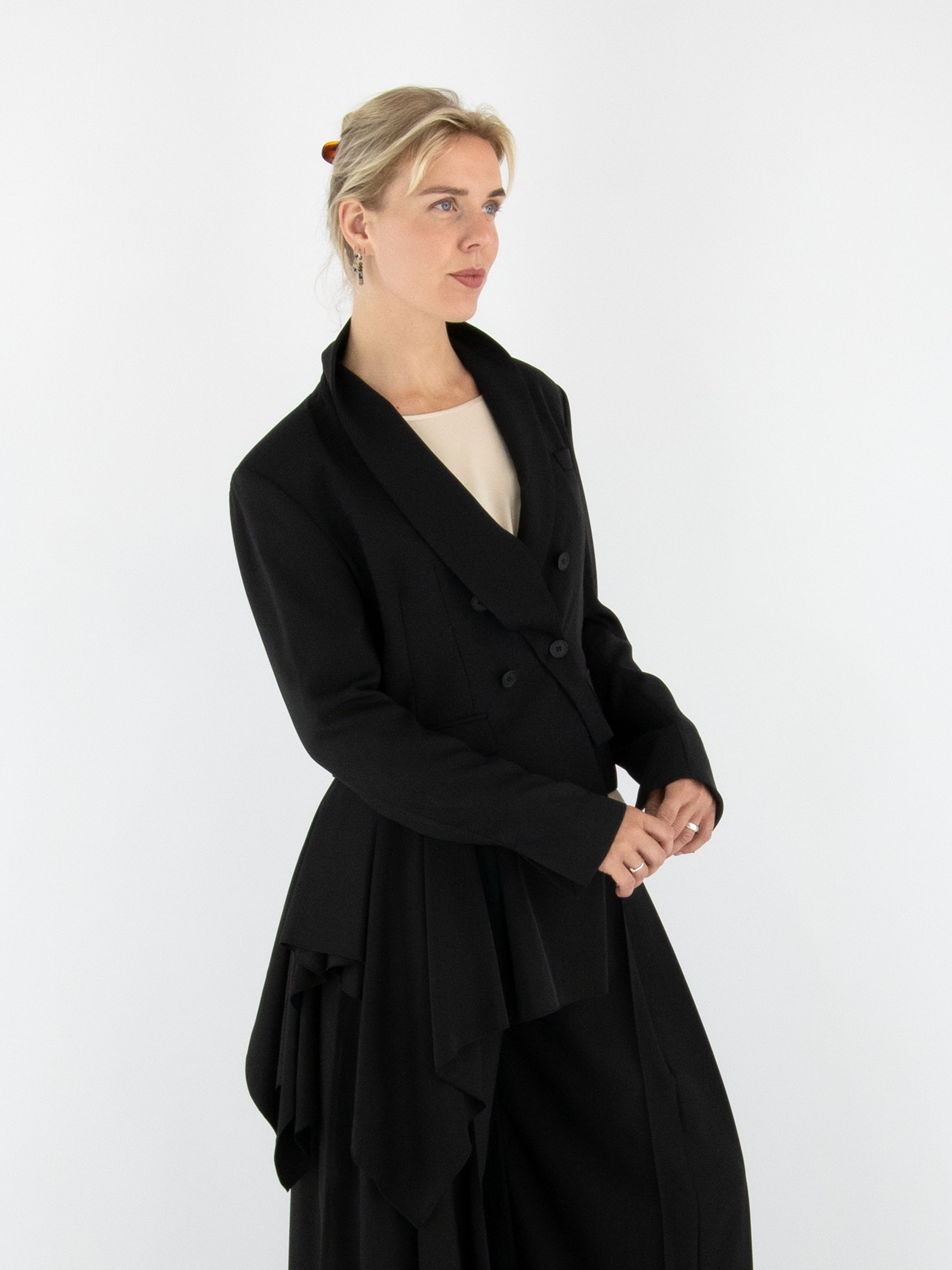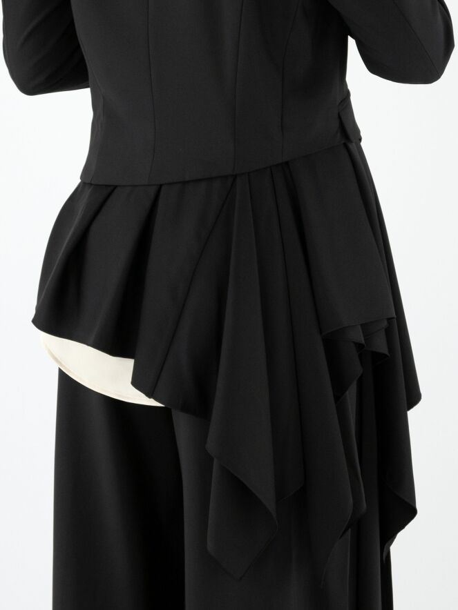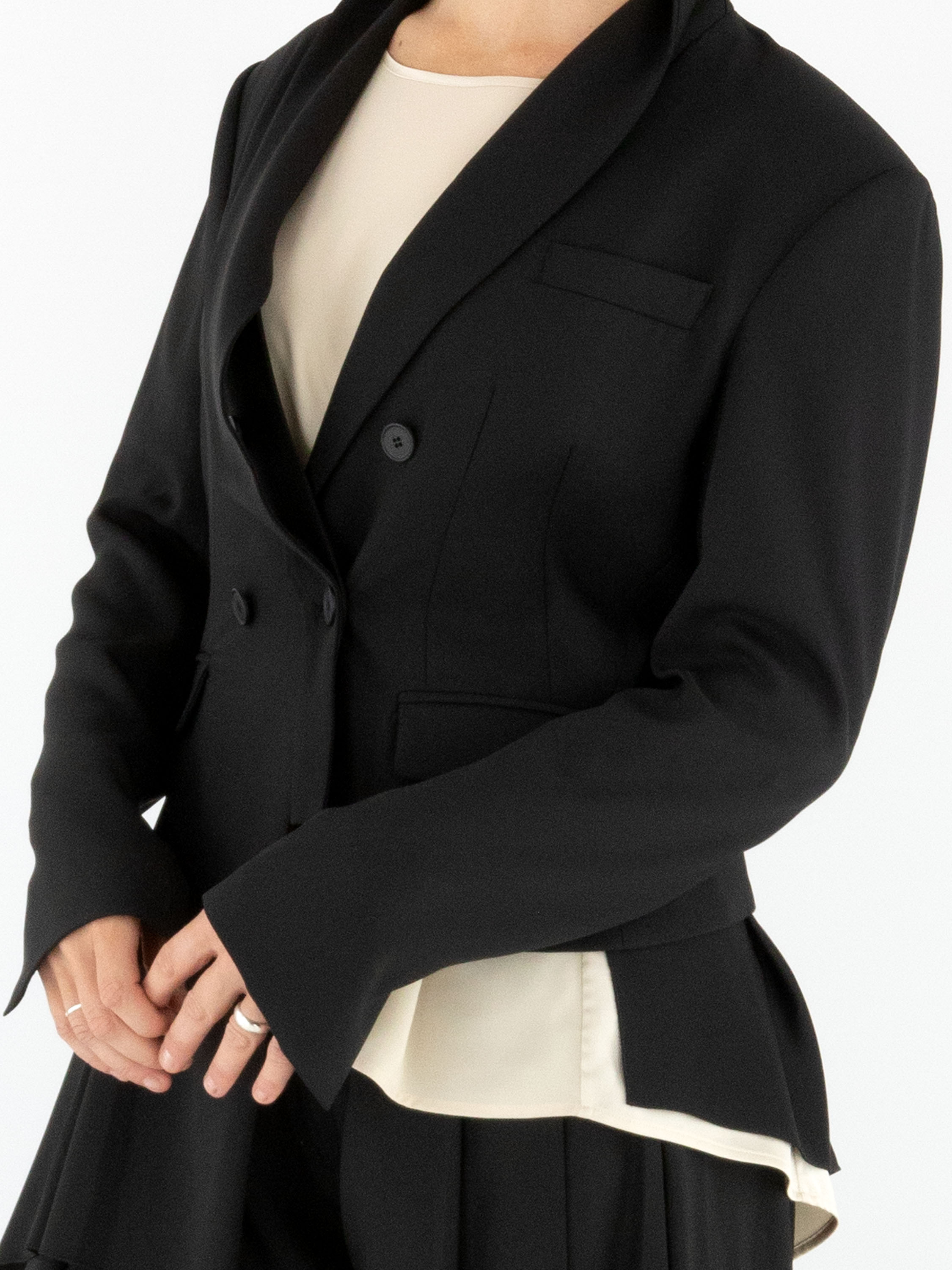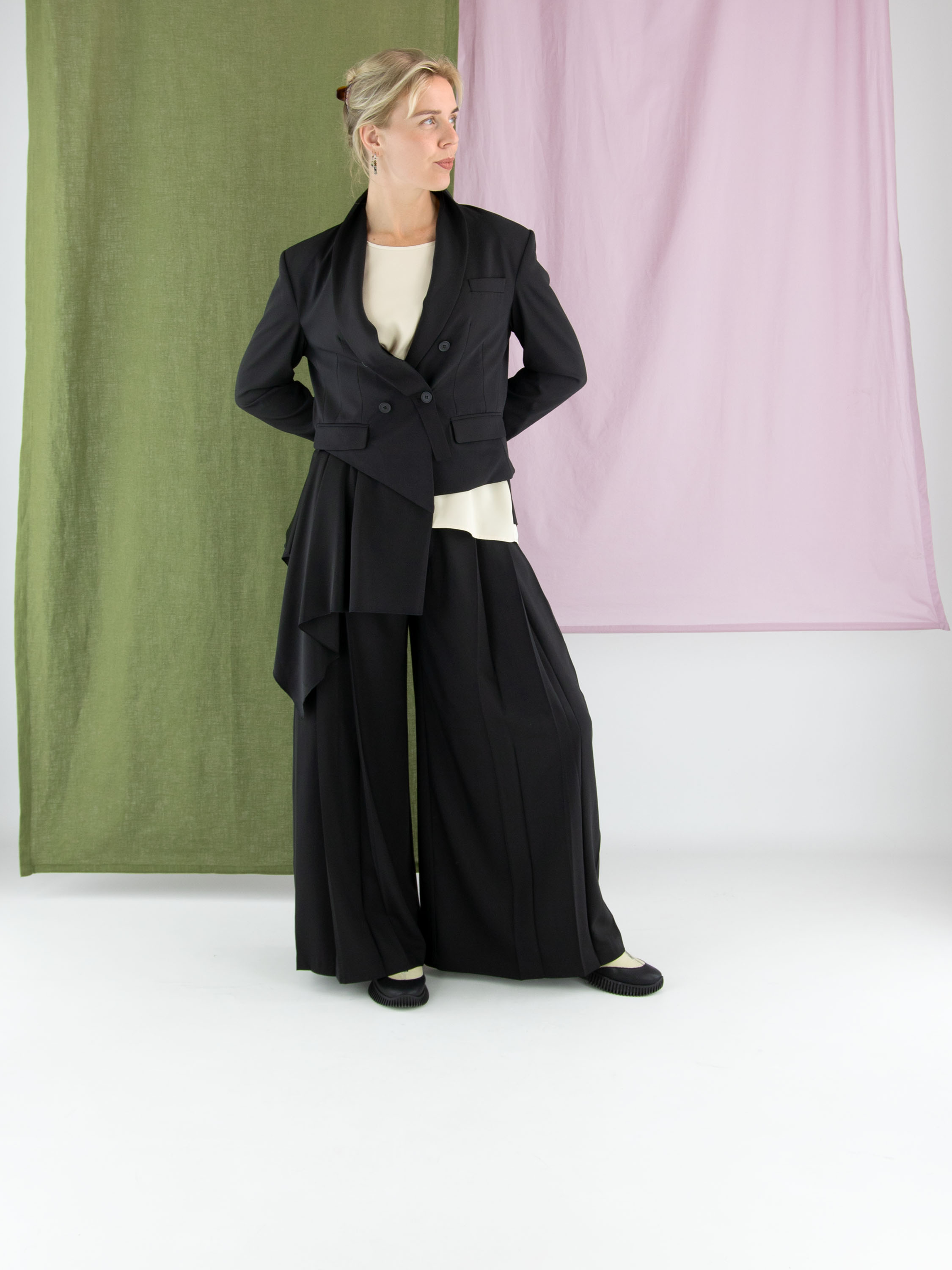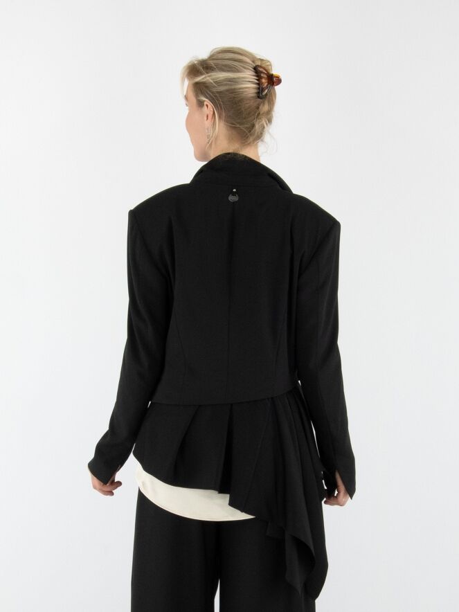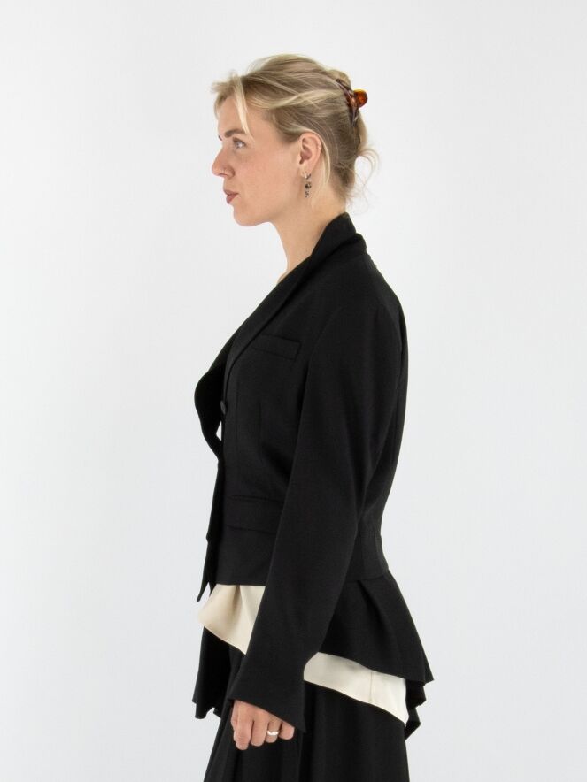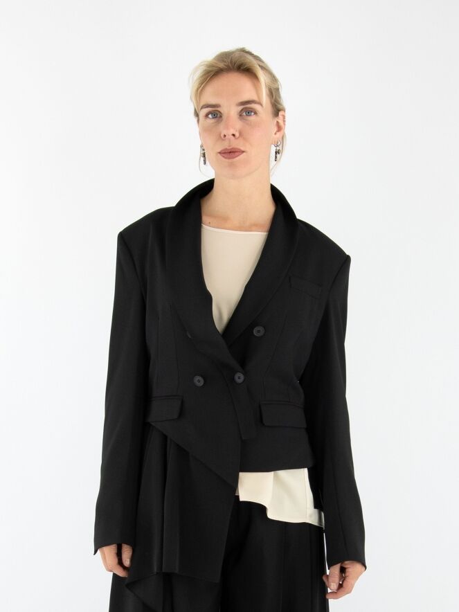 Een korte double-breasted blazer van High in de kleur zwart. De rechterrevers van de kraag is halverwege los van de blazer en bij de double-breasted sluiting vastgezet. Aan de rechteronderkant bevindt zich een matte satijnen inzet die diagonaal vanuit de rechterzijde van de blazer via de achterkant naar de linkerzijkant loopt. De blazer is gevoerd en mag niet worden gewassen.