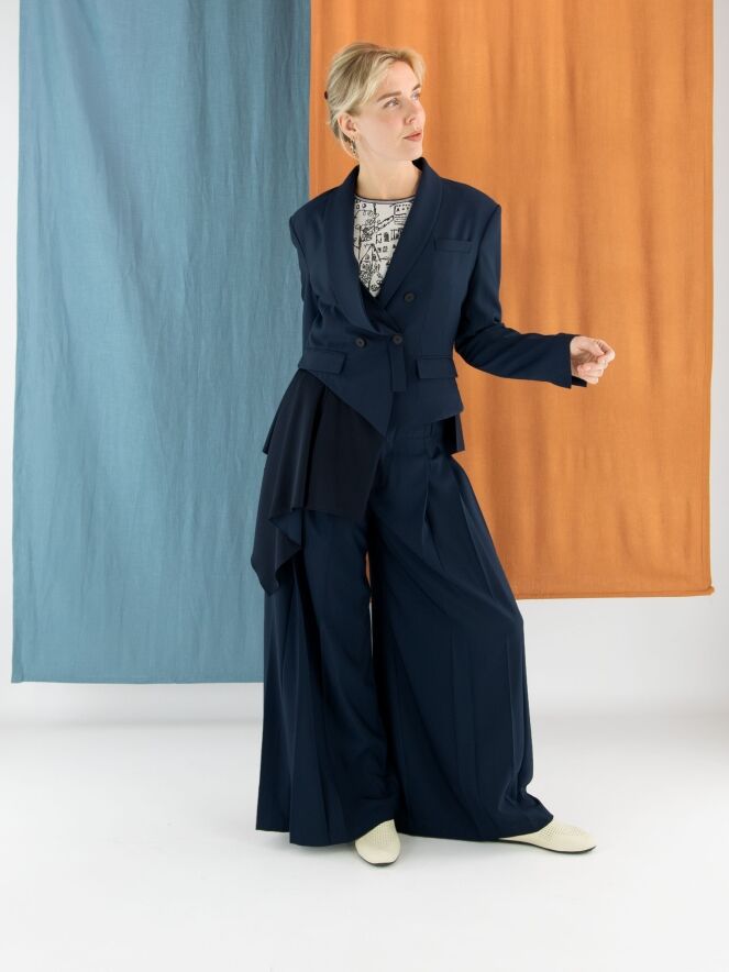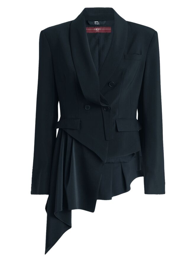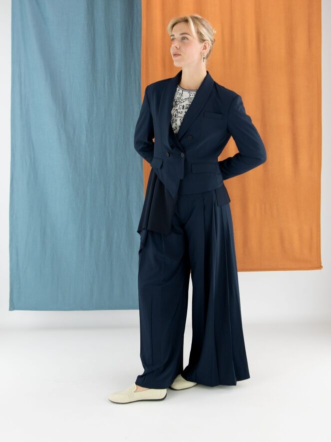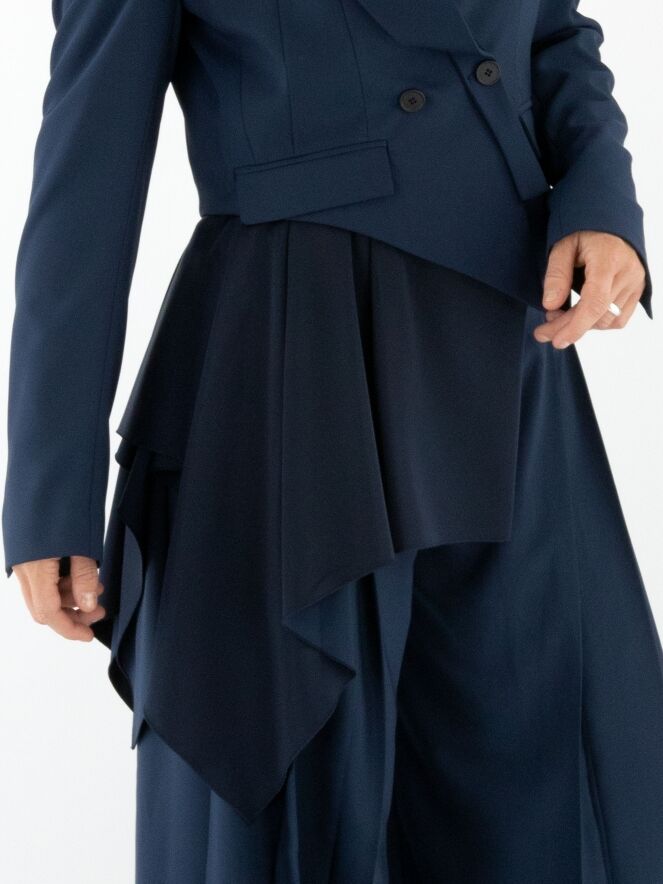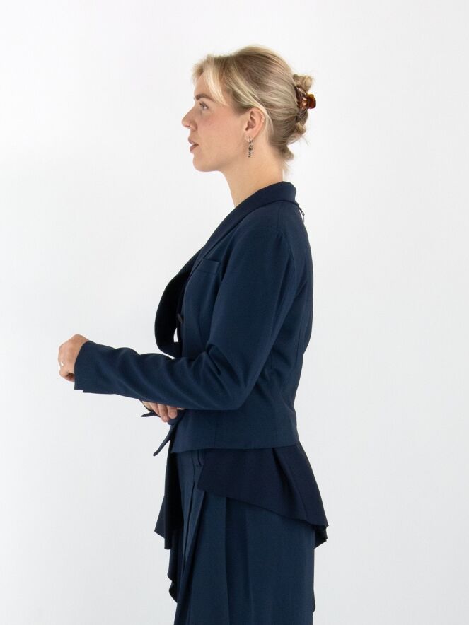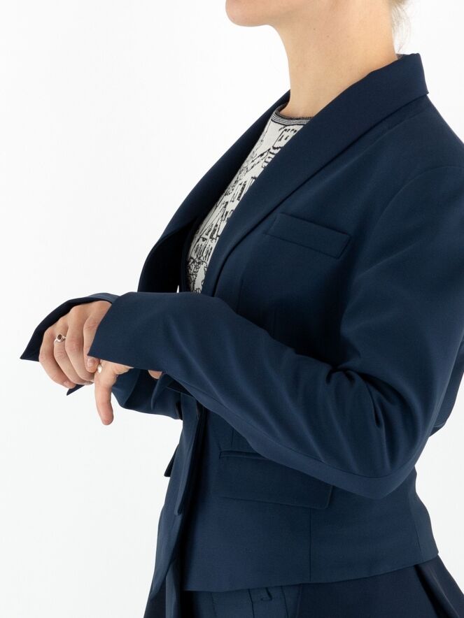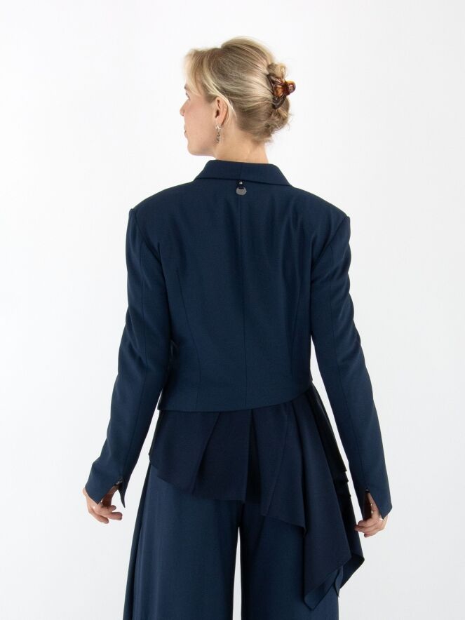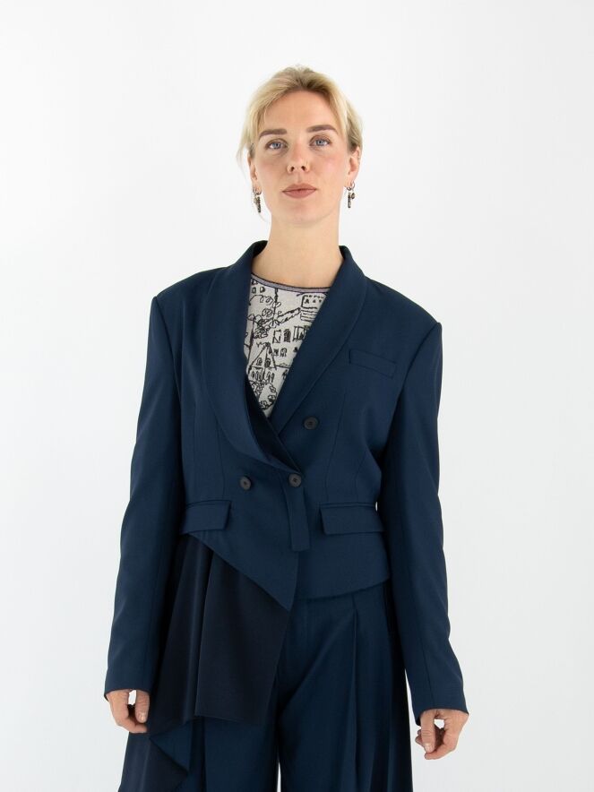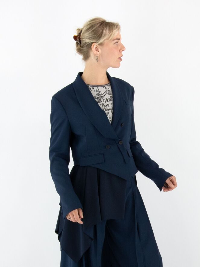 Een korte double-breasted blazer van High in de kleur nachtblauw. De rechterrevers van de kraag is halverwege los van de blazer en subtiel vastgezet bij de sluiting, wat een bijzondere designlook creëert. Aan de rechteronderkant bevindt zich een matte satijnen inzet die diagonaal vanuit de rechterzijde via de achterkant naar de linkerzijkant loopt. De blazer is volledig gevoerd en mag niet worden gewassen.