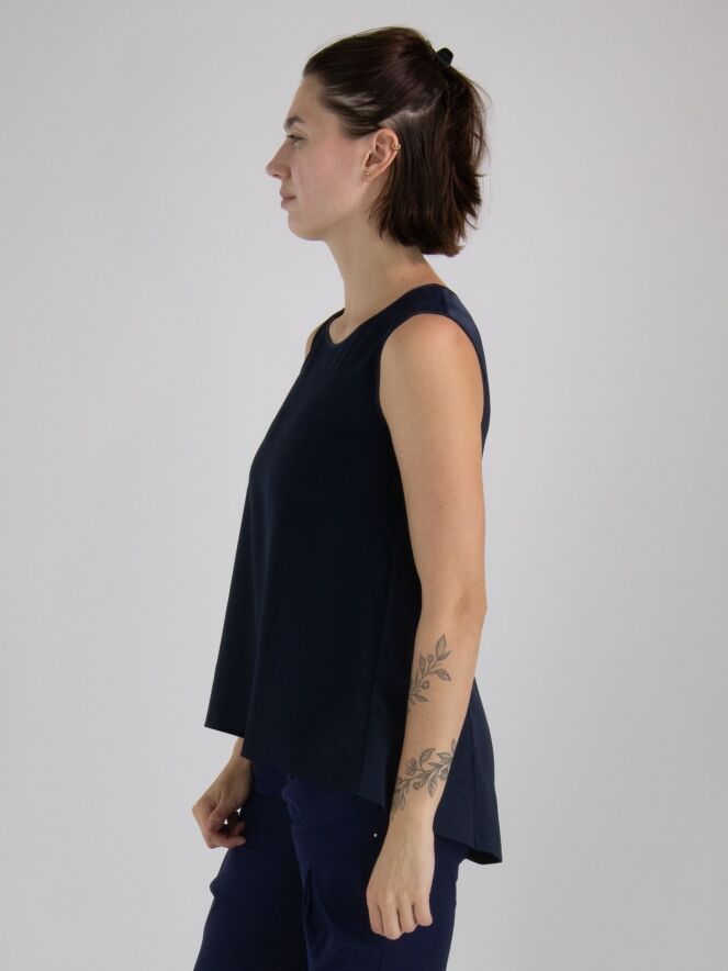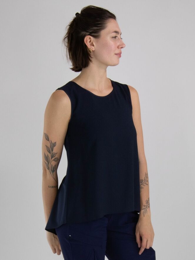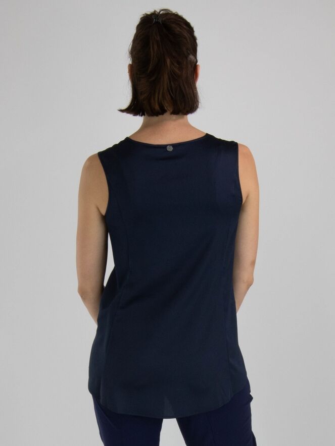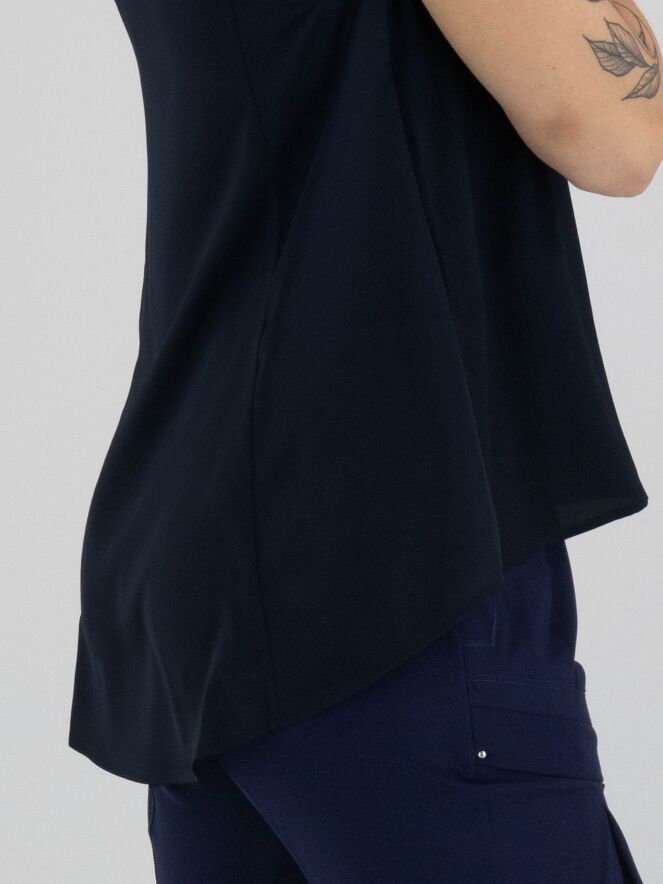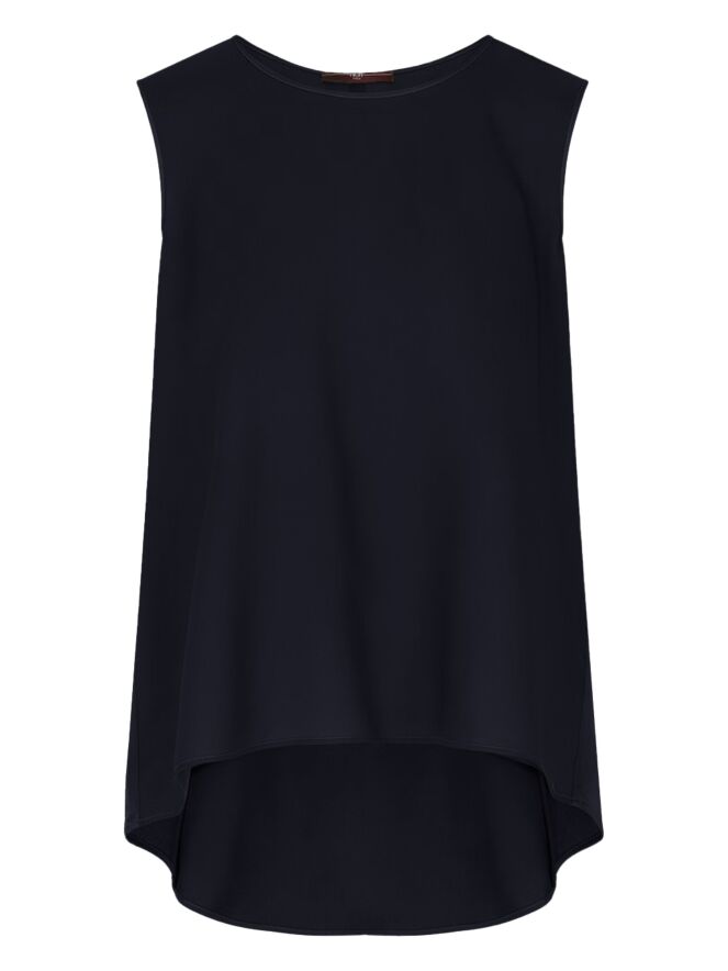 Een top van High in de kleur marineblauw. De top heeft een ronde hals en heeft een lichte A - Lijn. De voorzijde is mat en de achterzijde is mat satijn. Deze top mag op de hand worden gewassen.