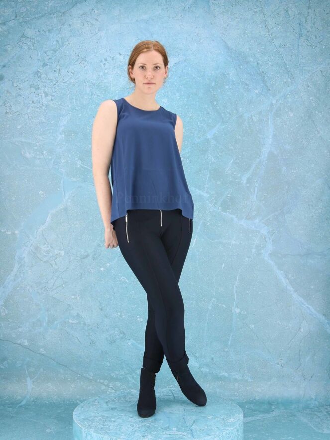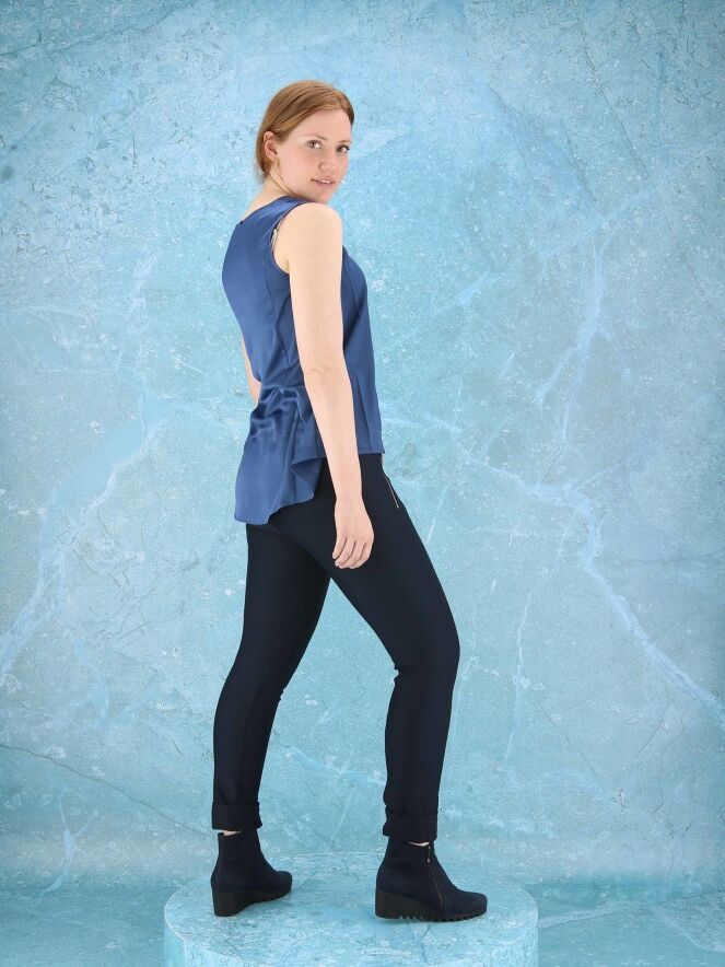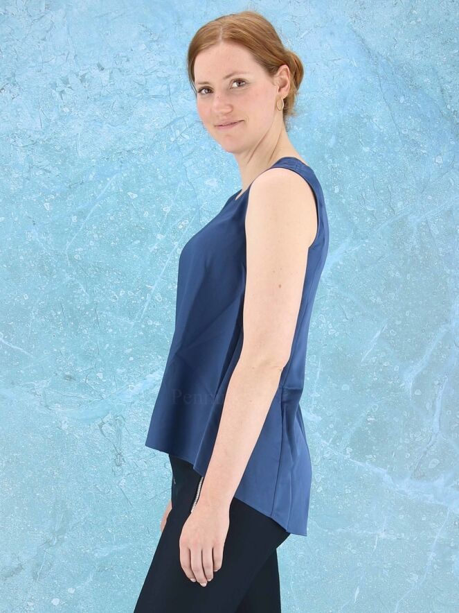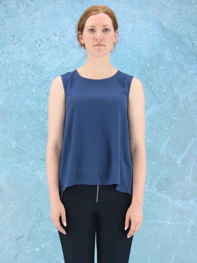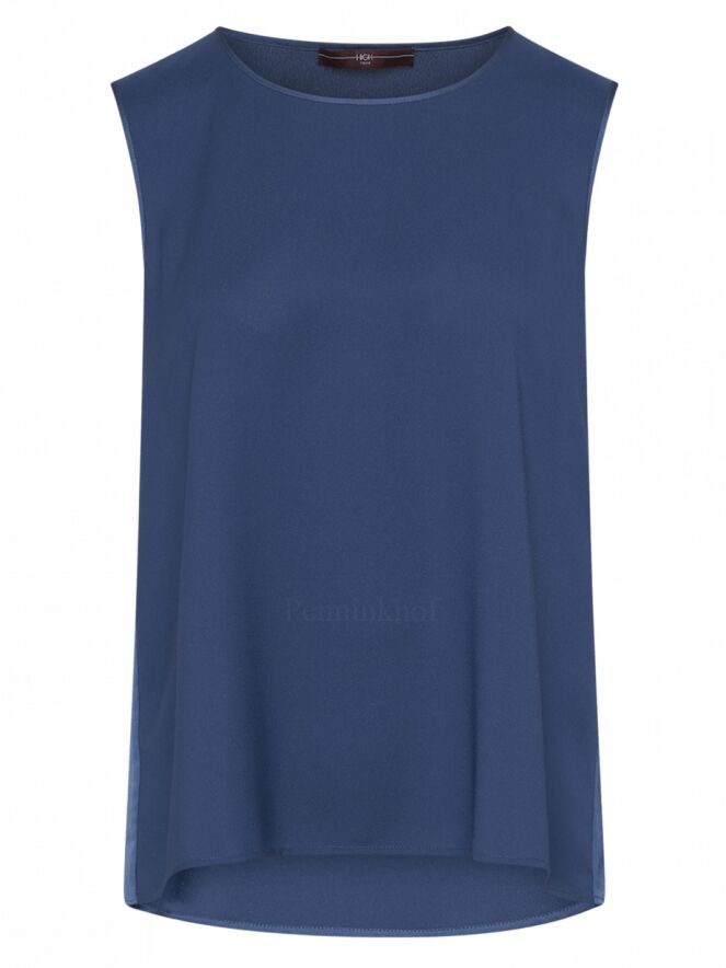 Een top van High in de kleur blauw. De top heeft een ronde hals en heeft een lichte A - Lijn. Deze top mag op de hand worden gewassen.