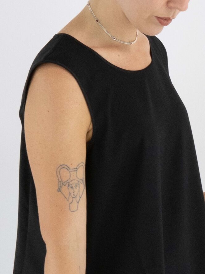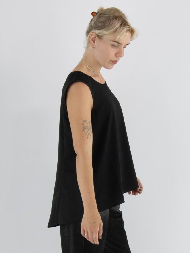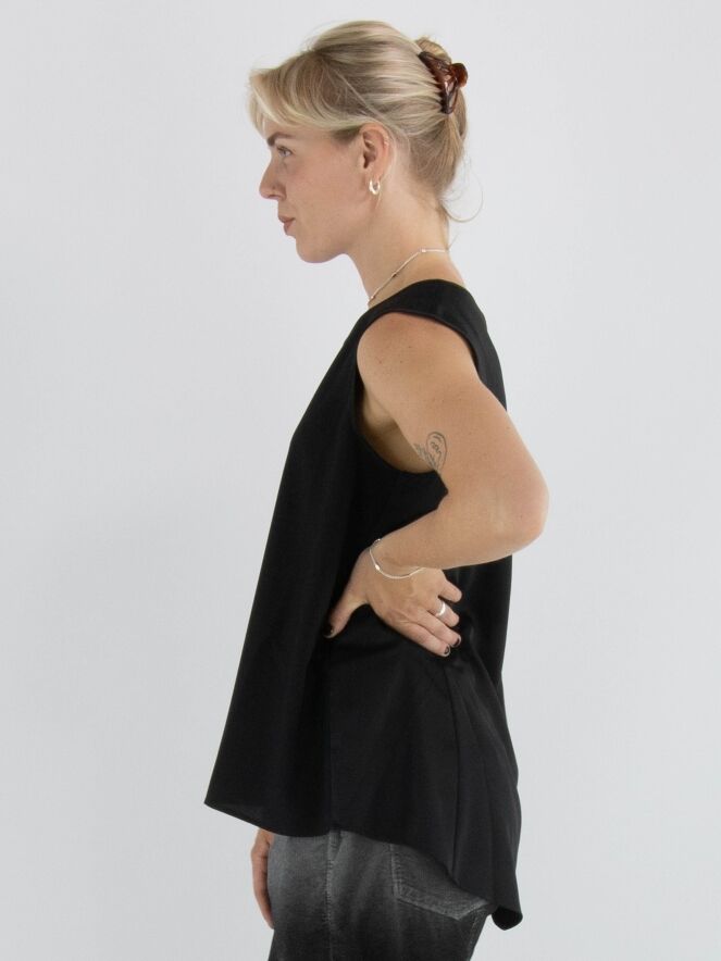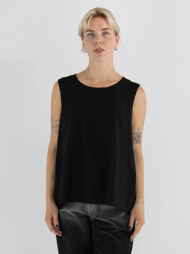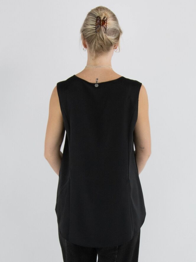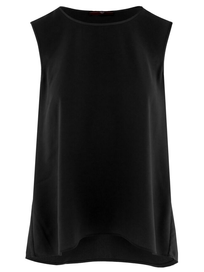 Een top van High in de kleur zwart. De top heeft een ronde hals en een lichte A-lijn. De voorkant is uitgevoerd in een matte stof, terwijl de achterkant is gemaakt van mat satijn. Deze top mag met de hand worden gewassen.