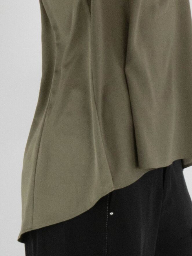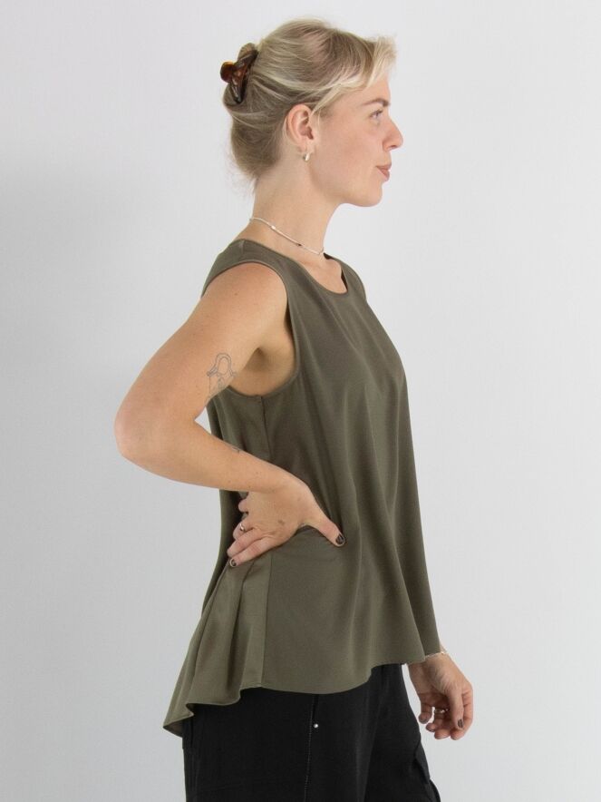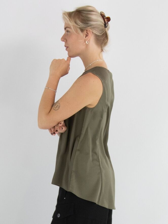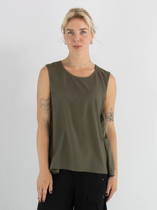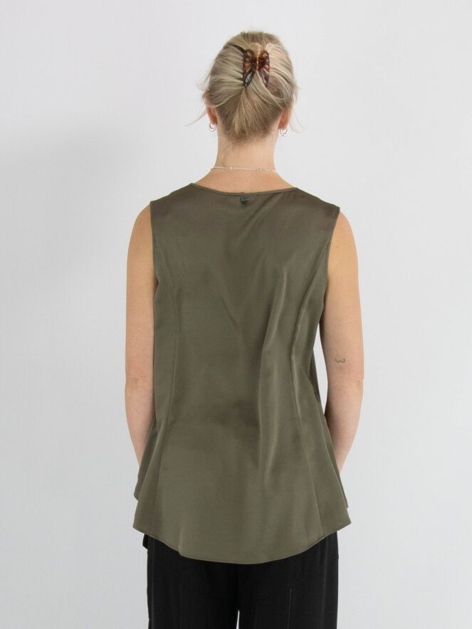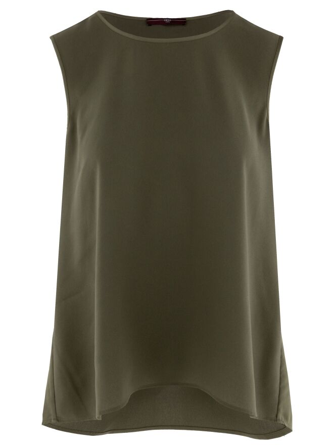 Een top van High in de kleur olijfgroen. De top heeft een ronde hals en een lichte A-lijn. De voorzijde is uitgevoerd in een matte stof, terwijl de achterzijde is gemaakt van mat satijn. Deze top mag met de hand worden gewassen.