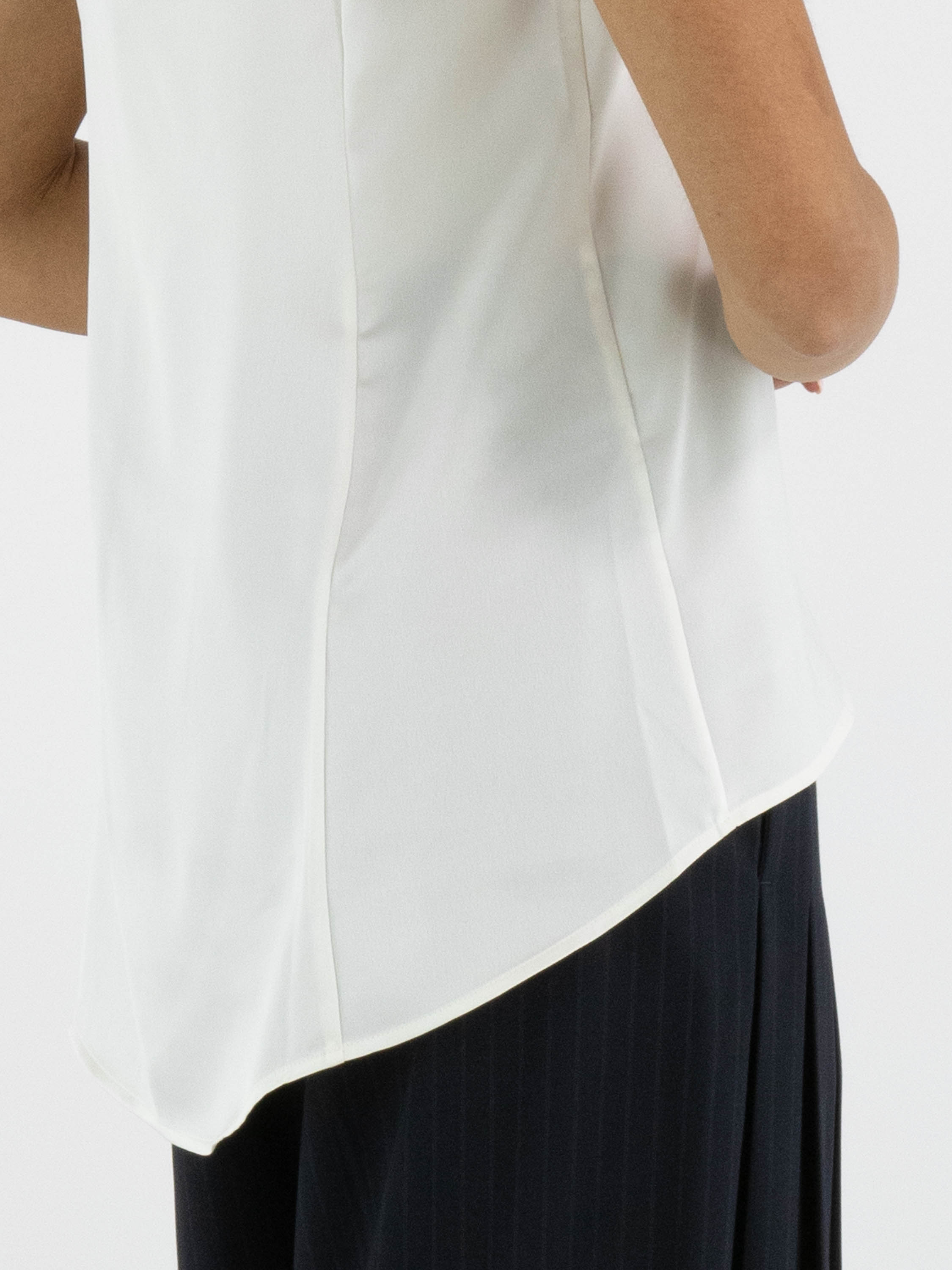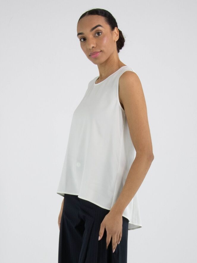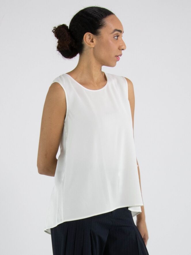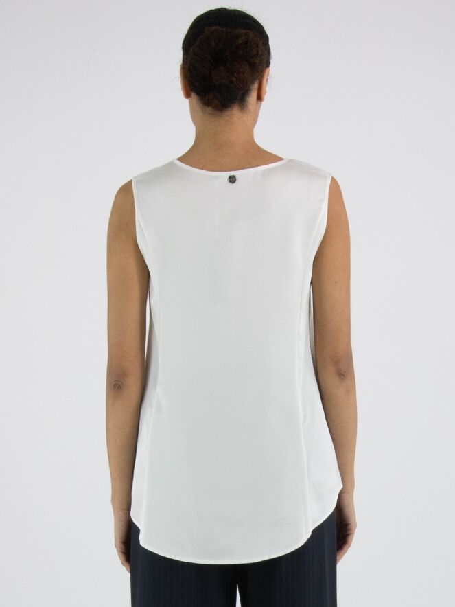 Een top van High in de kleur roomwit. De top heeft een ronde hals en een lichte A-lijn. De voorkant is uitgevoerd in een matte stof, terwijl de achterkant van mat satijn is. Deze top mag met de hand worden gewassen.