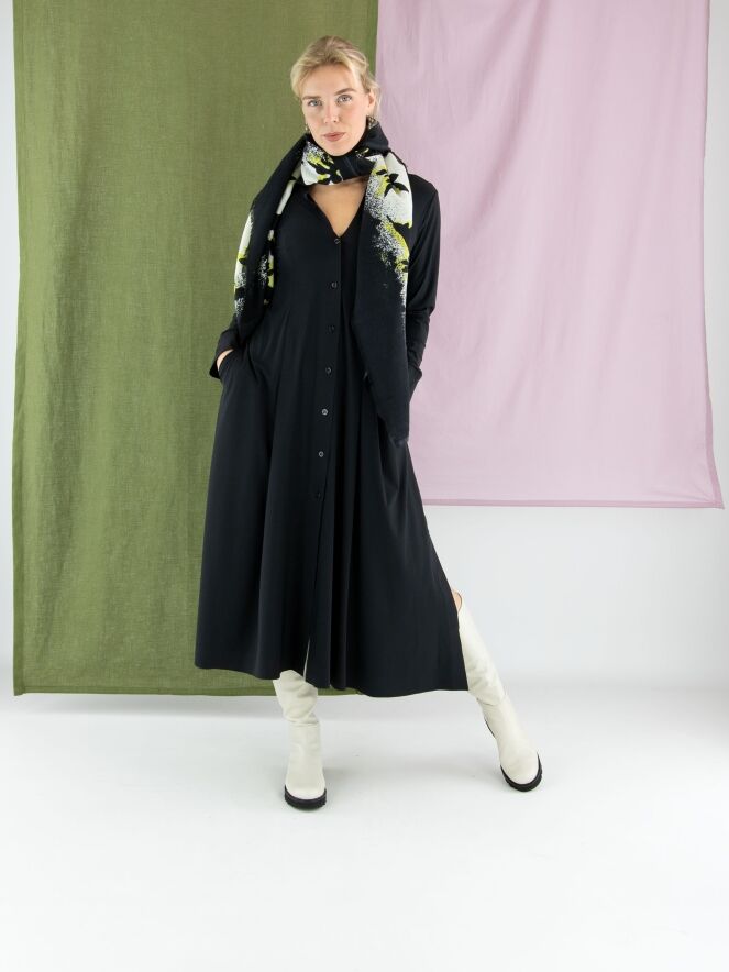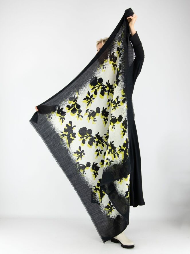 Een luxe, licht transparante shawl van High in een grafische print met de kleuren zwart, geel en roomwit. De randen van de shawl zijn fijn gerafeld. Deze shawl mag niet worden gewassen.
