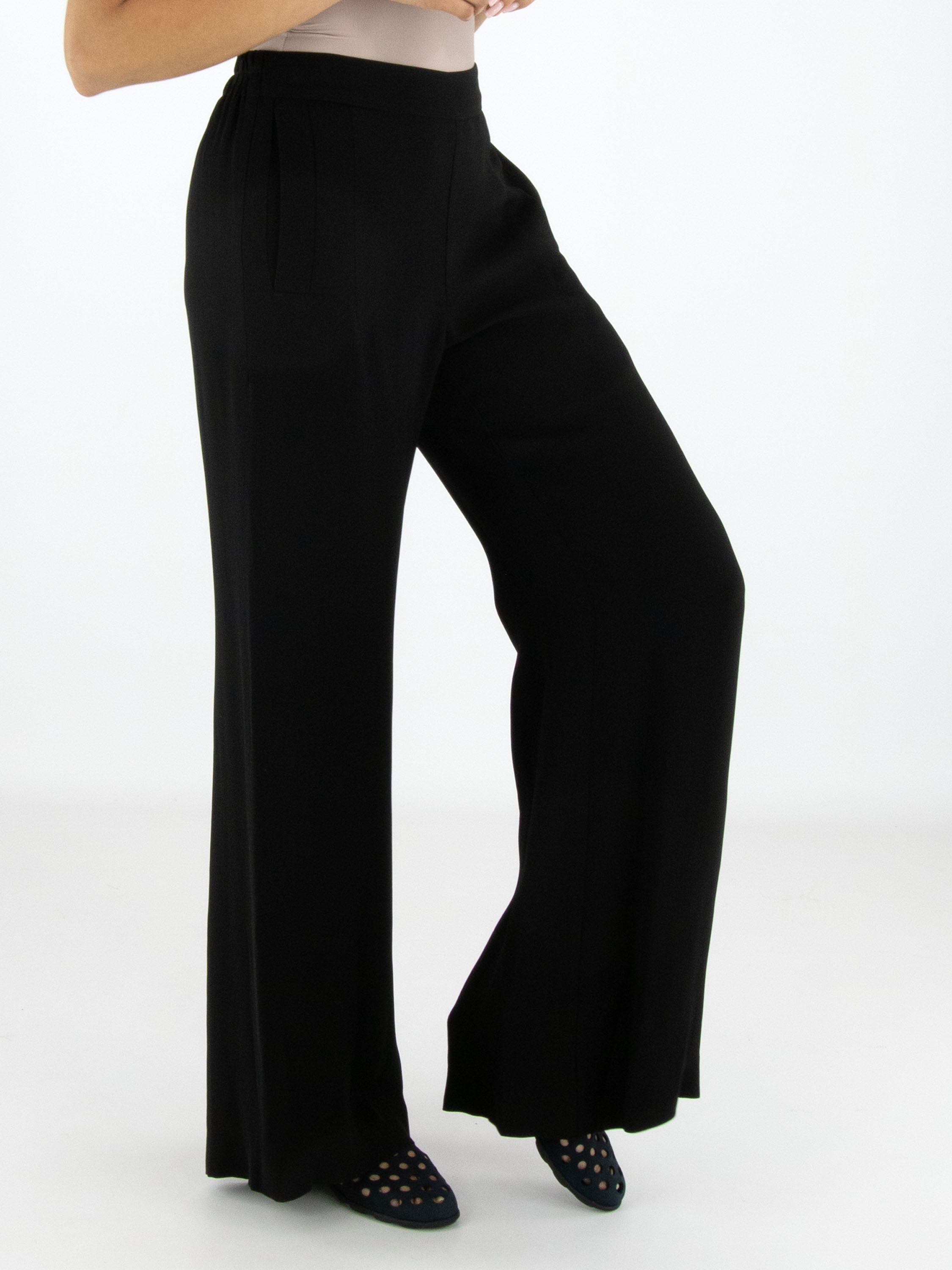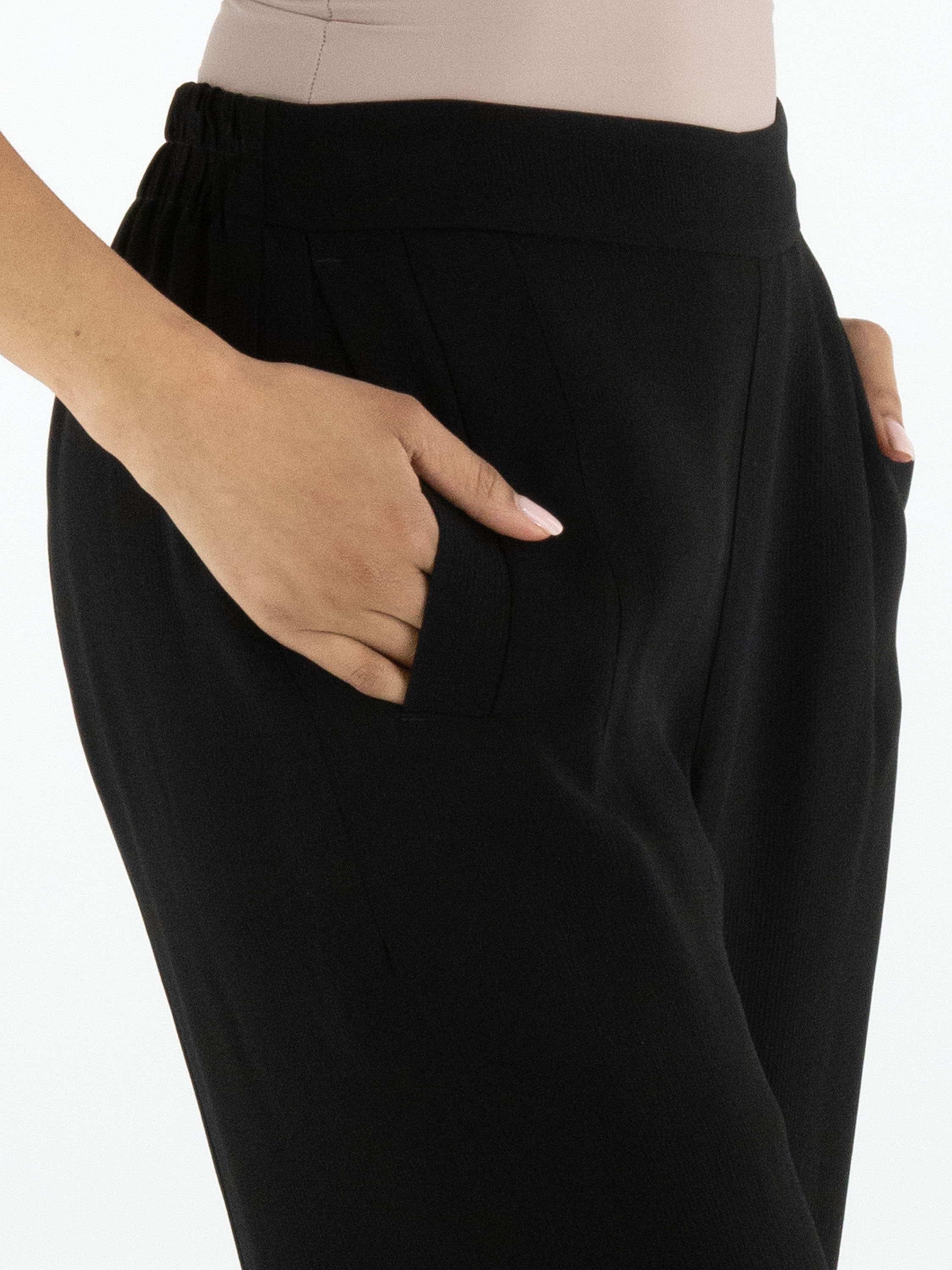 Broek van High in een fijn geribbelde stof in de kleur zwart. Aan de achterzijde van de taille is een fijn geplooide tailleband verwerkt, wat zorgt voor een comfortabele en subtiel vrouwelijke pasvorm. De broek is voorzien van steekzakken en mag niet worden gewassen.