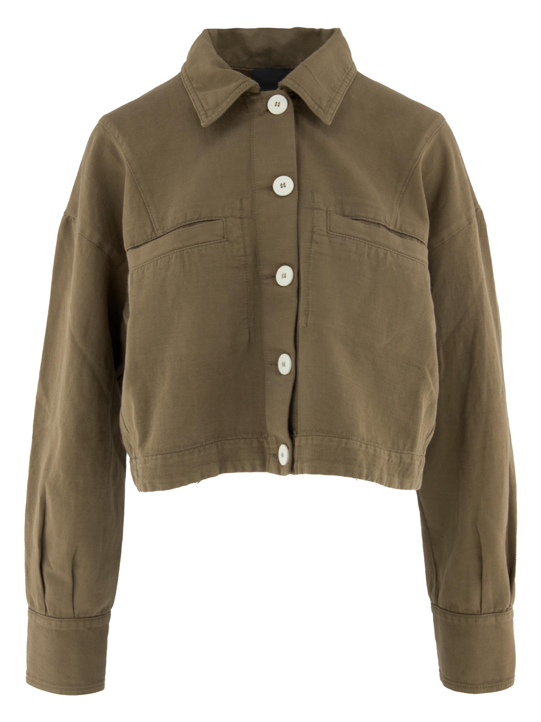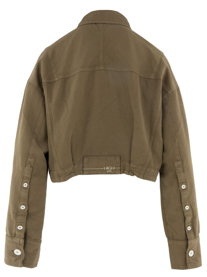 Korte blazer van High in een olijfgroene tint. De blazer sluit met vijf knopen en heeft een modern en krachtig silhouet. De mouwen zijn voorzien van een knoopsluiting die over de lengte van de onderarm doorloopt tot aan de manchetten, wat het ontwerp een opvallend en verfijnd detail geeft. De blazer heeft borstzakken en kan op 30 graden worden gewassen.