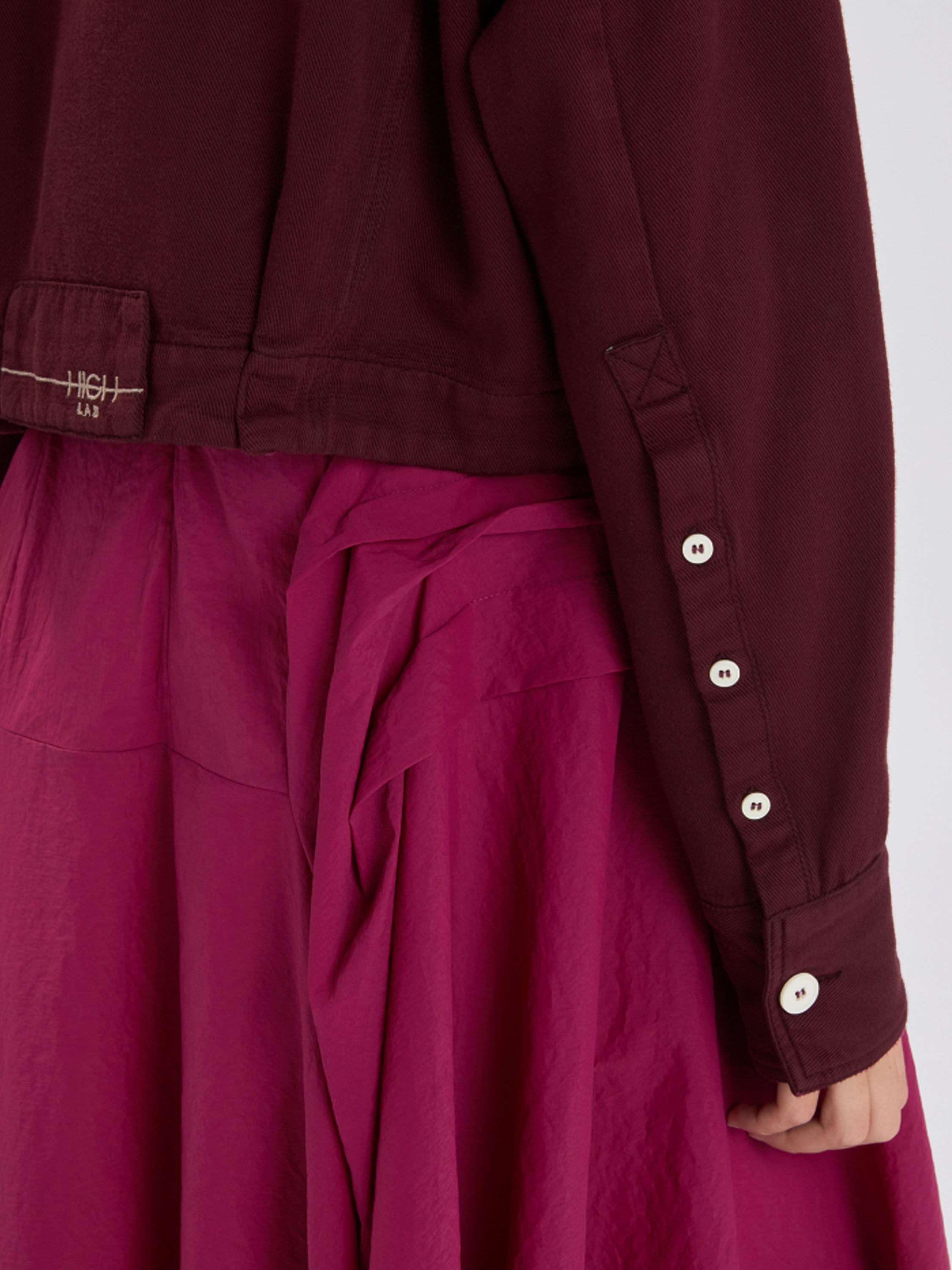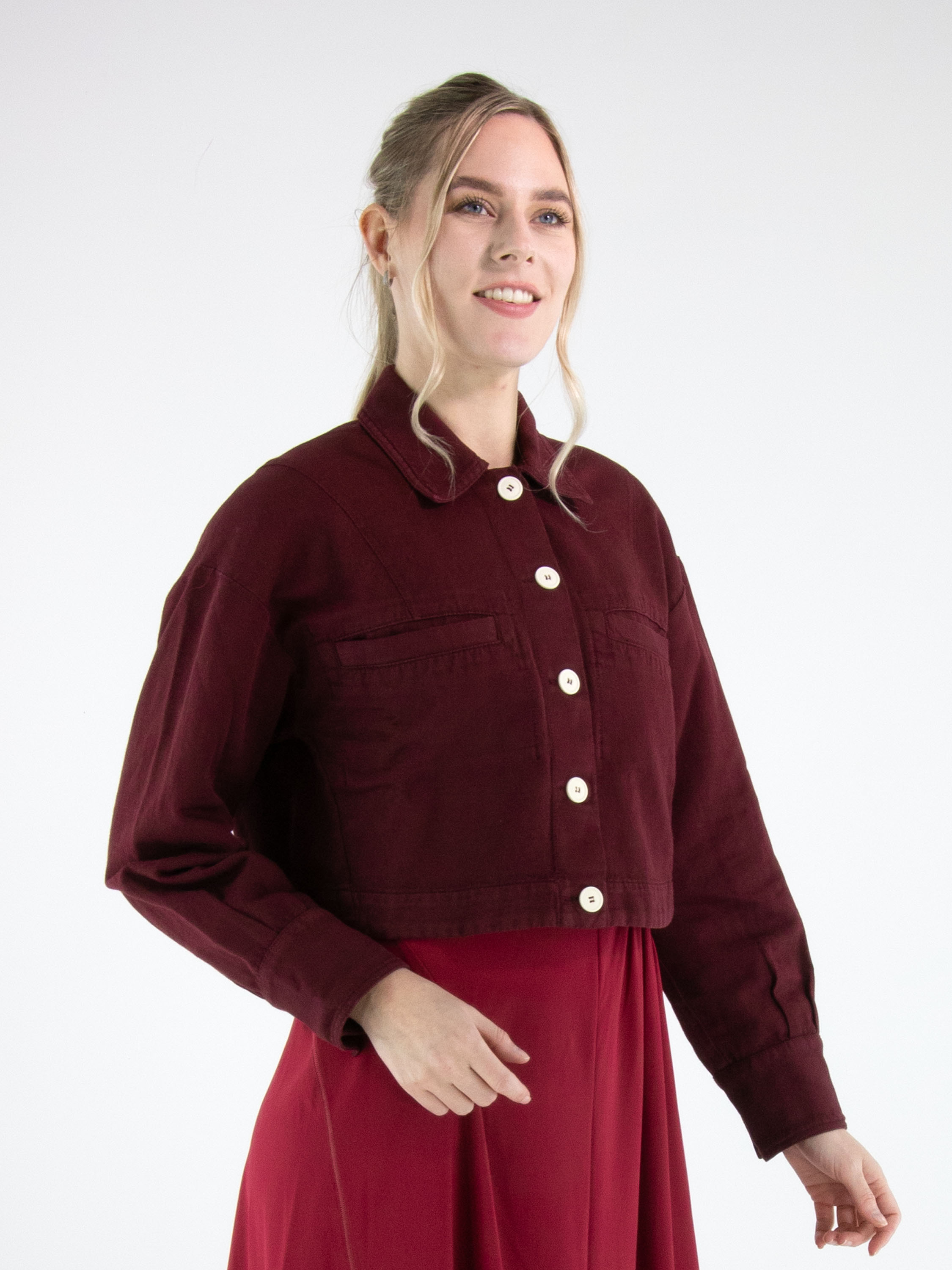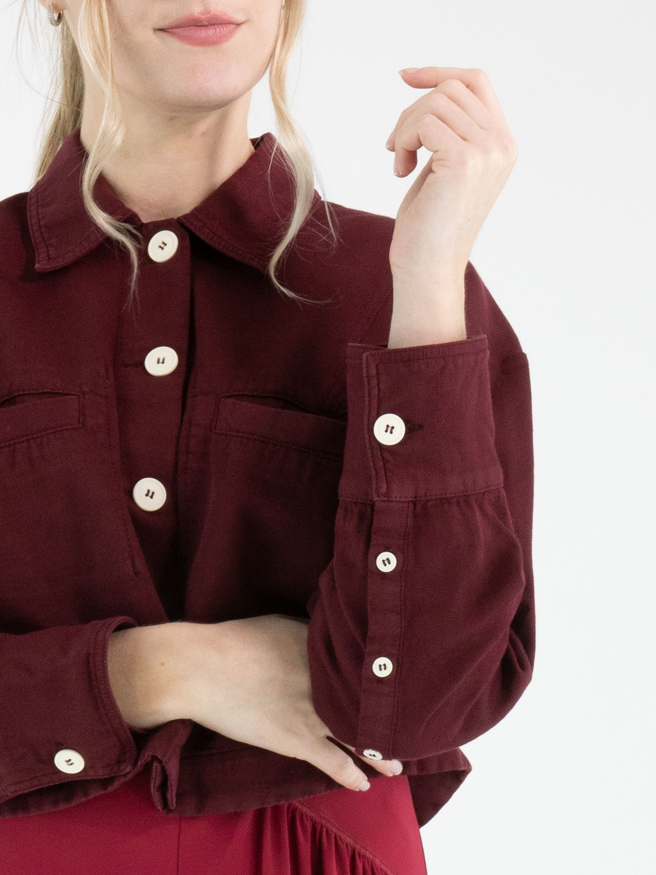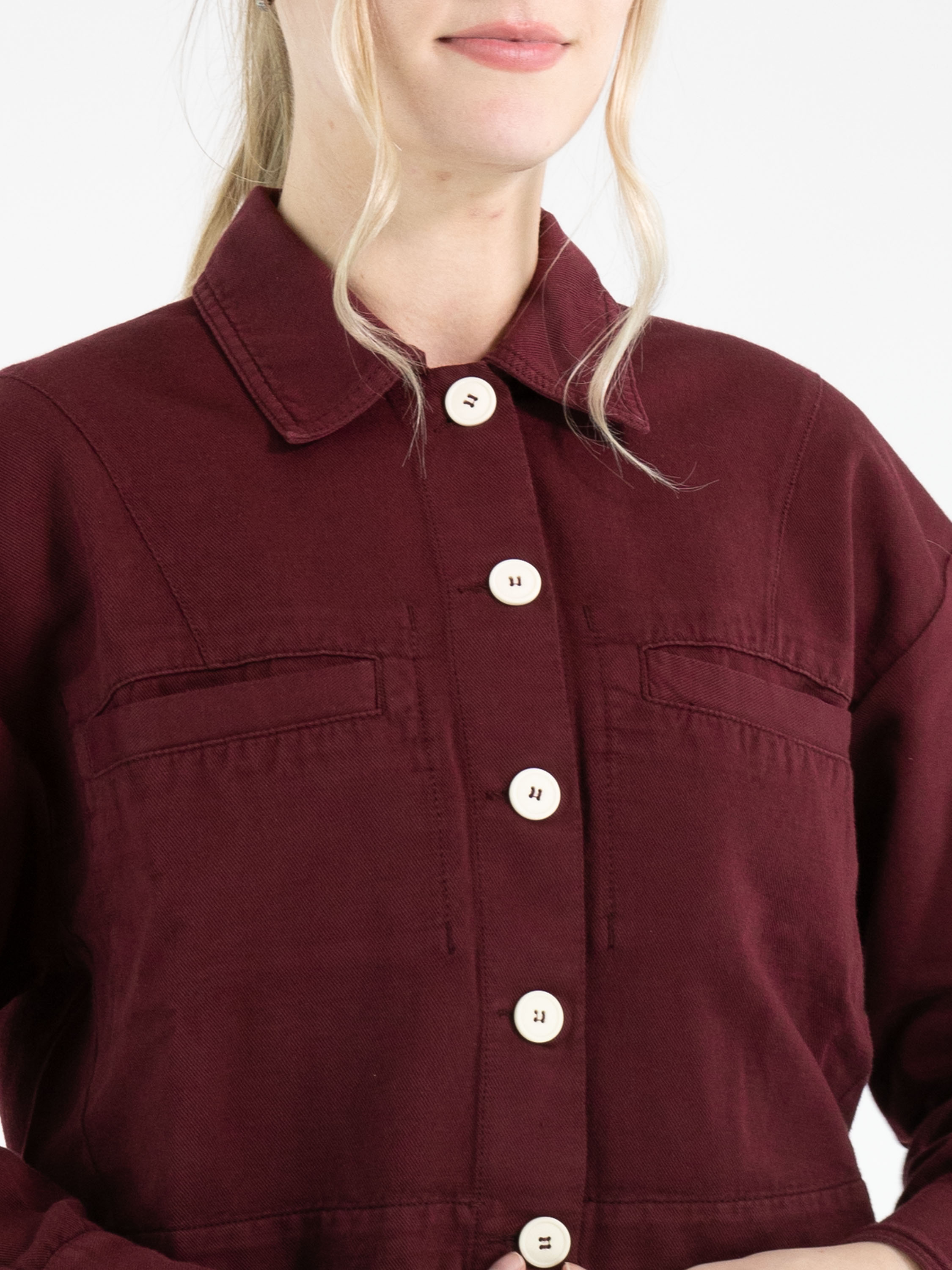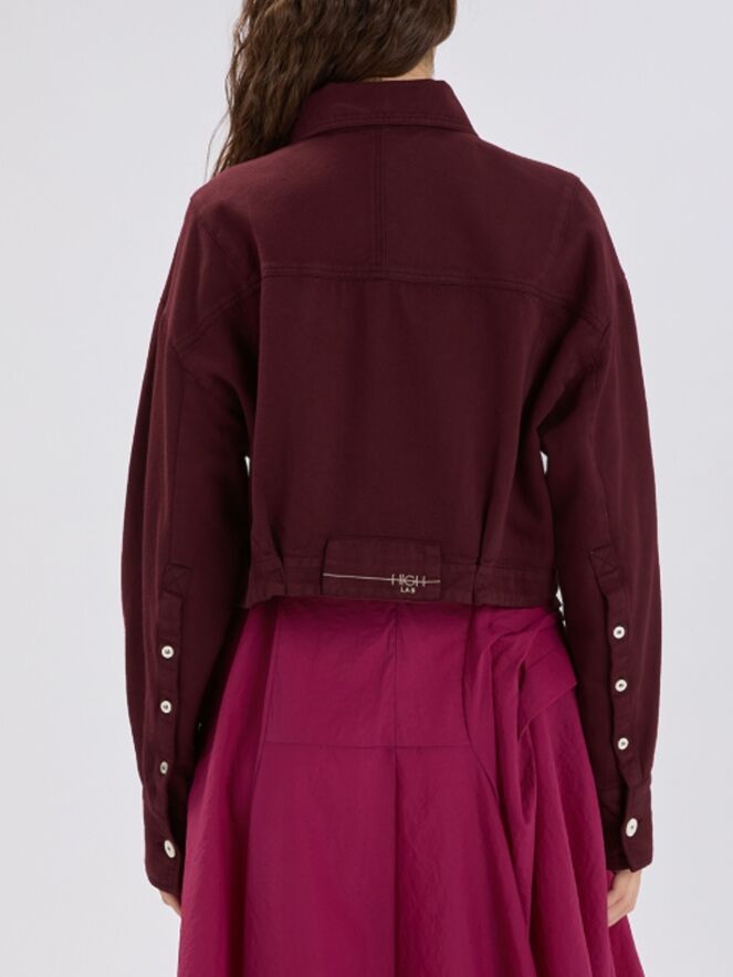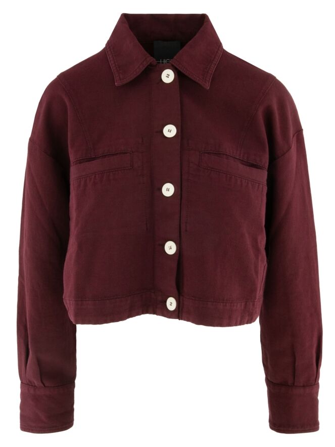 Korte blazer van High in een diepe auberginetint. De blazer sluit met vijf knopen en heeft een modern en krachtig silhouet. De mouwen zijn voorzien van een knoopsluiting die over de lengte van de onderarm doorloopt tot aan de manchetten, wat het ontwerp een opvallend en verfijnd detail geeft. De blazer heeft borstzakken en kan op 30 graden worden gewassen.