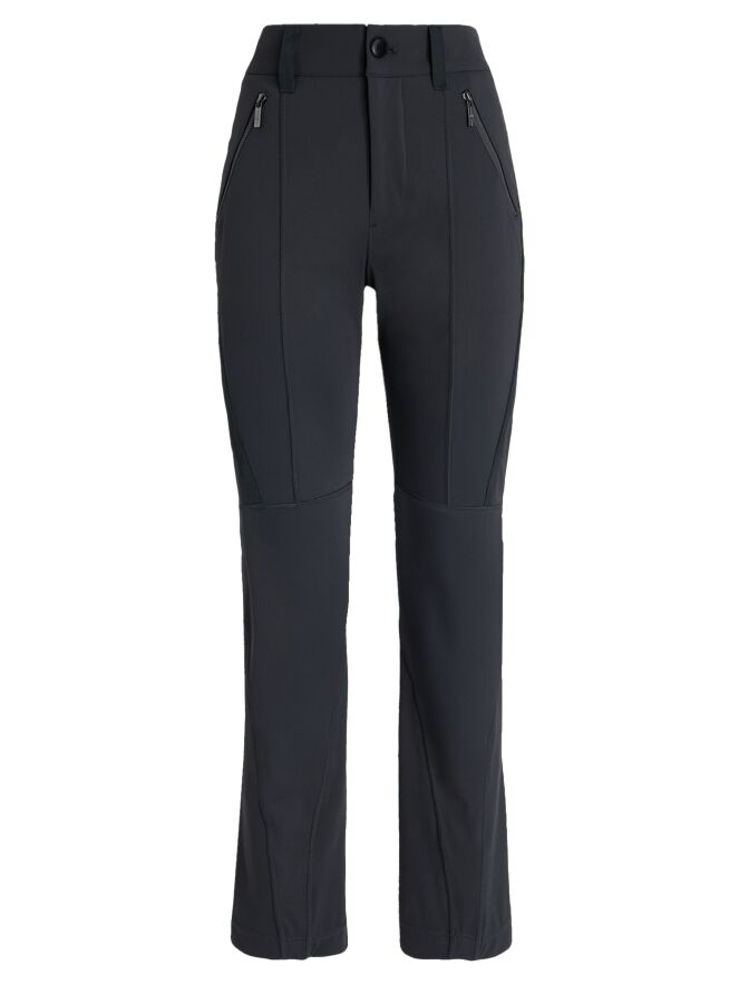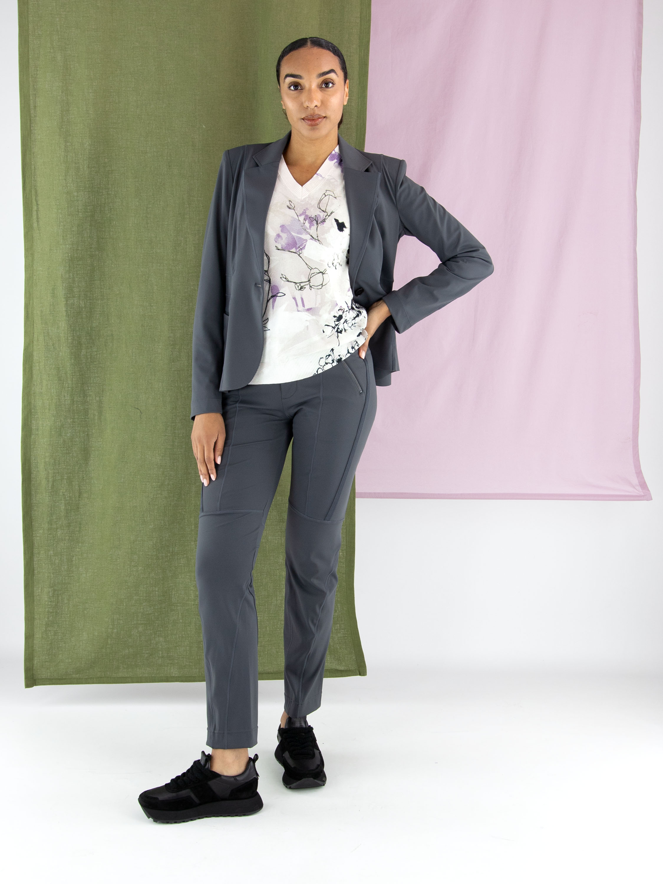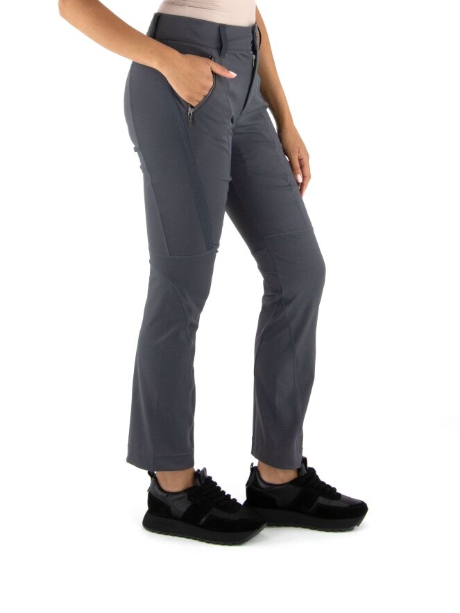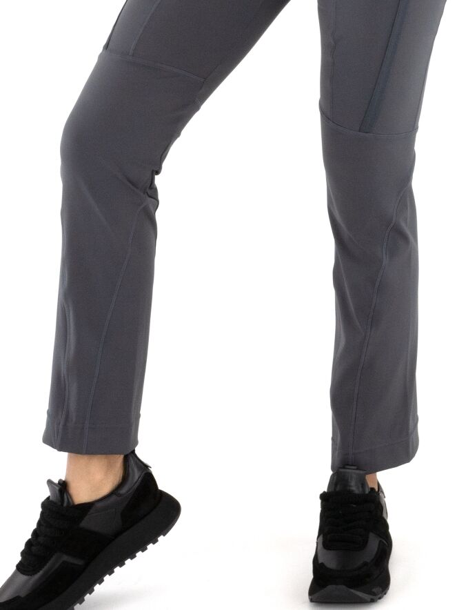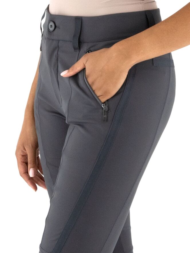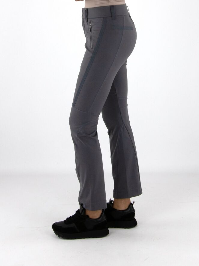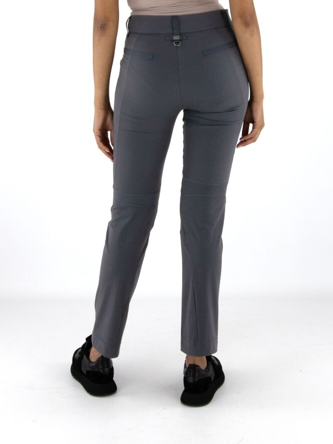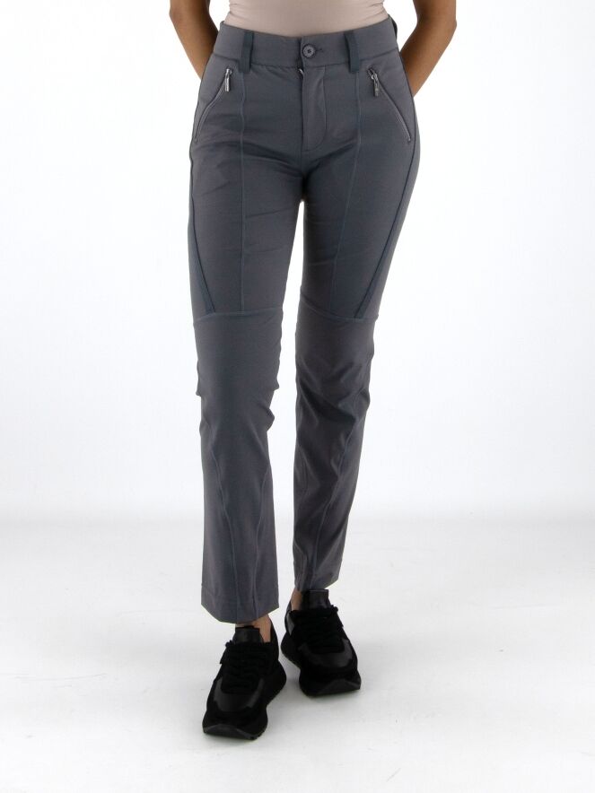 Een broek van High in de kleur antracietgrijs. De zakken aan de voorzijde zijn voorzien van een ritssluiting. De broek is afgewerkt met meerdere diagonale, verticale en horizontale stiknaden en biezen. Deze broek kan met de hand worden gewassen.
