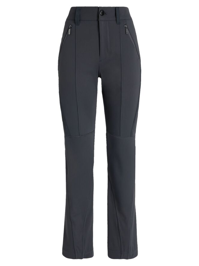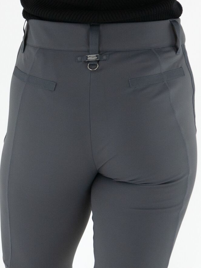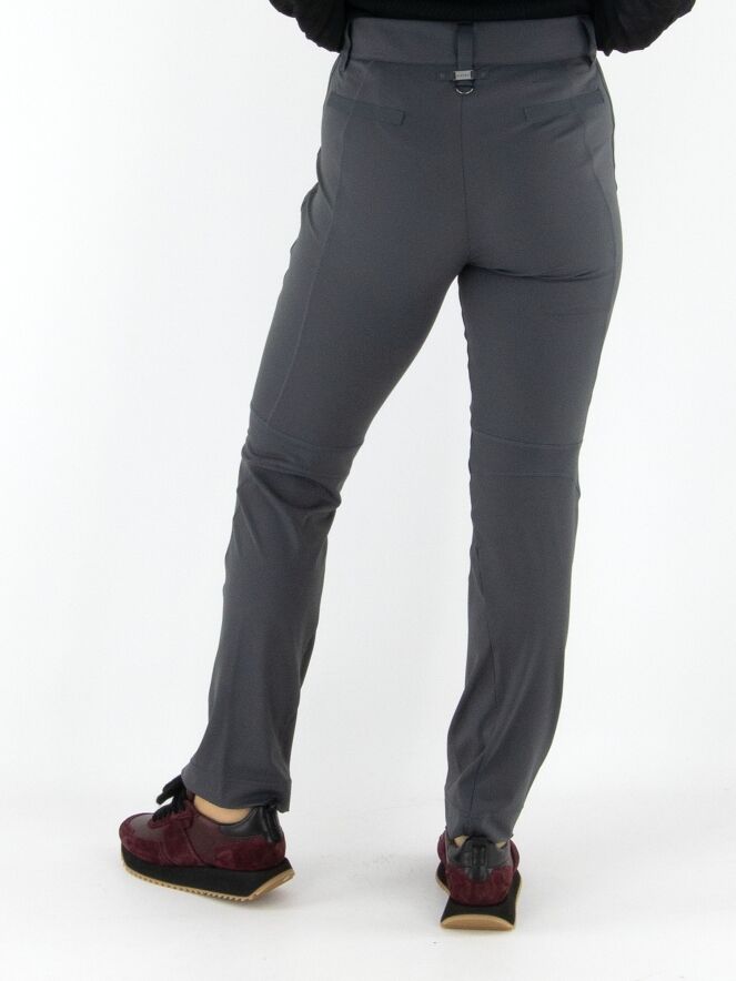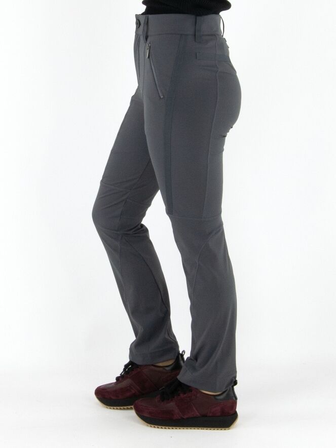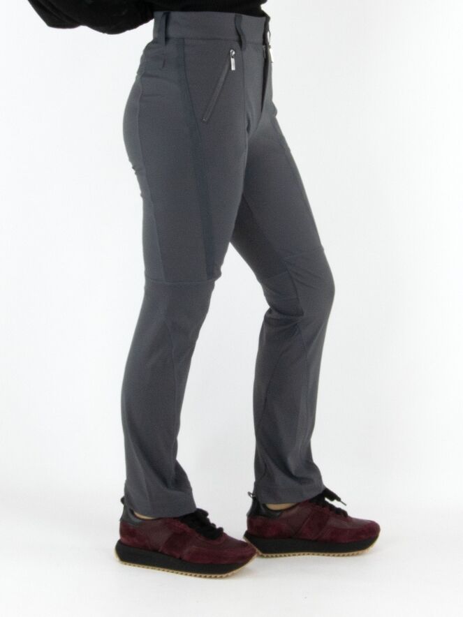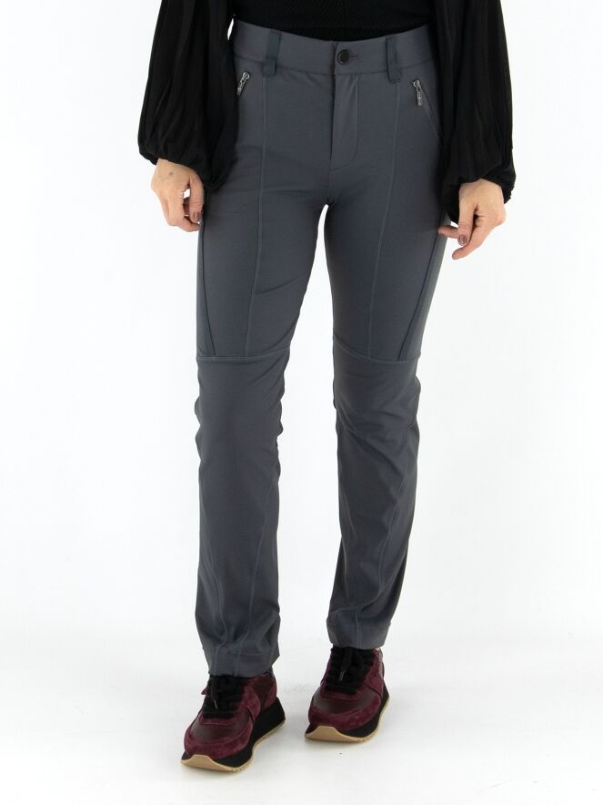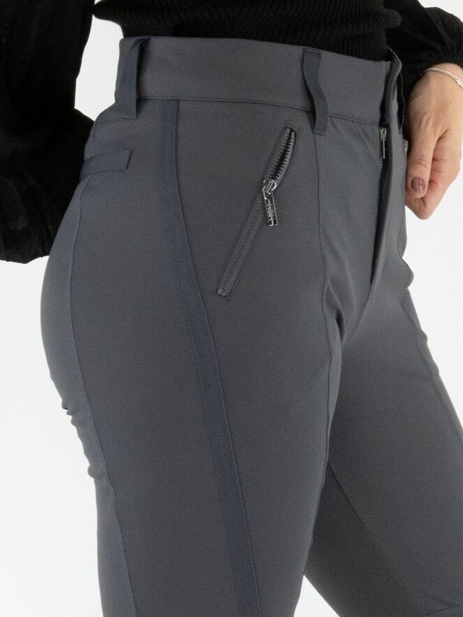 Een broek van High in de kleur grijs. De zakken aan de voorzijde zijn voorzien van een ritssluiting. De broek is afgewerkt met meerdere diagonale, verticale en horizontale stiknaden en biezen. Deze broek kan met de hand worden gewassen.