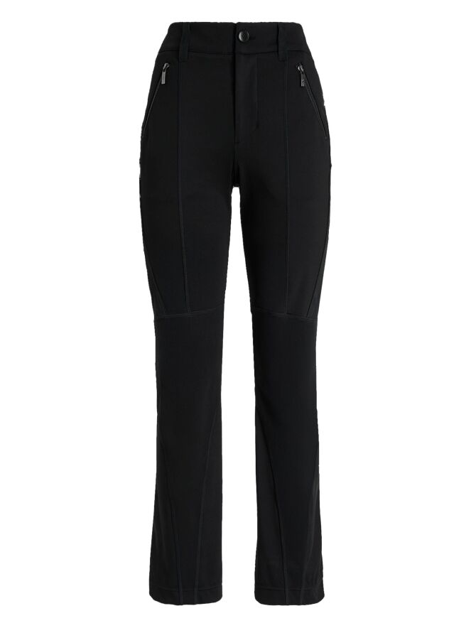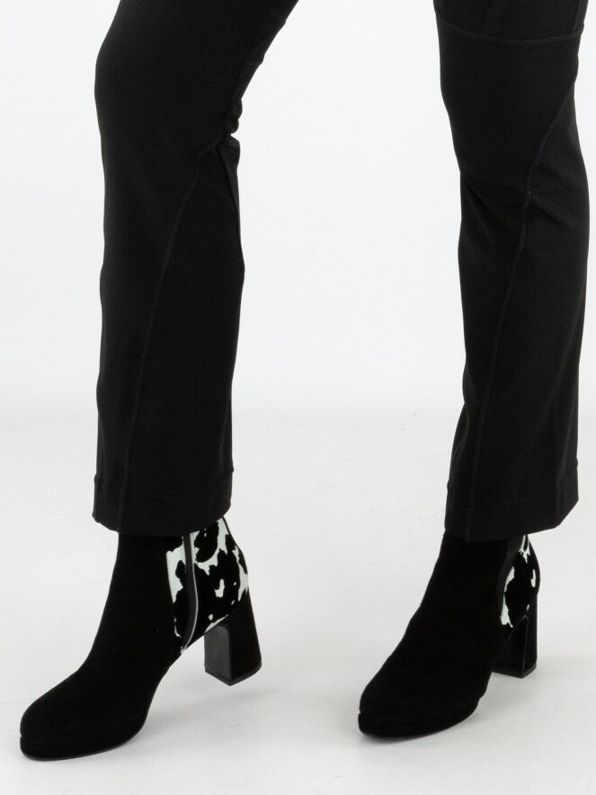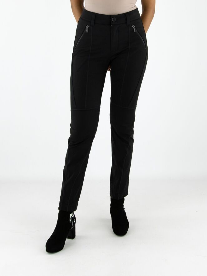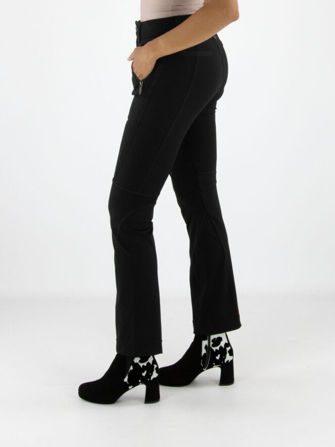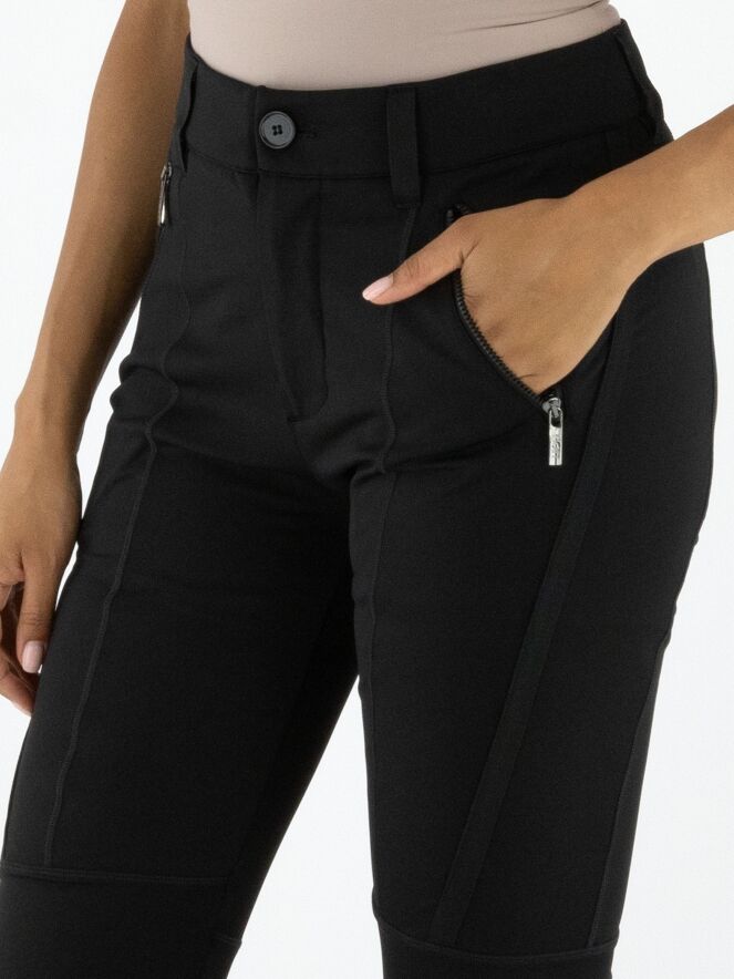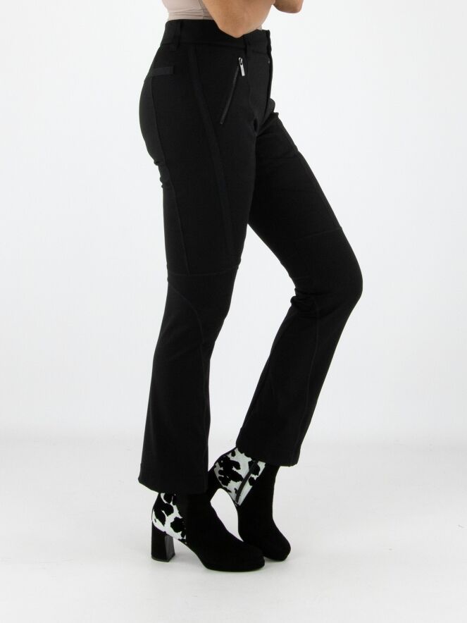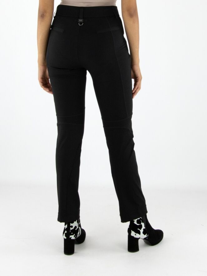Een broek van High in de kleur zwart. De zakken aan de voorzijde zijn voorzien van een ritssluiting. De broek is afgewerkt met meerdere diagonale, verticale en horizontale stiknaden en biezen. Deze broek mag met de hand worden gewassen.