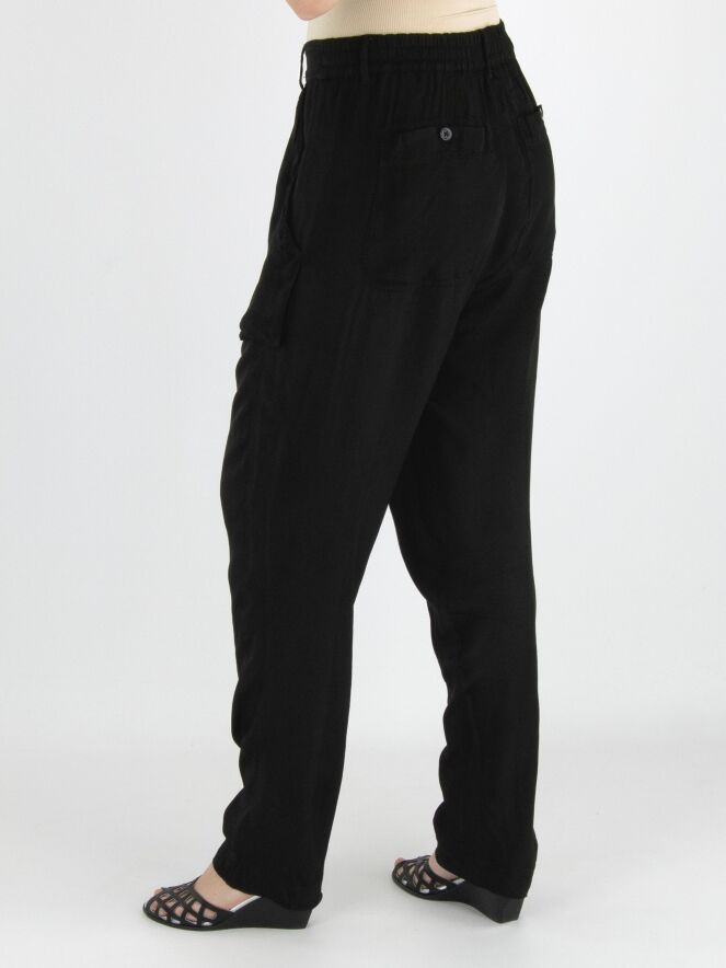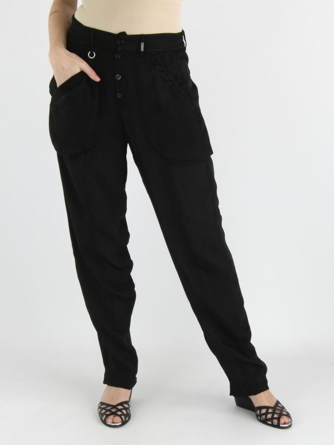 Een mat satijnen broek van High in de kleur zwart. In de taille is aan de achterkant een brede fijn geribbelde elastieken band. Aan de voorzijde is een knoopsluiting. De steekzakken zijn langs de stiknaden geaccentueerd met een dubbele stof aan de onderrand. Deze broek mag op de hand worden gewassen.