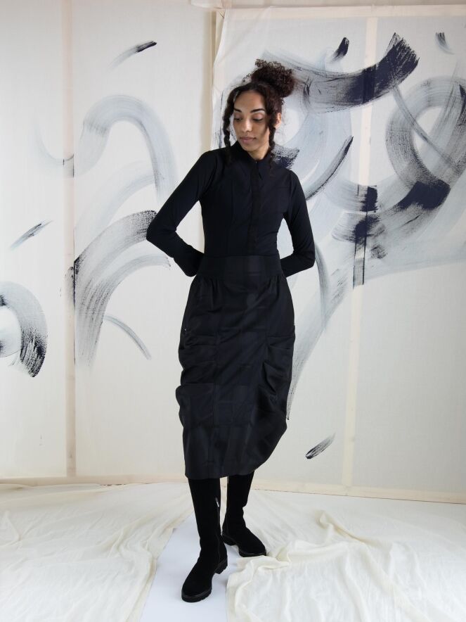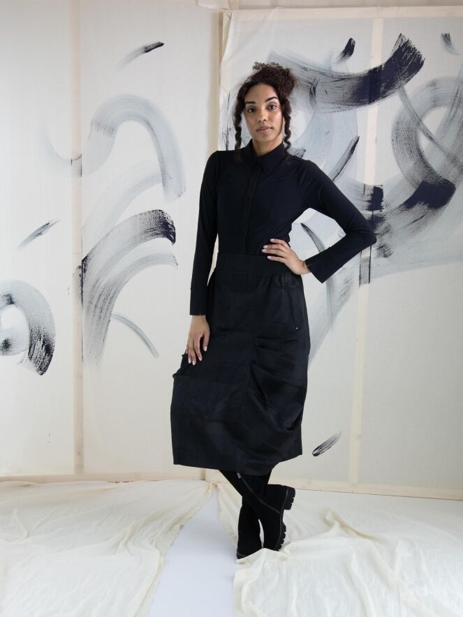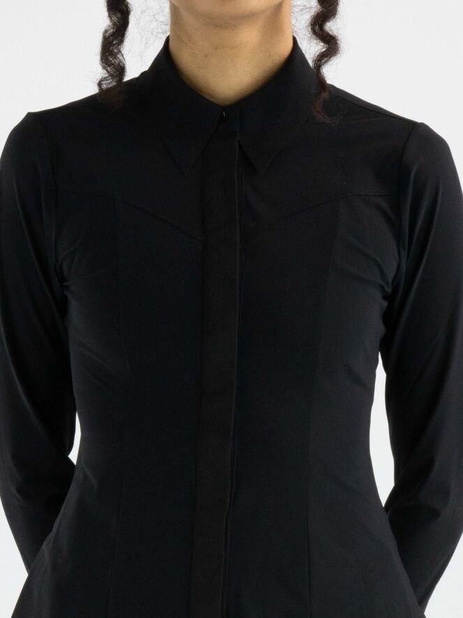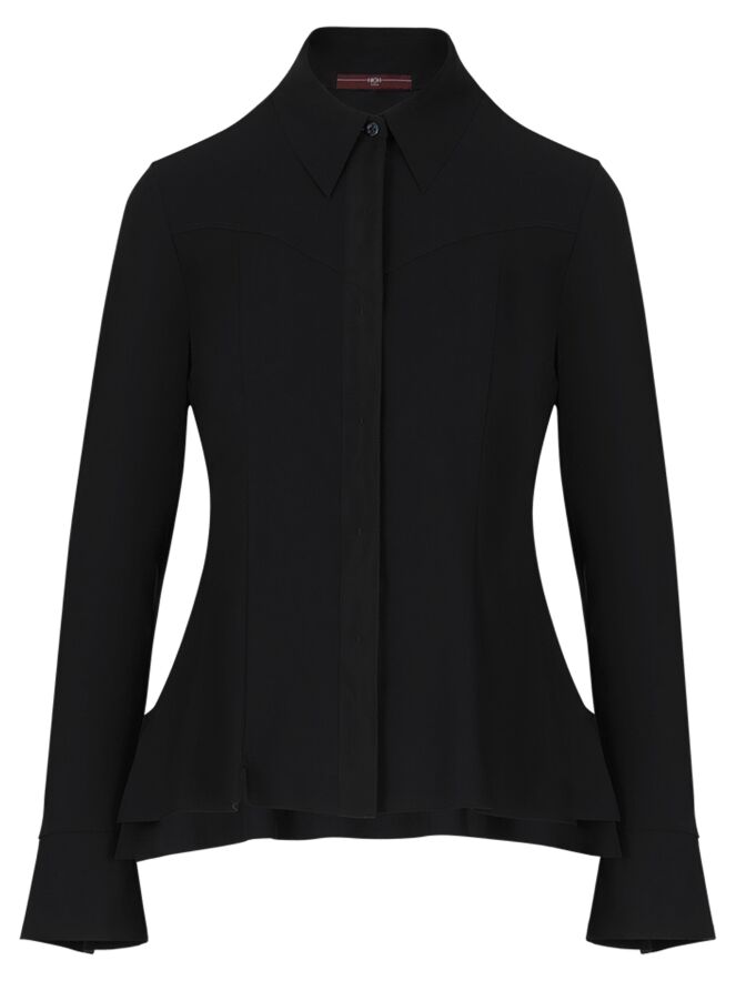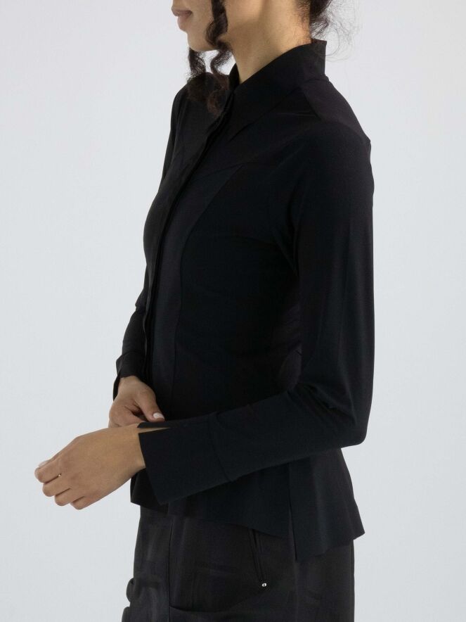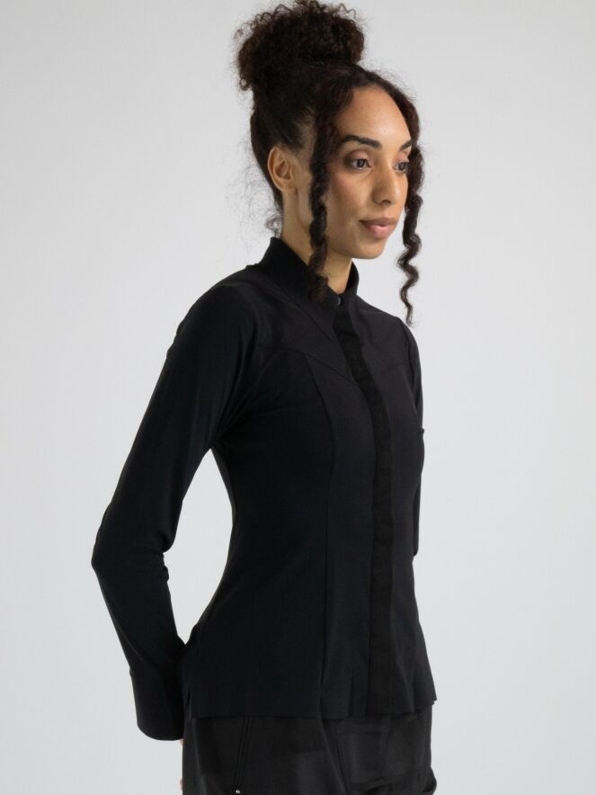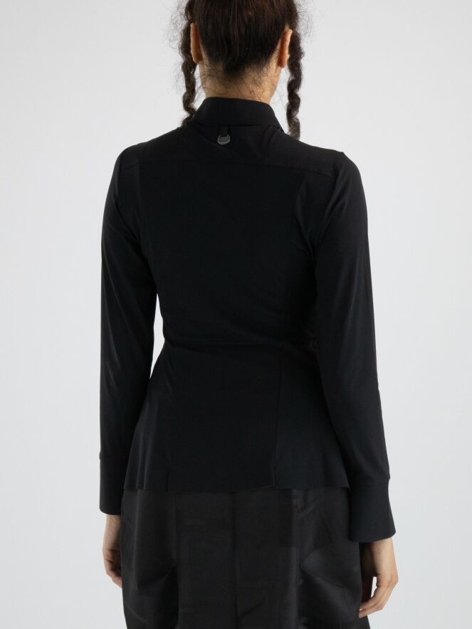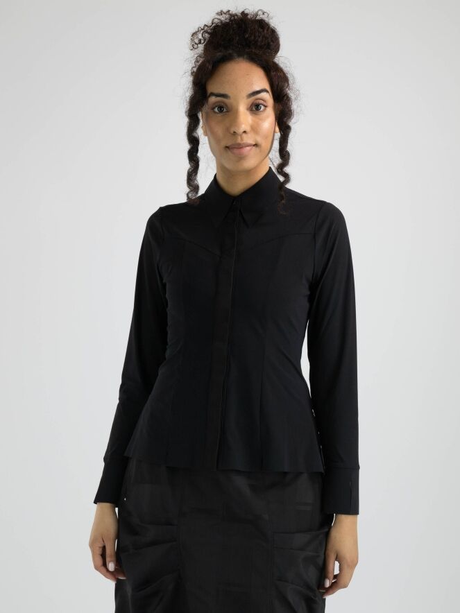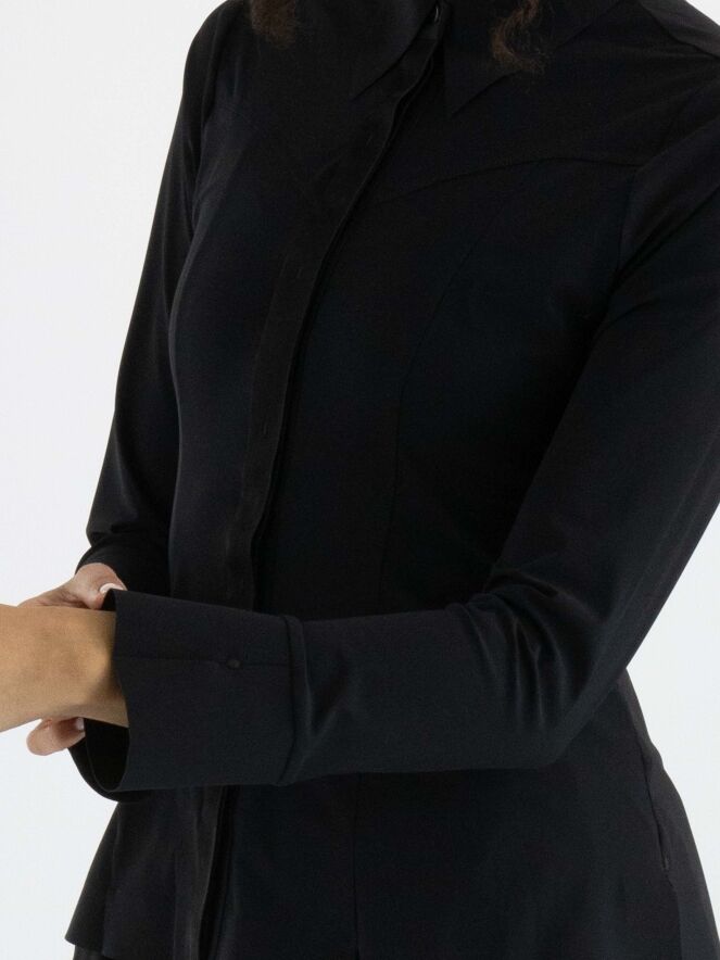Een blouse van High in de kleur zwart. De blouse loopt heel licht uiteen en aan het uiteinde van de lange mouwen is een elastische, fijne V-splitsing. Deze blouse mag op 30 graden worden gewassen.