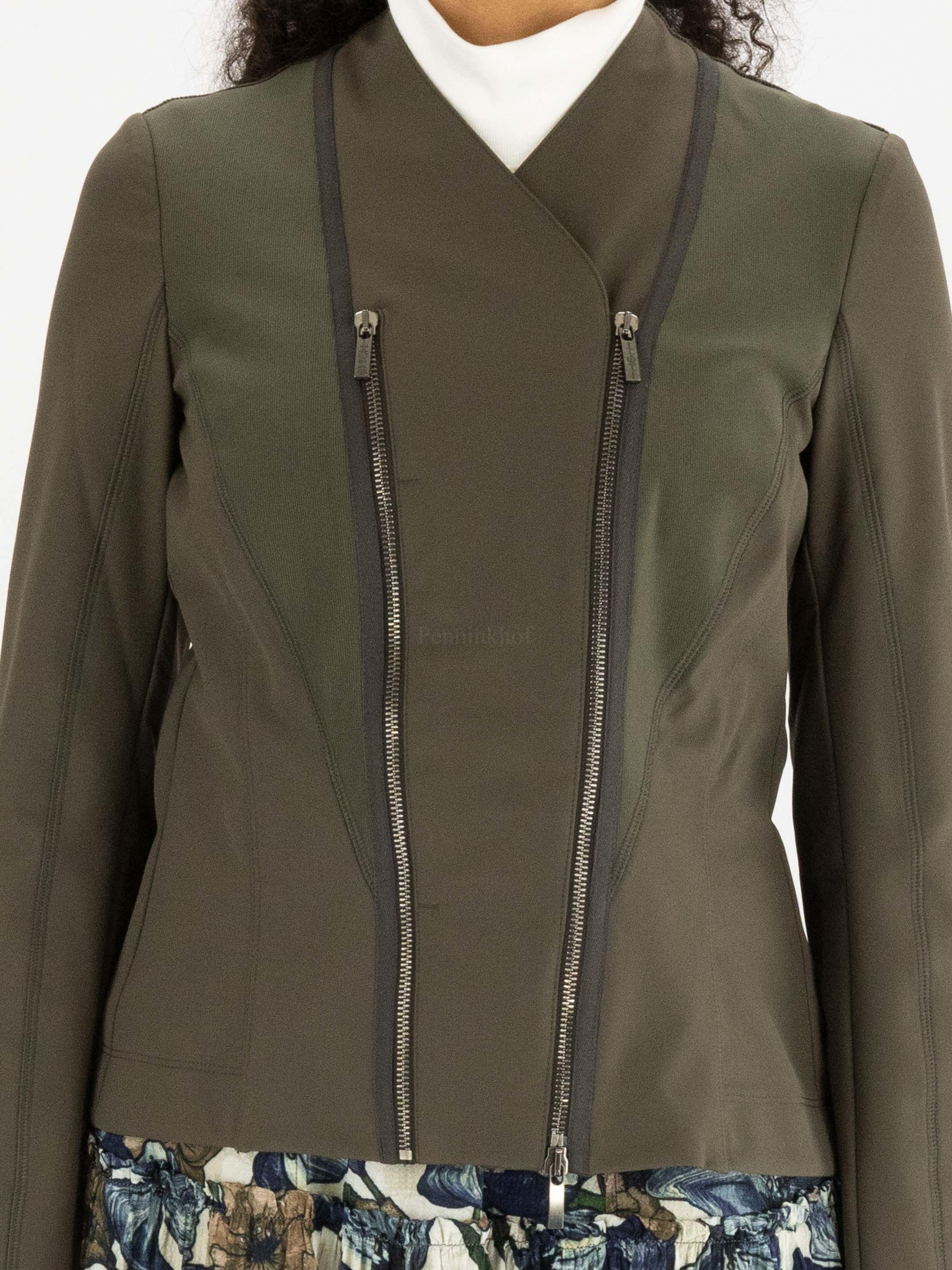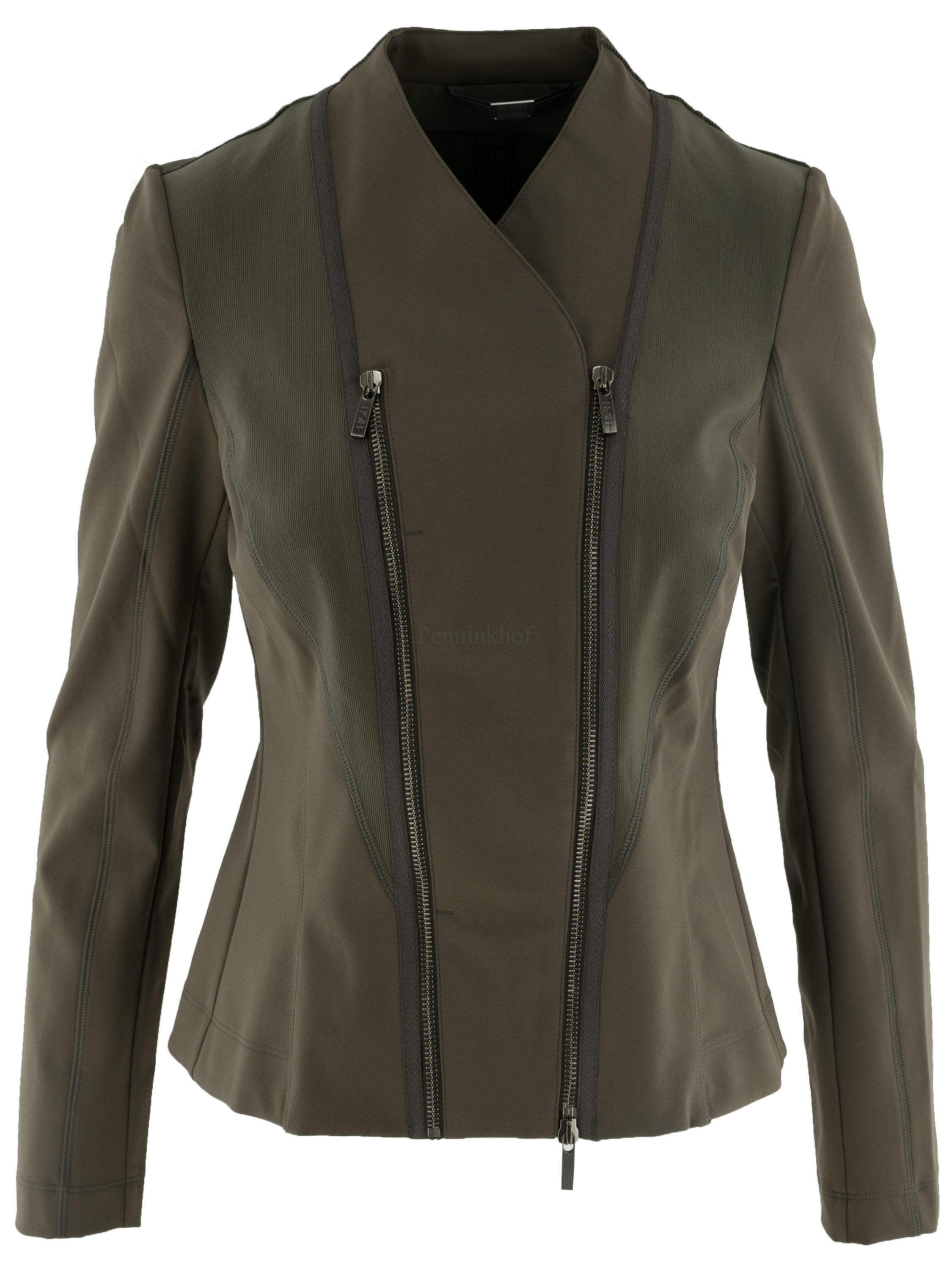 Een blazer van High in een khaki kleur. Aan de voorzijde zijn 2 ritsen waarvan één rits decoratief is en de andere rits voor de sluiting is. Vanuit de schouders is een taps lopende fijn geribbelde stof tot aan de taille. Deze blazer mag op de hand worden gewassen.