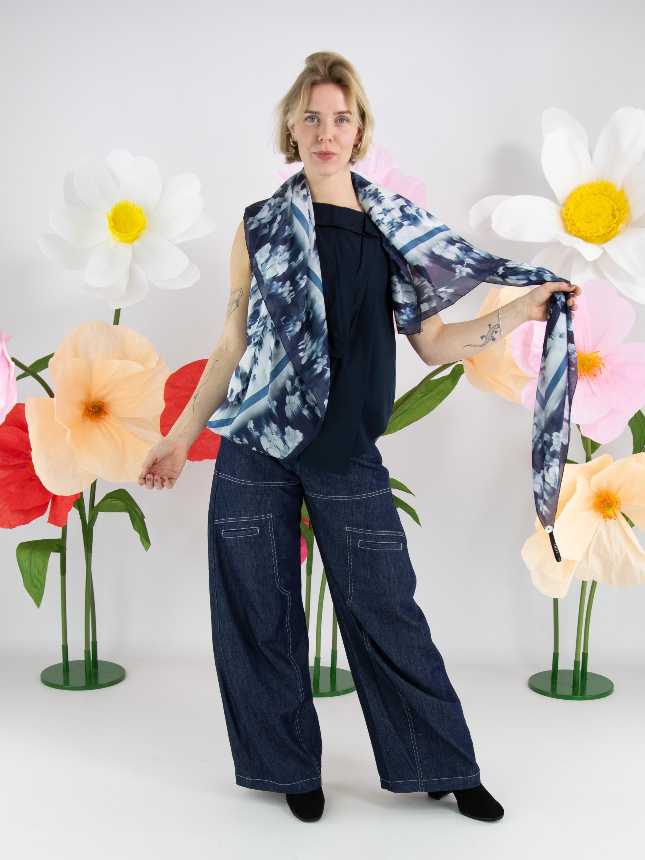 Een luxe licht transparante shawl in een geveegde bloemenprint met meerdere tinten blauw en wit. Deze shawl mag niet worden gewassen.