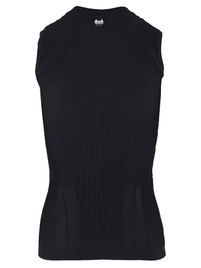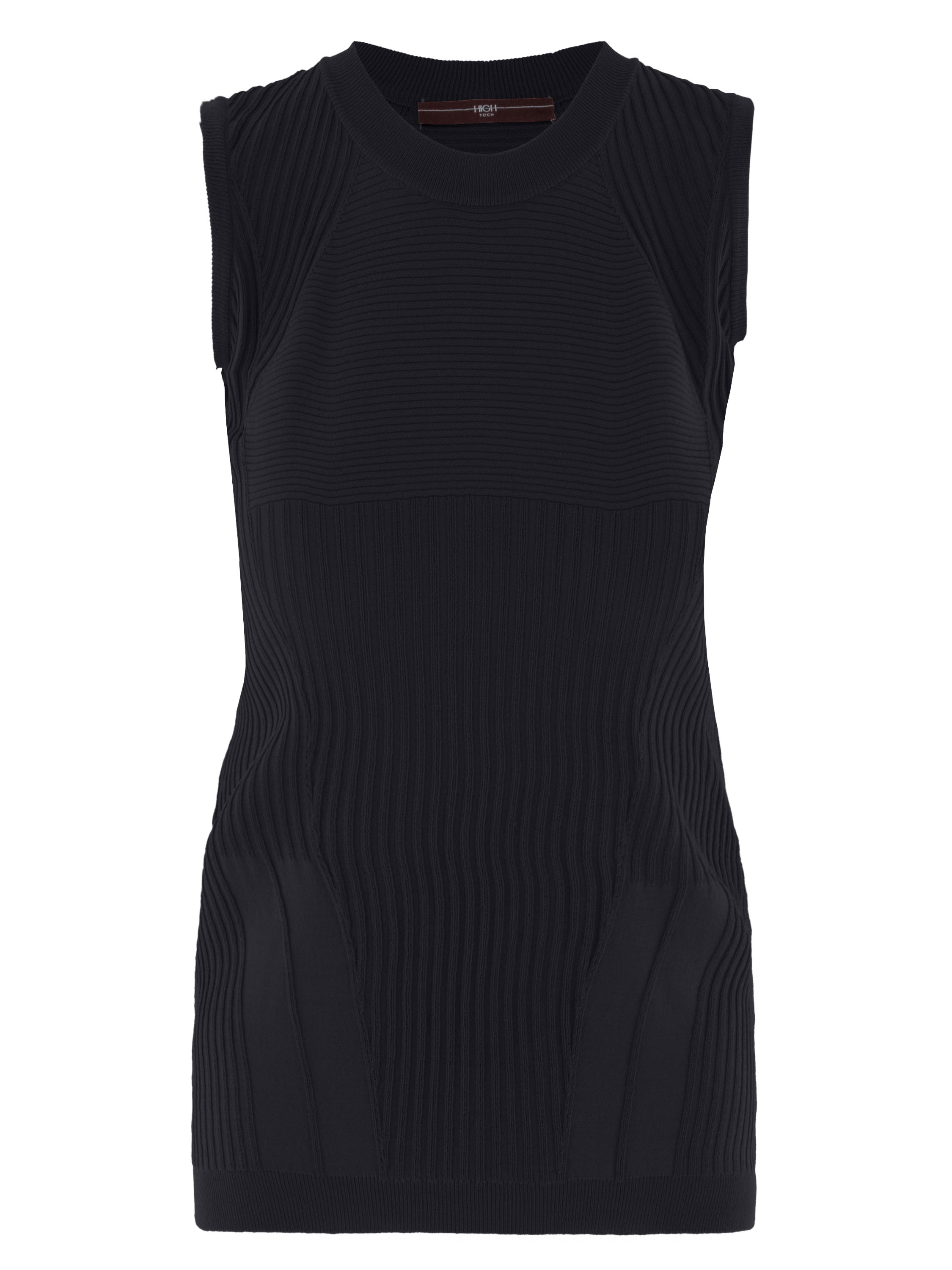 Een top van High in de kleur marineblauw. De top heeft een structuur van strepen die zowel horizontaal, verticaal als diagonaal lopen. Langs de rand van de ronde hals is een fijn geribbelde tricot boord. Deze top mag op de hand worden gewassen.