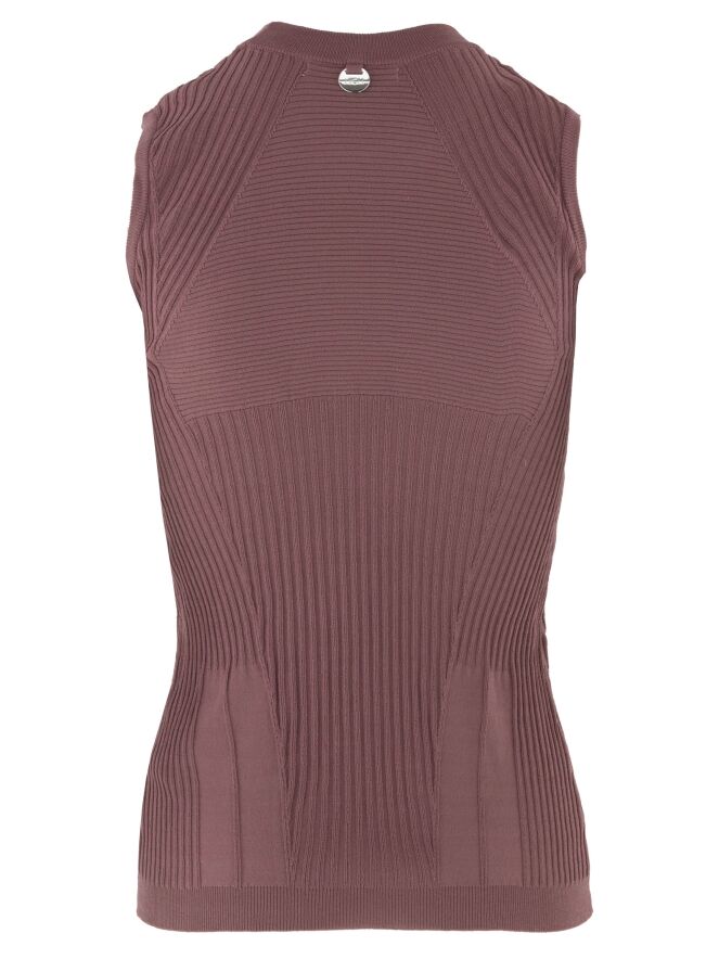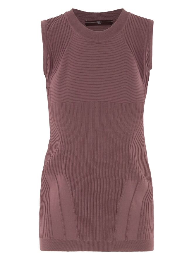Een top van High in de kleur framboosrood. De top heeft een structuur van strepen die zowel horizontaal, verticaal als diagonaal lopen. Langs de rand van de ronde hals is een fijn geribbelde tricot boord. Deze top mag op de hand worden gewassen.