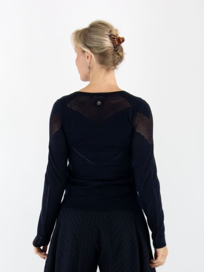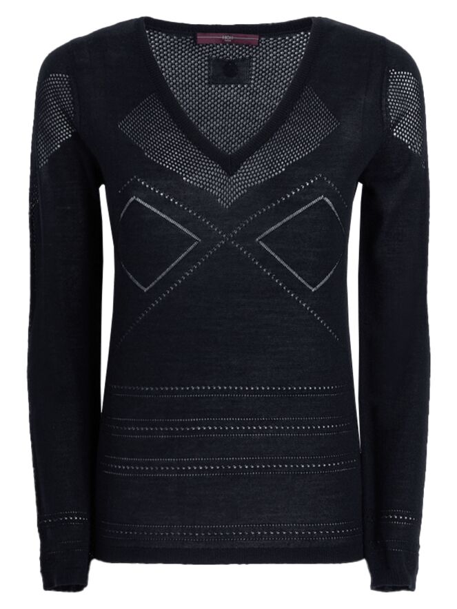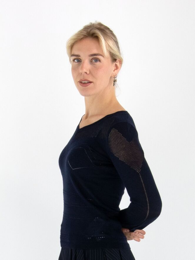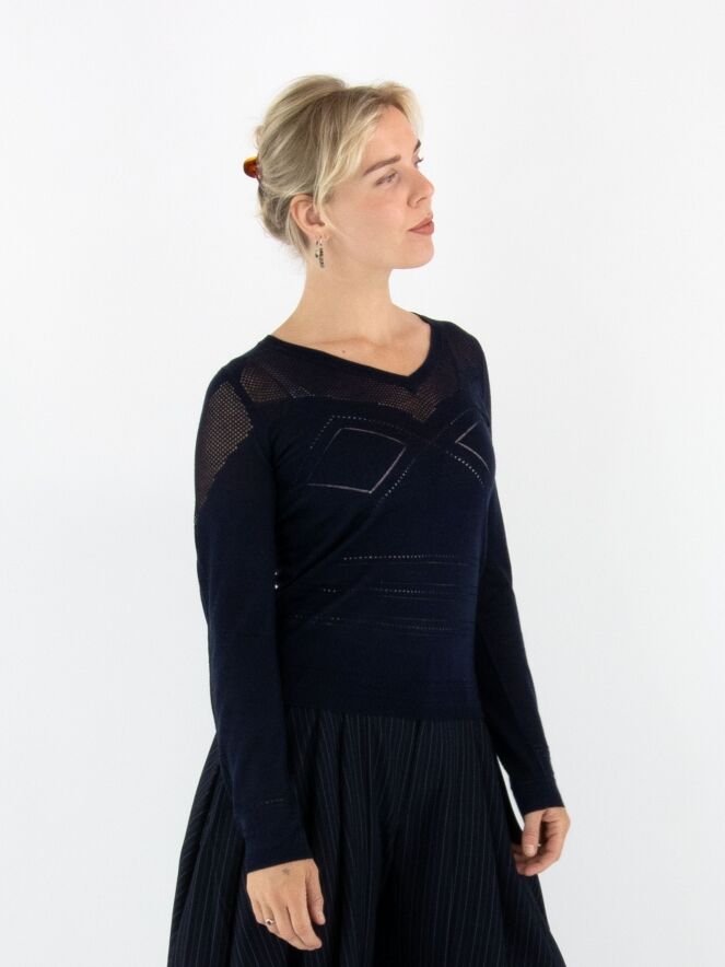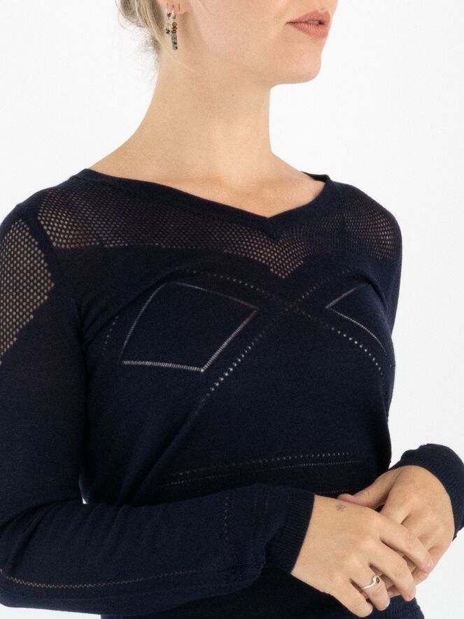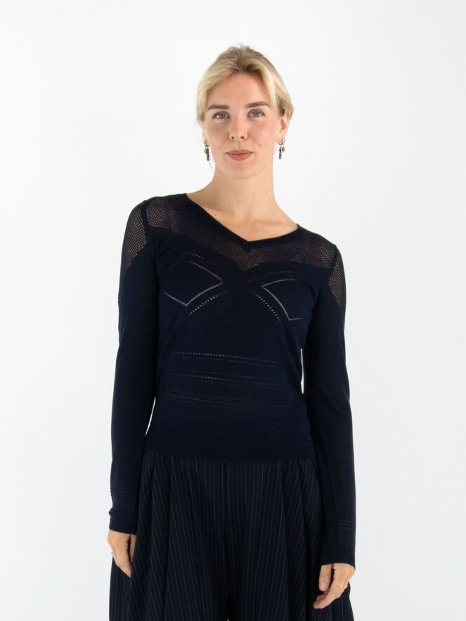 Een luxe pullover van High in de kleur marineblauw. Langs de V-hals, schouders en mouwen is de stof uitgevoerd in een transparante netstructuur. Op het voor- en achterpand zijn meerdere ajourmotieven verwerkt. Deze pullover mag met de hand worden gewassen.