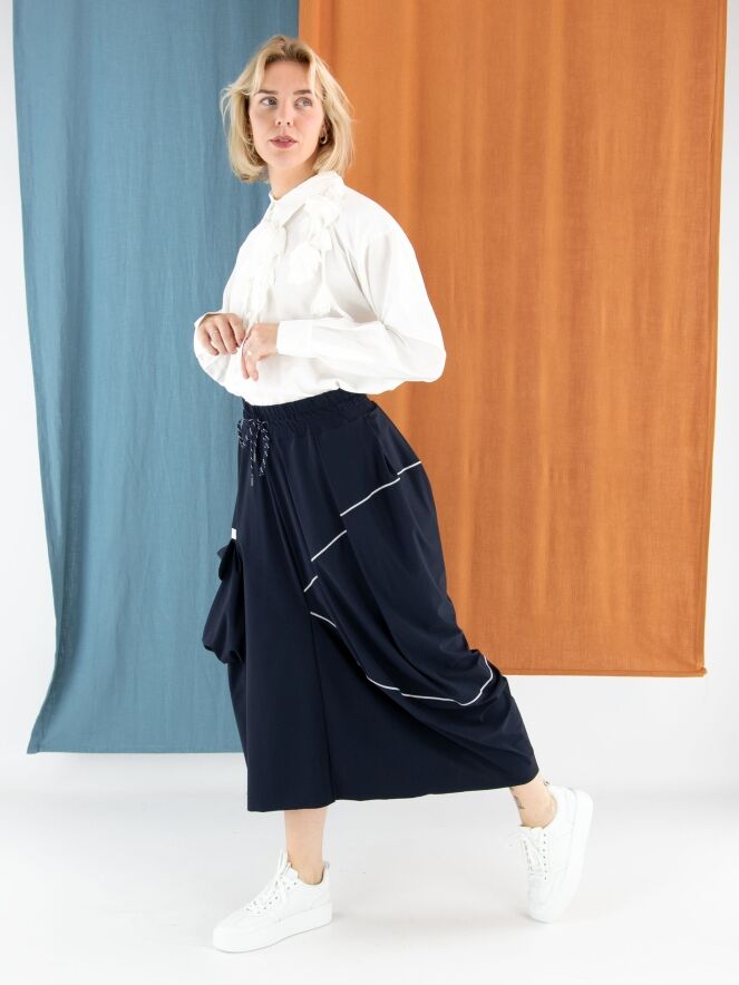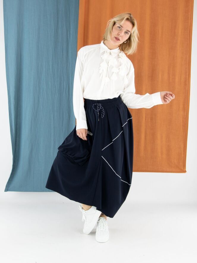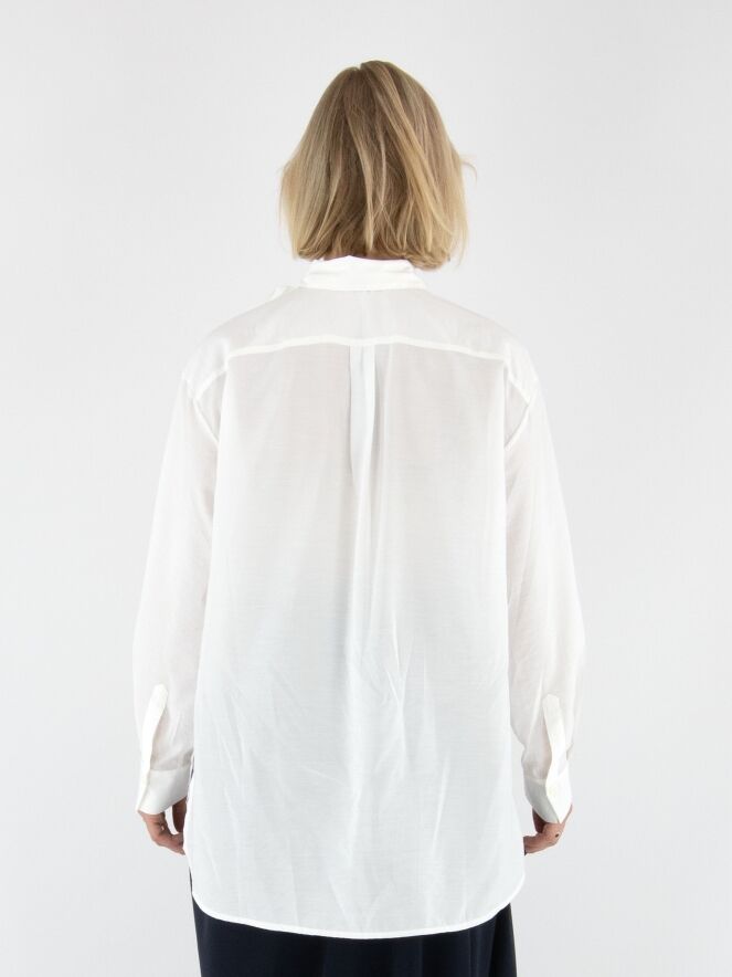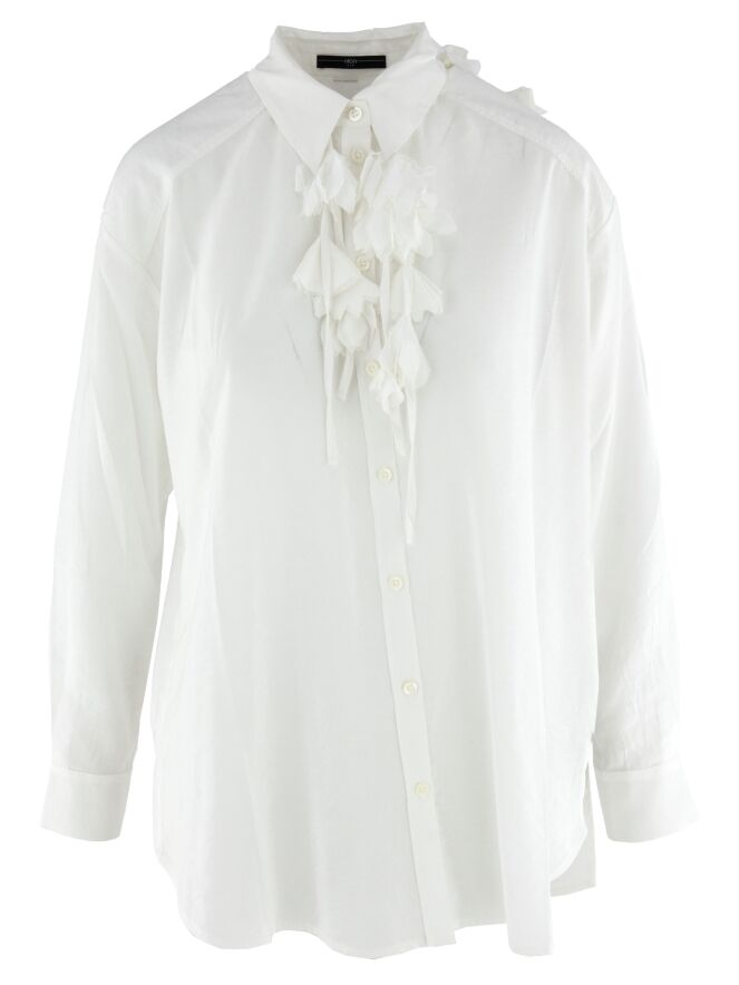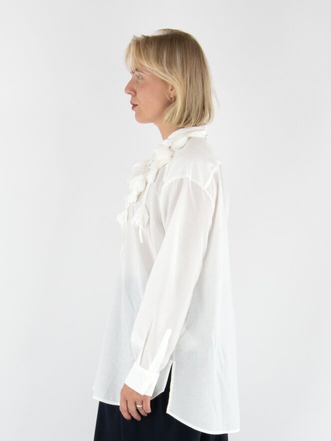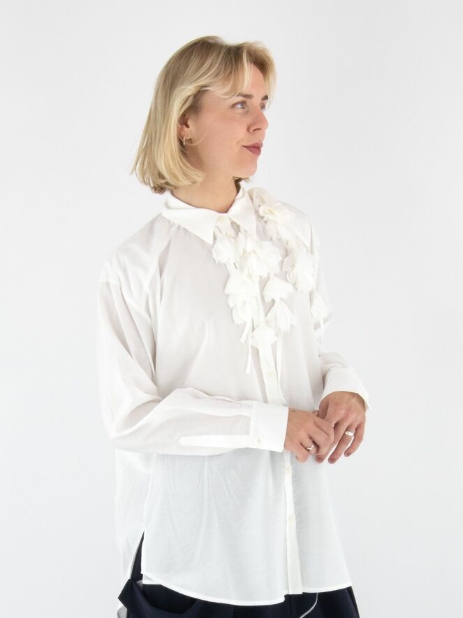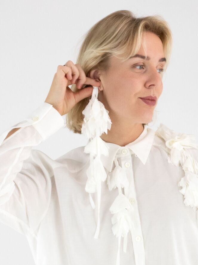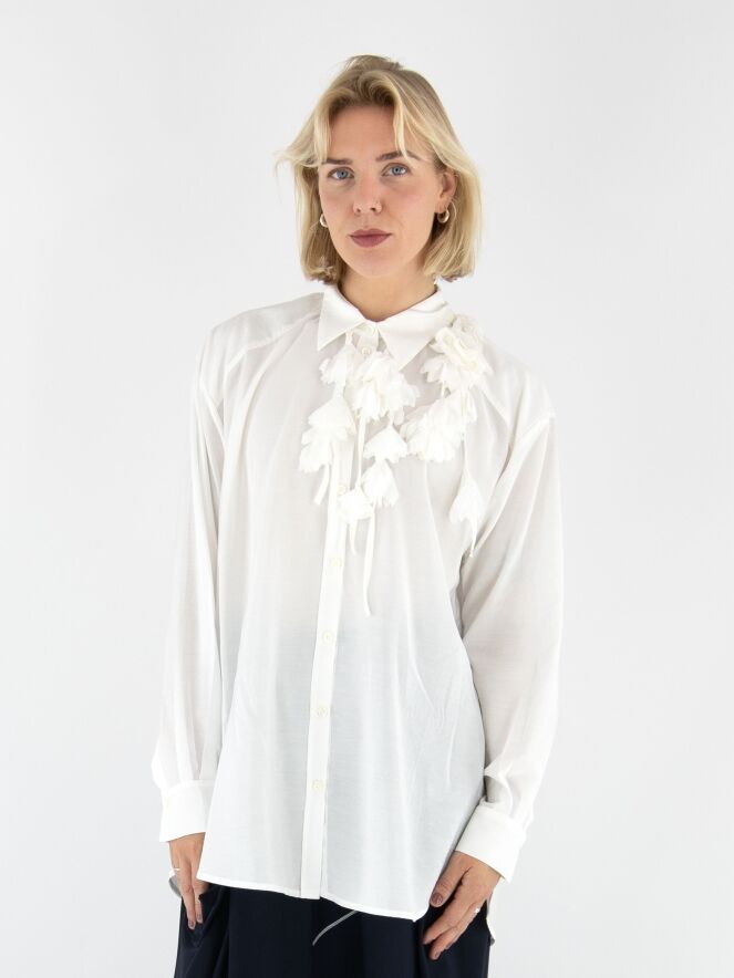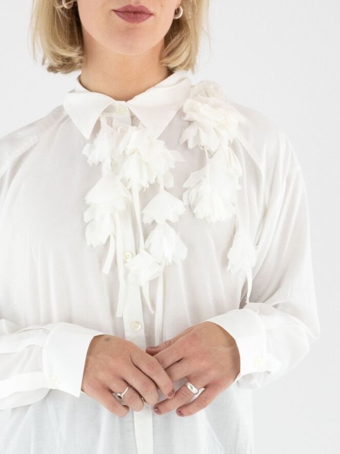 Een lange, wijde blouse van High in een matte satijnkwaliteit in de kleur roomwit. Vanuit de kraag vallen drie linten met daarin verwerkt bloemen, vervaardigd uit dezelfde stof als de blouse, wat een verfijnd en artistiek detail geeft. Deze blouse kan met de hand worden gewassen.