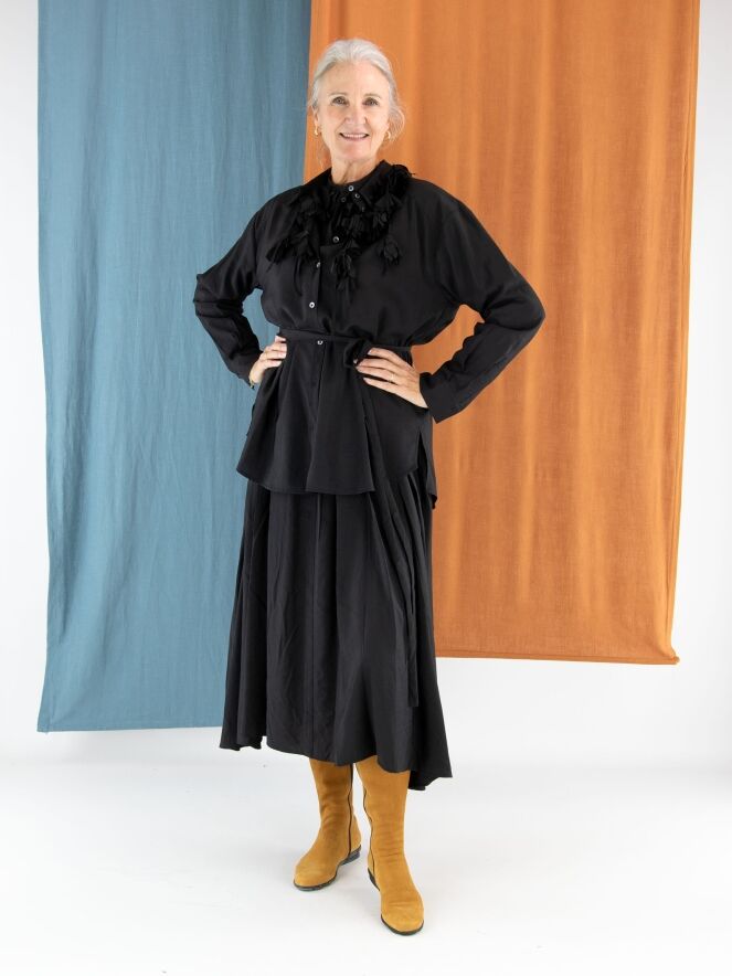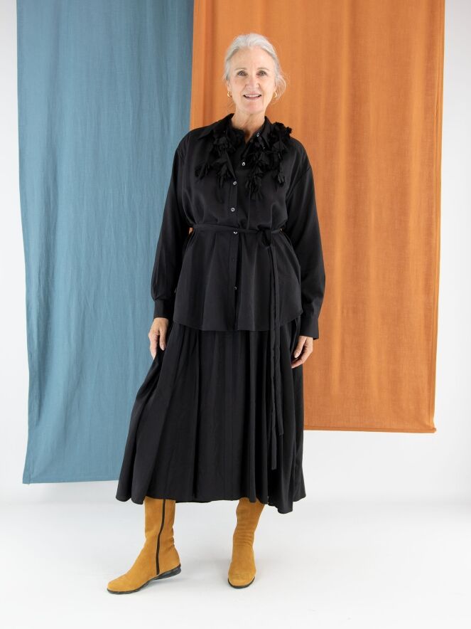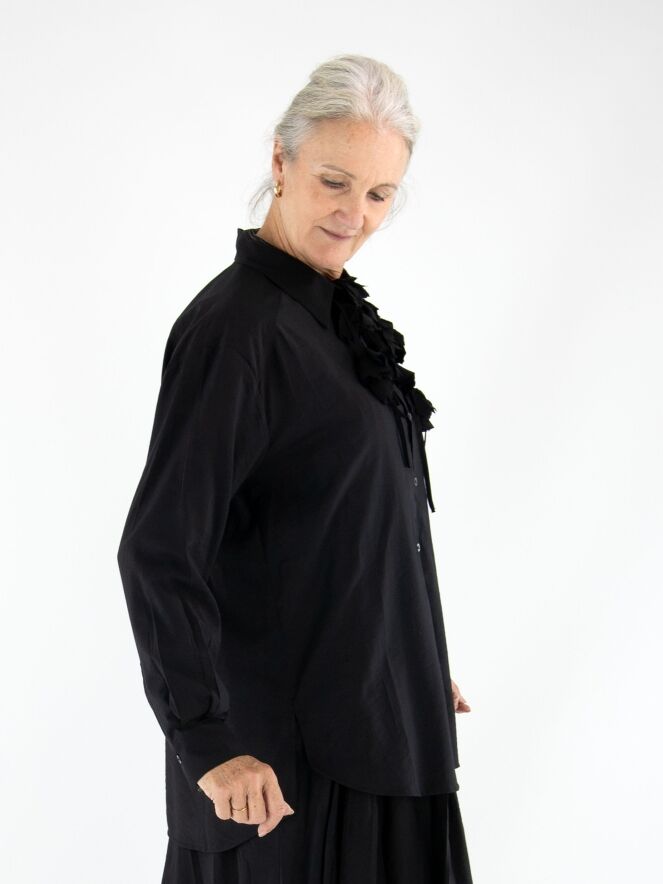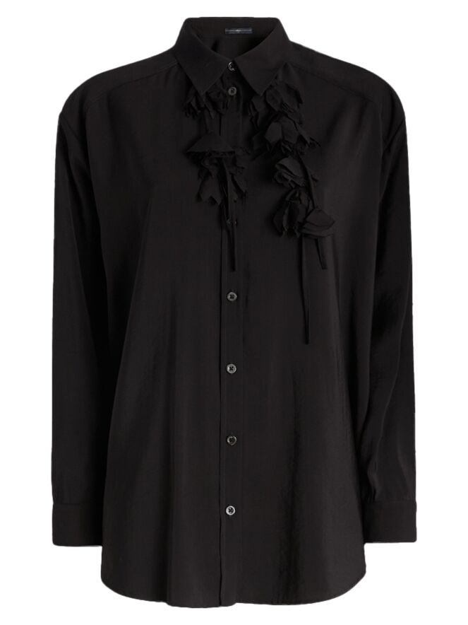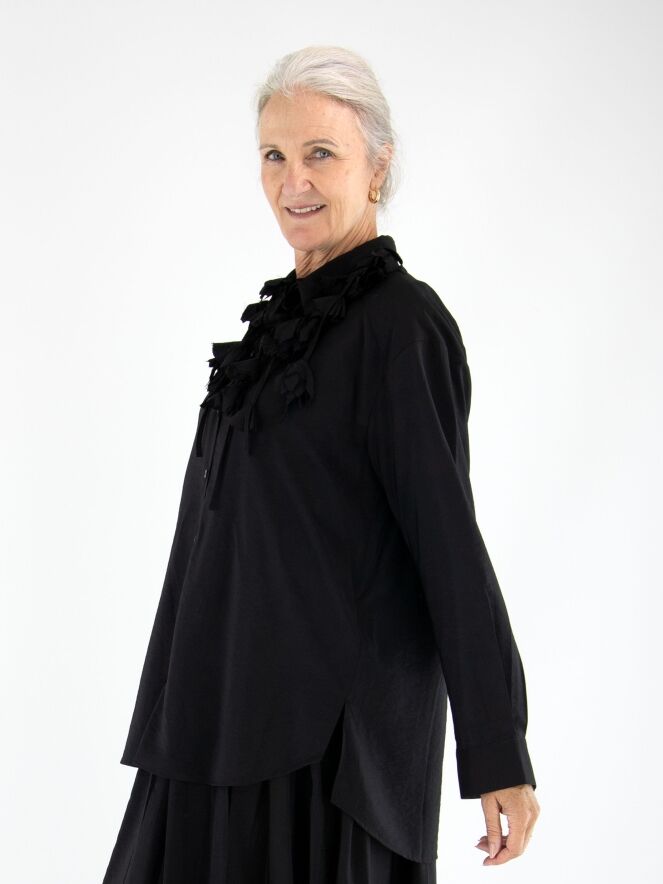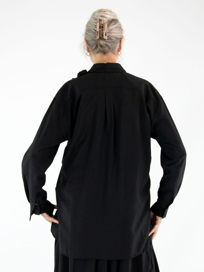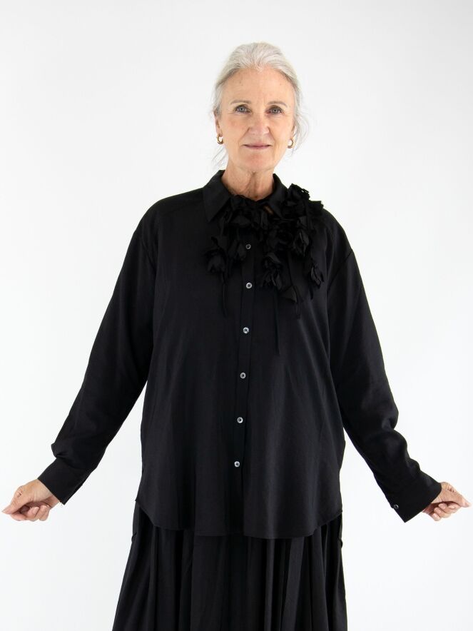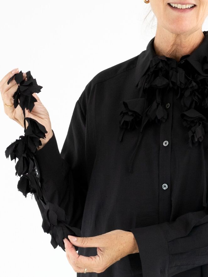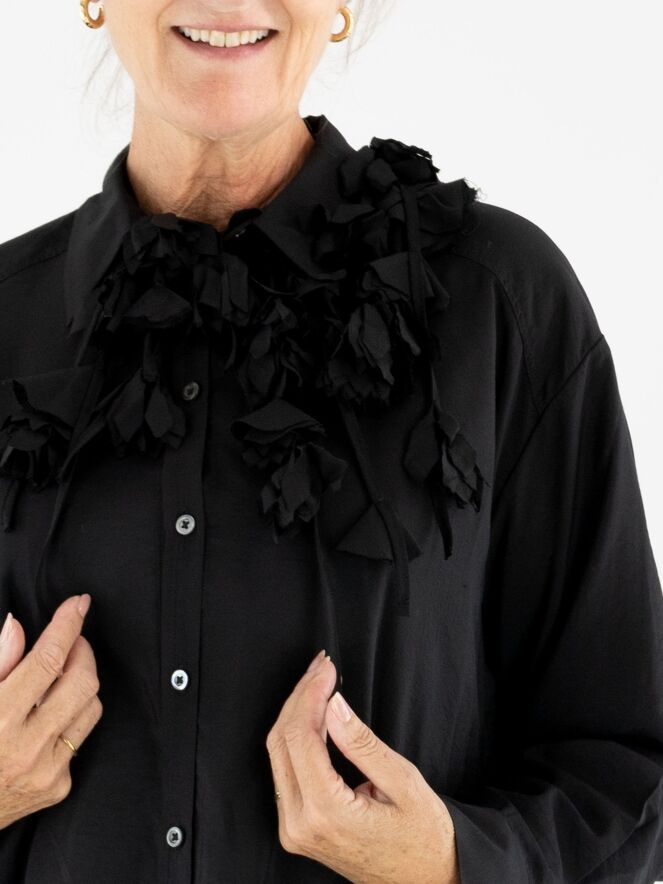 Een lange, wijde blouse van High in een matte satijnkwaliteit in de kleur zwart. Vanuit de kraag lopen drie linten, waarin bloemen zijn verwerkt die vervaardigd zijn uit dezelfde stof als de blouse. Dit bijzondere detail geeft het ontwerp een artistieke en verfijnde uitstraling. De blouse kan met de hand worden gewassen.