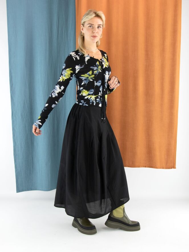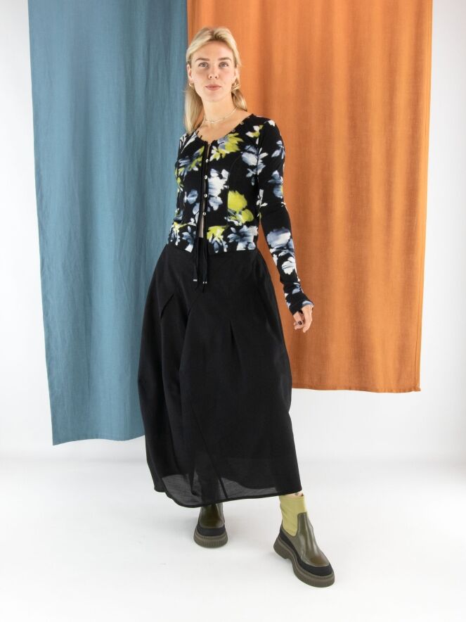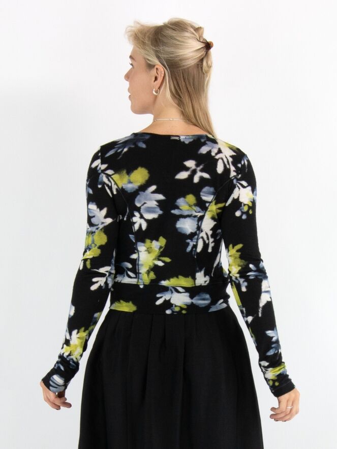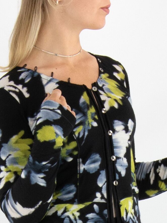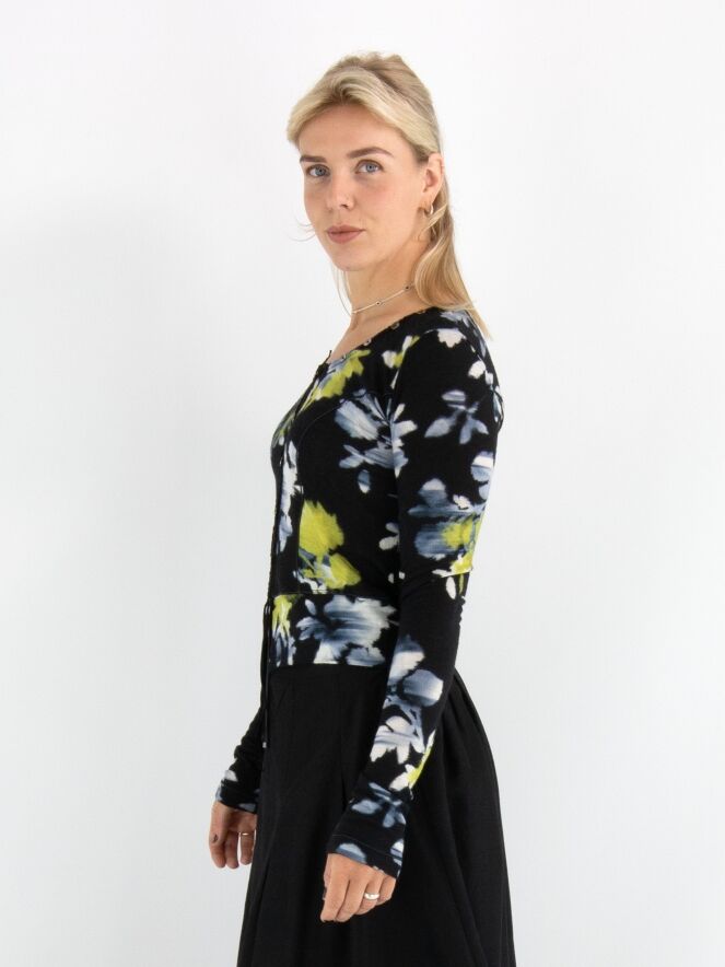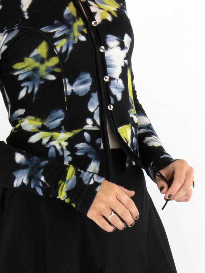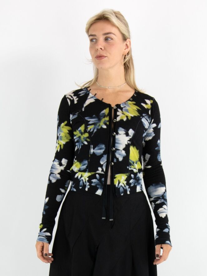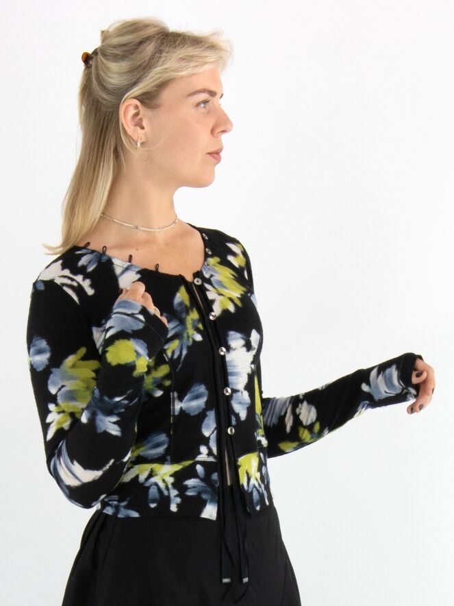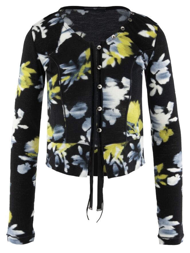 Een vest van High in een grafische bloemenprint met de kleuren geel, wit en lichtblauw op een marineblauwe achtergrond. De knoopsluiting loopt decoratief door langs de rand van de hals. Langs de sluiting zit een fluwelen bies die aan de onderkant als twee linten doorloopt. Dit vest mag met de hand worden gewassen.